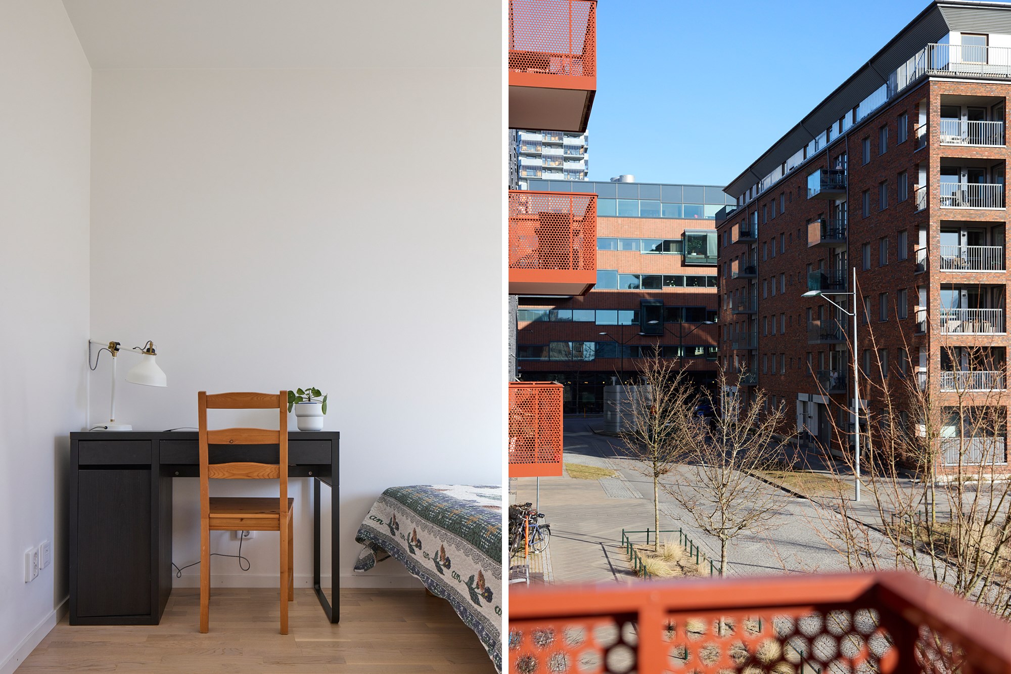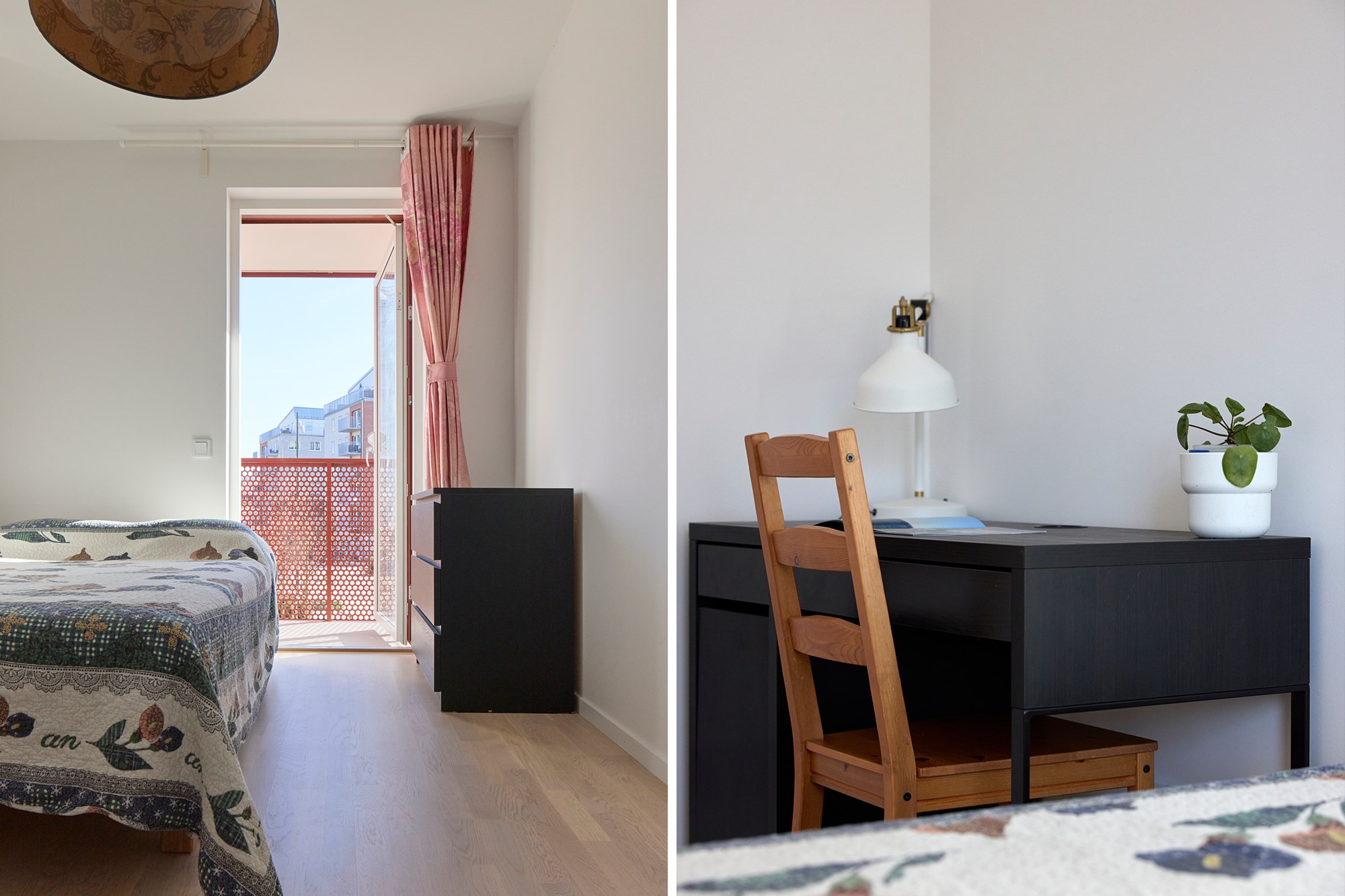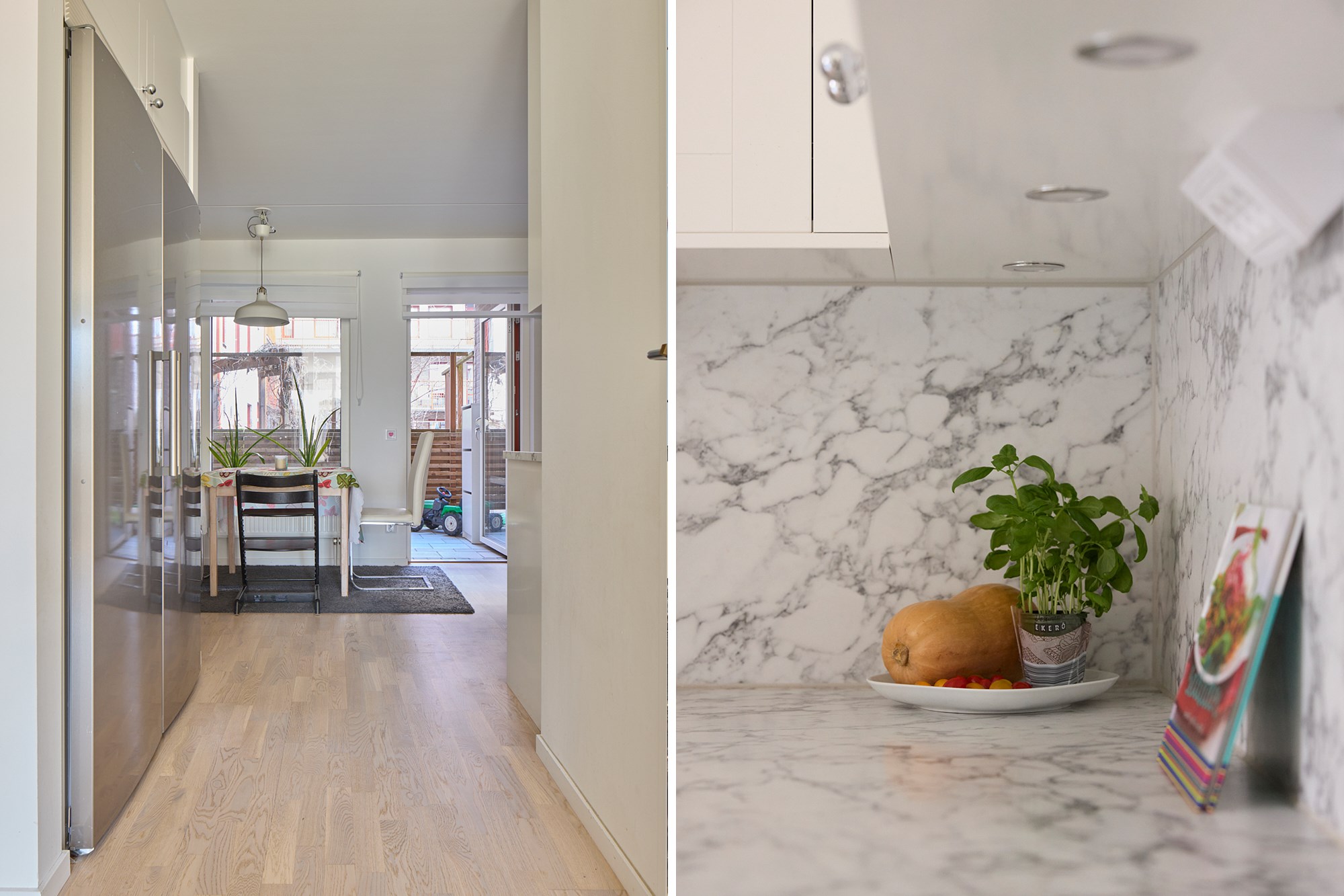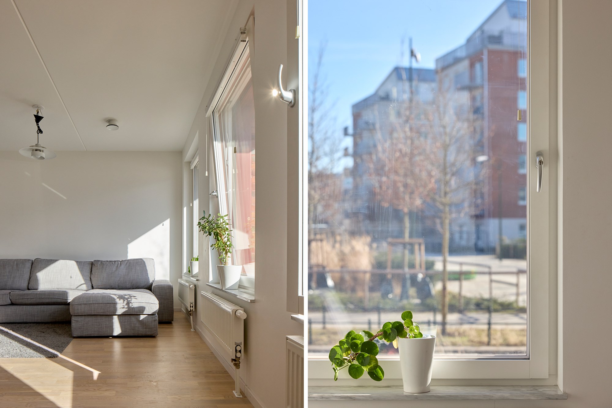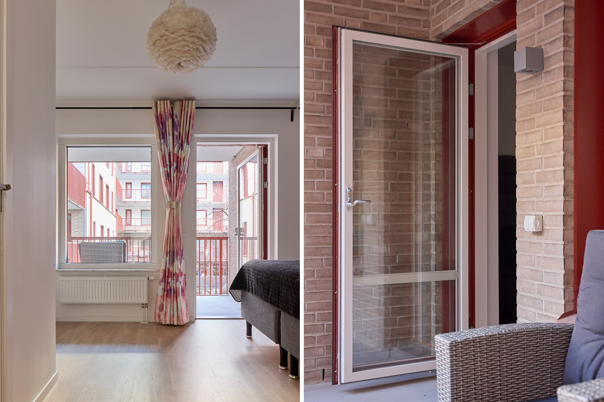 Parkettgolv och vita väggar. Utgång till balkong.