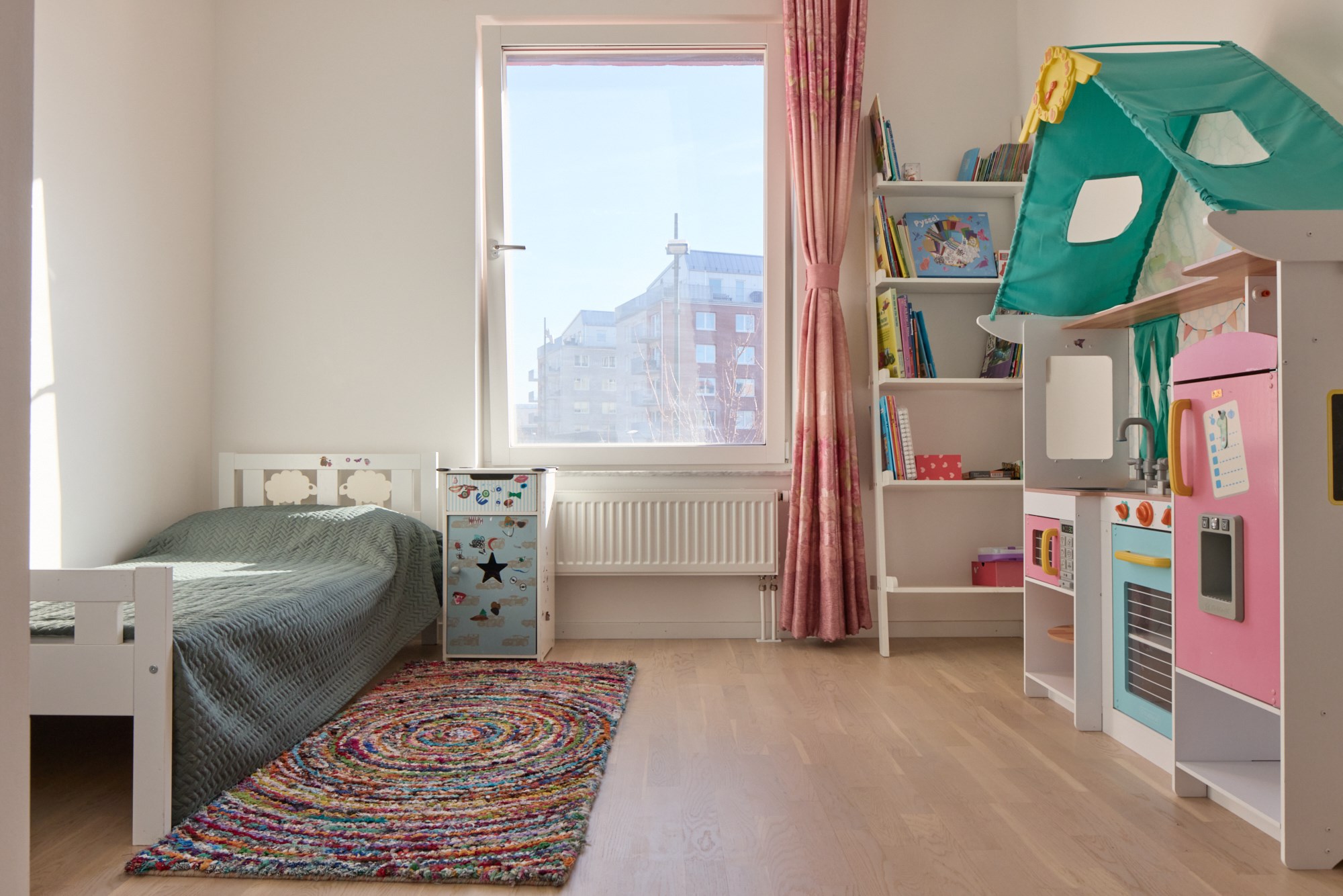 Parkettgolv och vita väggar. Garderobsförvaring.