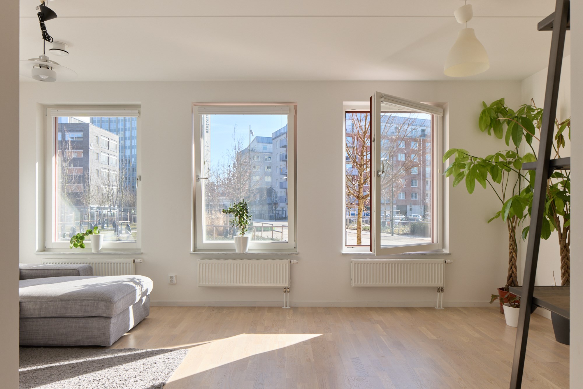 Parkettgolv och vita väggar. Plats för soffgrupp.