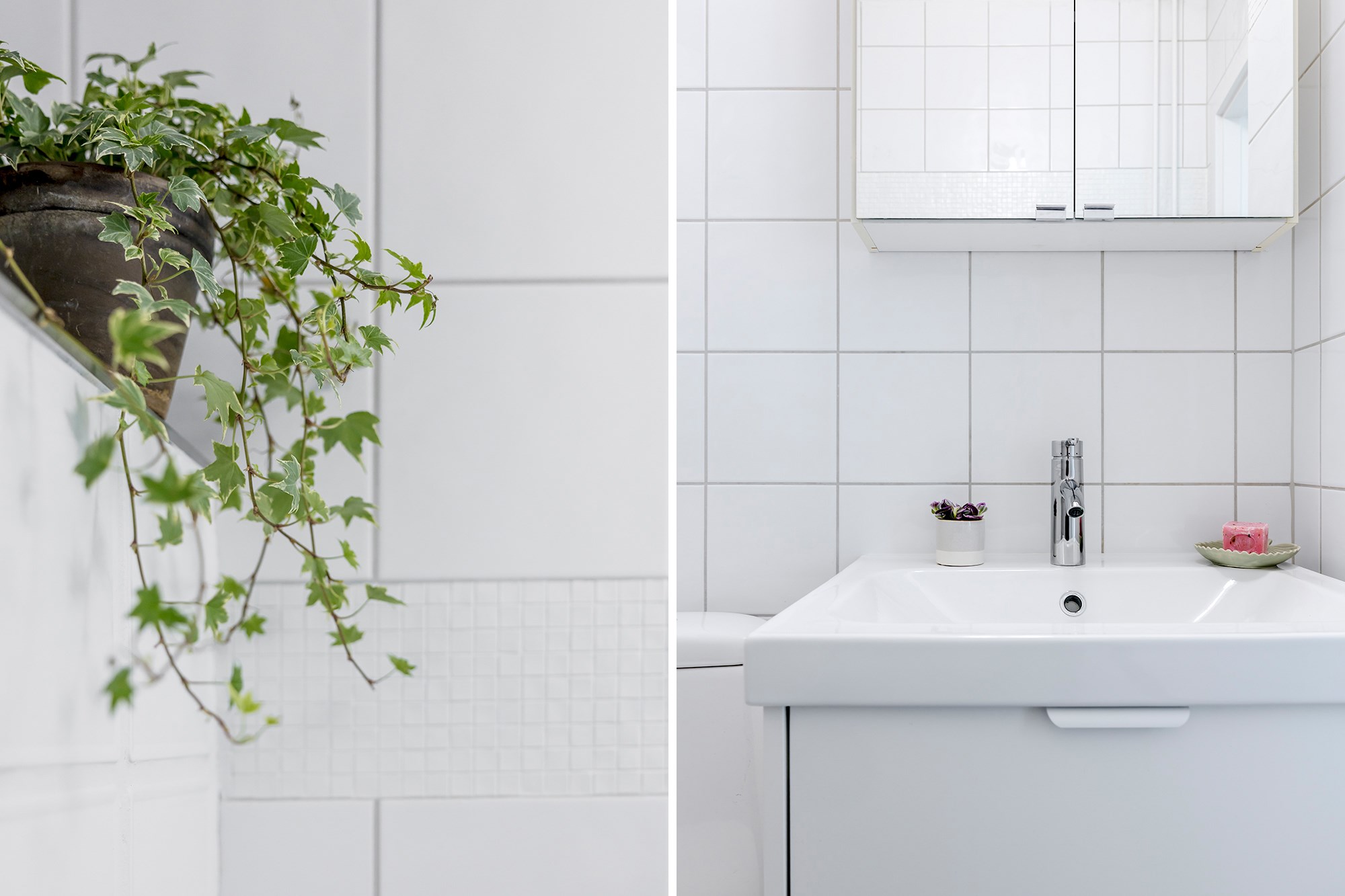 Helkaklat badrum med dusch, wc, golvvärme, handfat med kommod och spegelskåp.