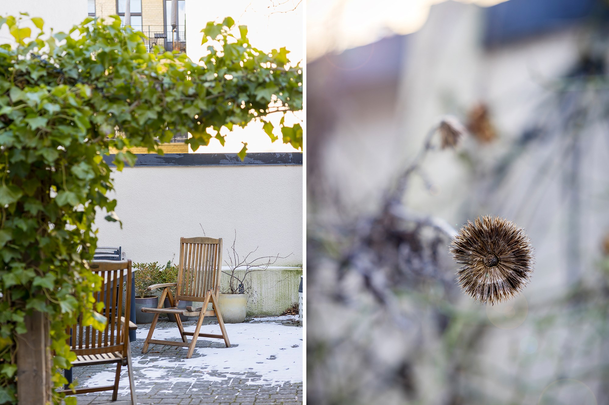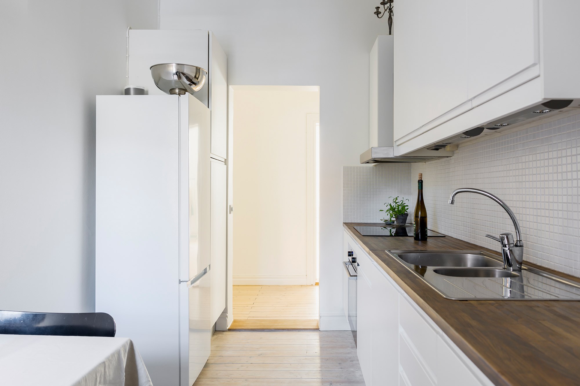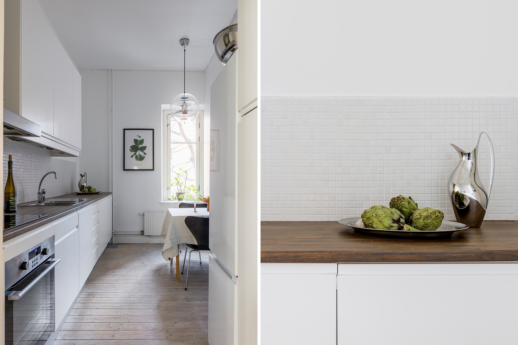 Brädgolv och ljusa väggar. Köket vetter mot den lummiga gården, med en stor lönn precis utanför fönstret. Gott om förvaring samt en stor arbetsyta med massiv bänkskiva i trä. Köket är utrustat med kyl/frys, spishäll, ugn och kolfilterfläkt. Plats för matbord och stolar.