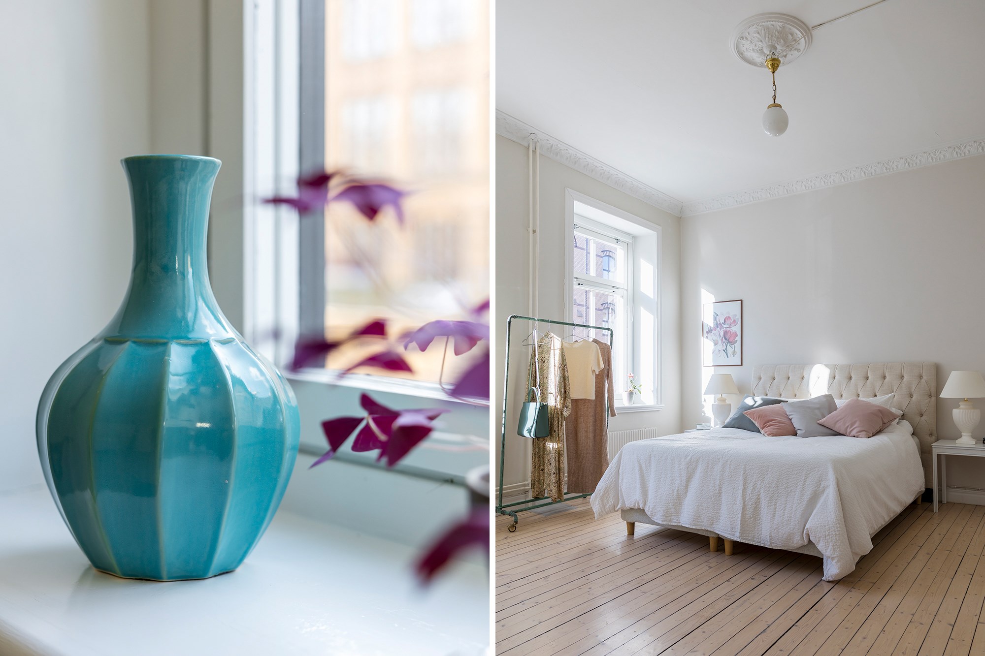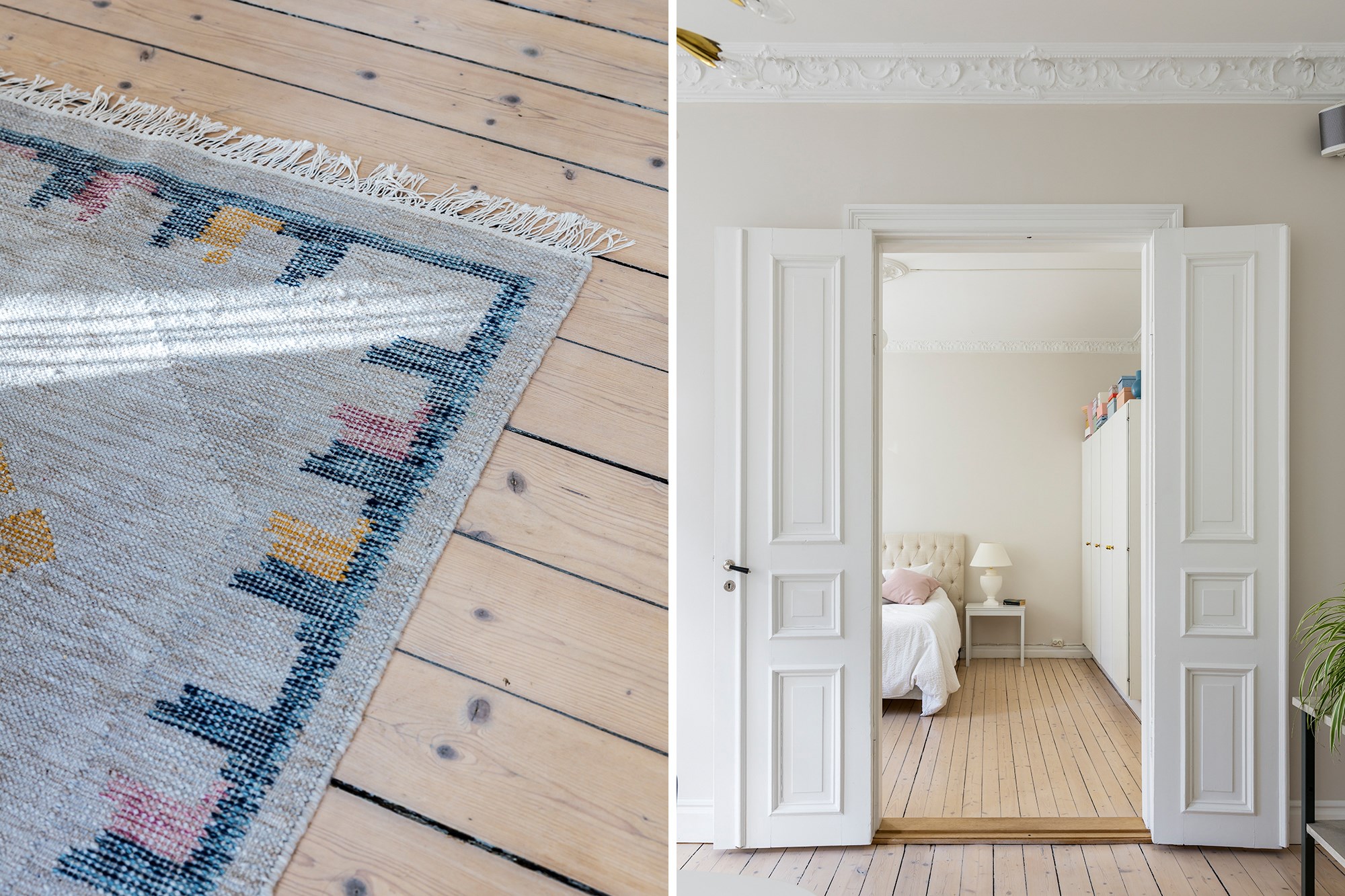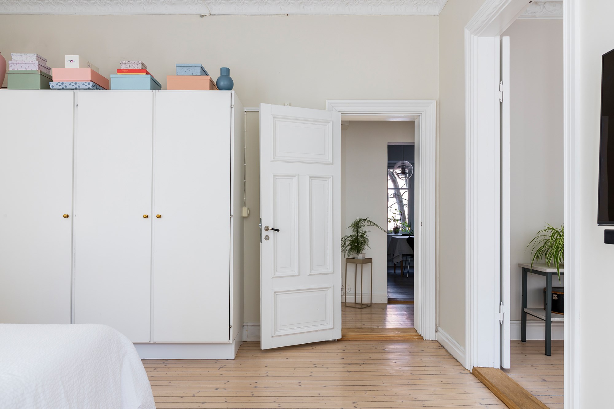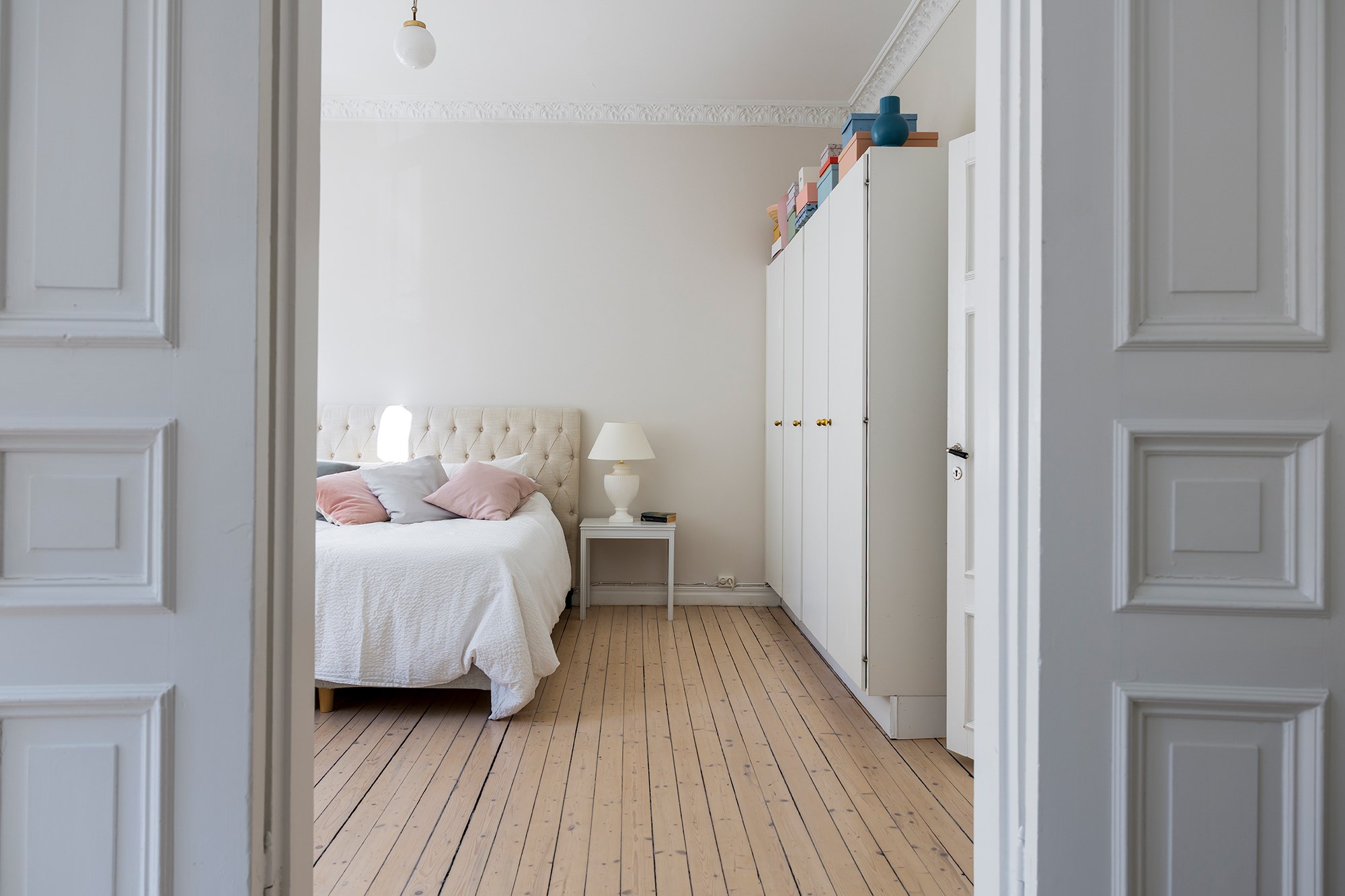 Brädgolv och ljusa väggar även här. Rummet har plats för dubbelsäng, skrivbord och garderober och präglas av tidstypiska detaljer som stuckaturer och takrosett.