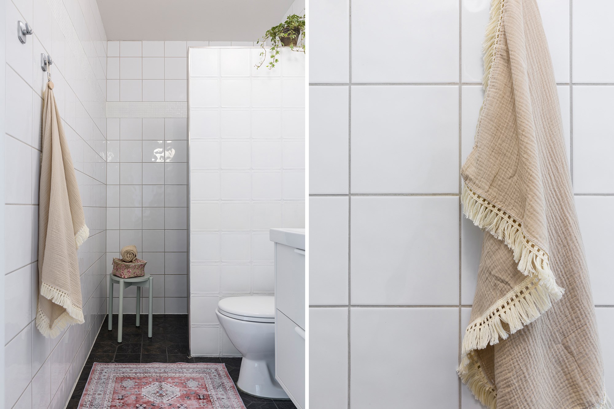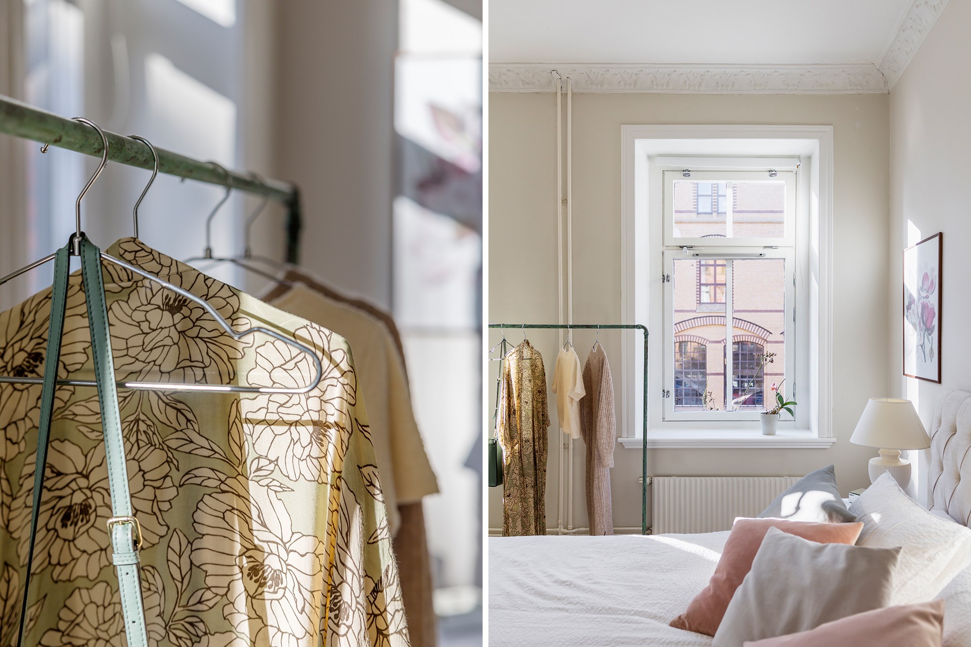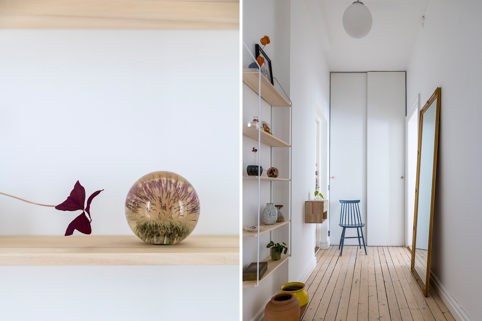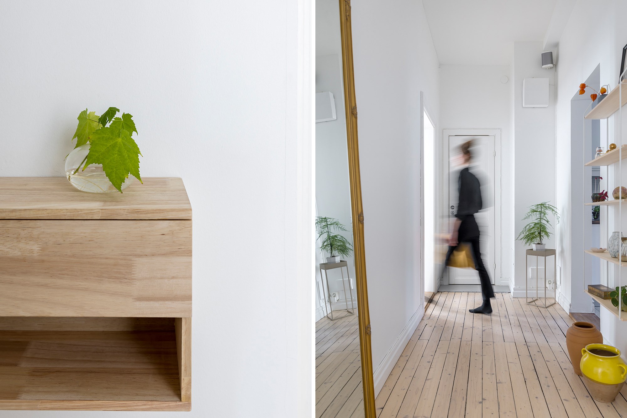 Brädgolv och ljusa väggar som sätter tonen direkt när man kliver in. Till vänster finns en inbyggd garderob som ger praktisk förvaring och god plats för avhängning.