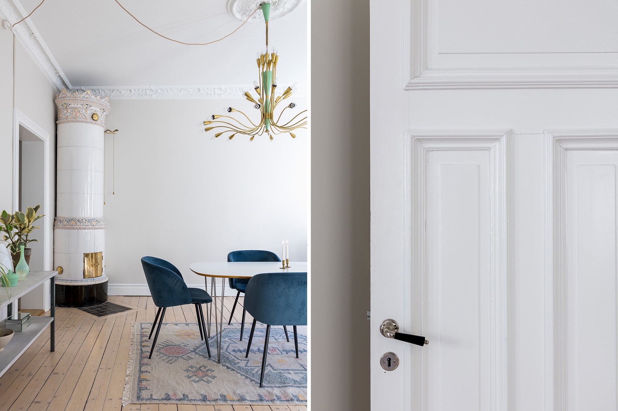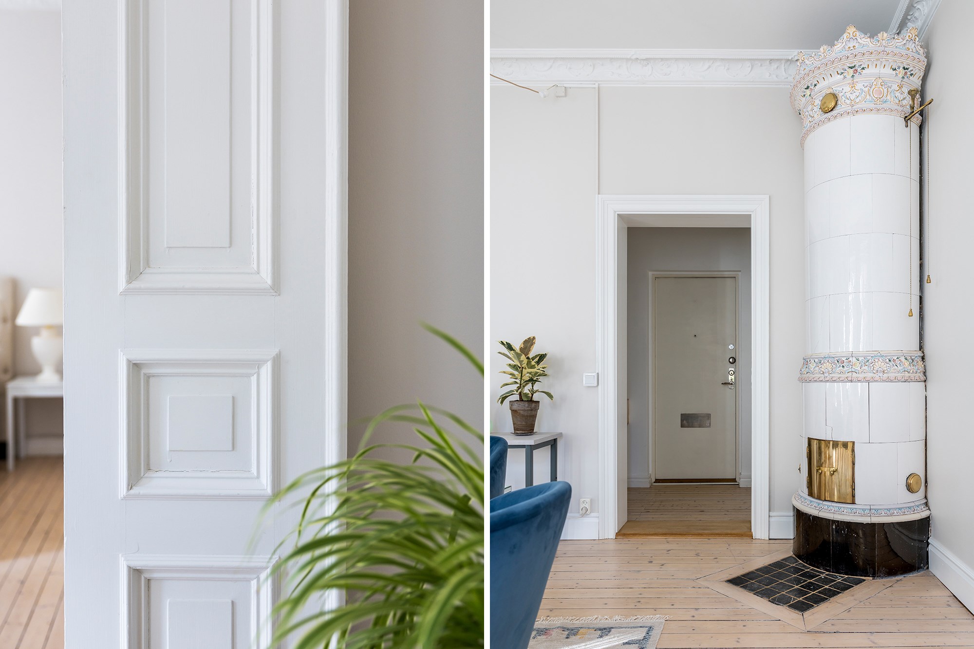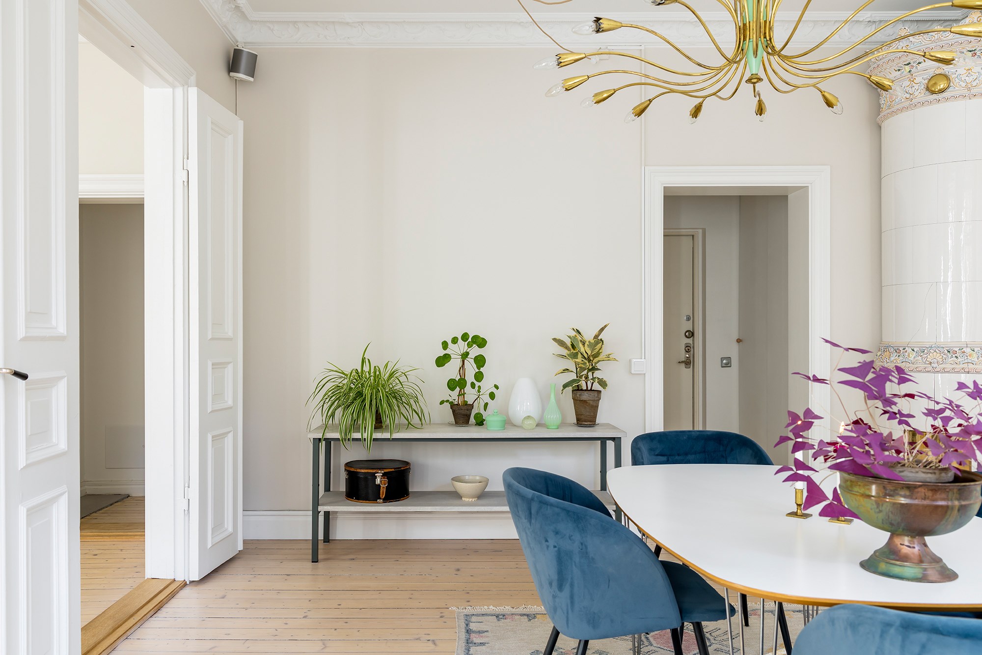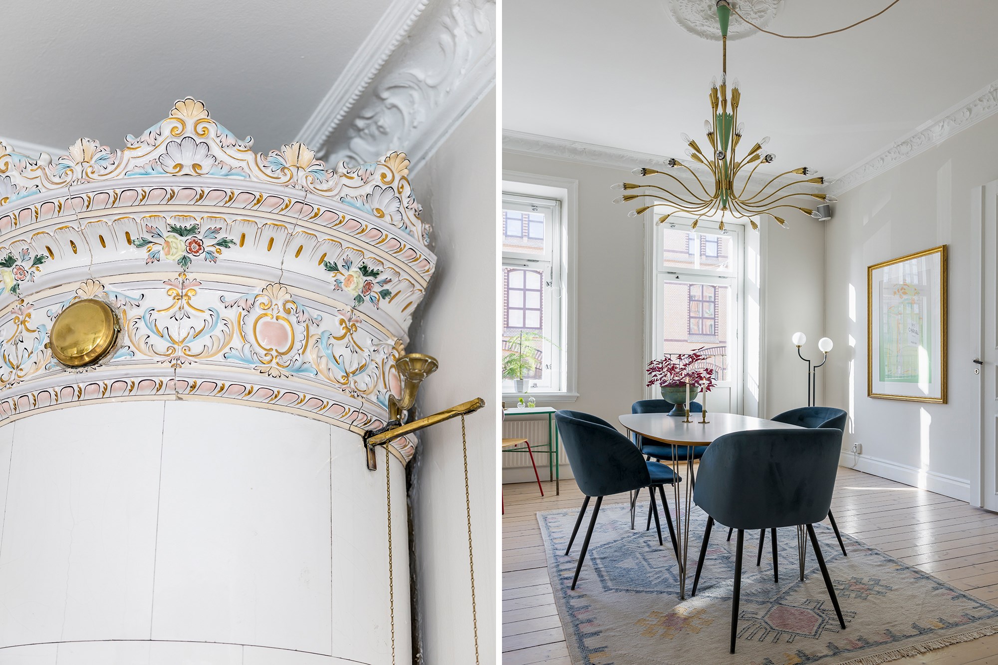 Brädgolv och ljusa väggar ger rummet en luftig känsla. Fönster och fransk balkong släpper in gott om ljus. Kakelugn, stuckaturer och takrosett ger rummet sin tydliga sekelskifteskaraktär. Här finns plats för både soffhörna och matbord.
