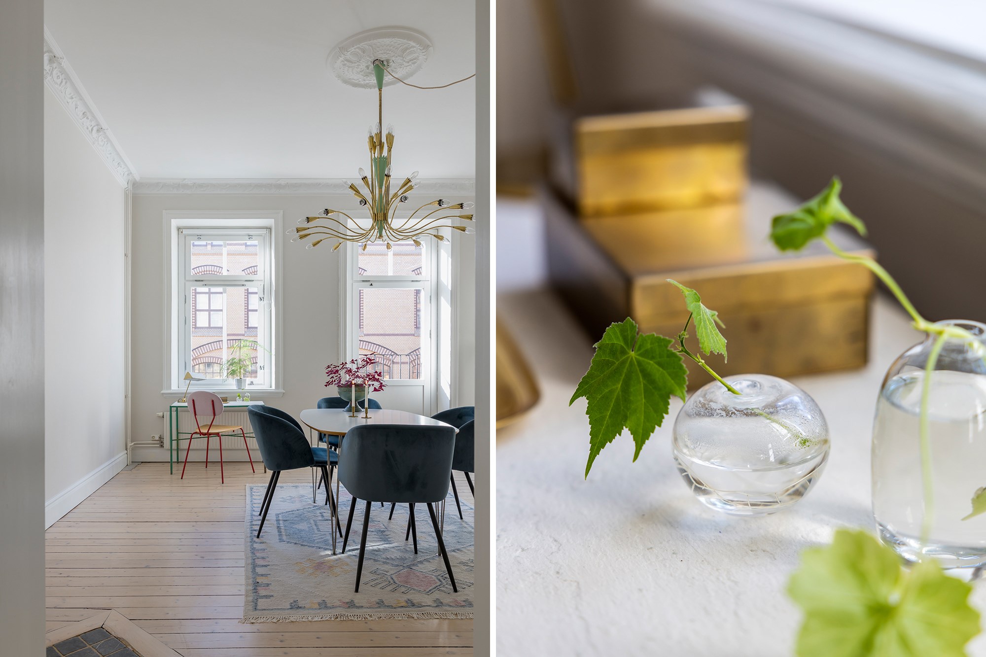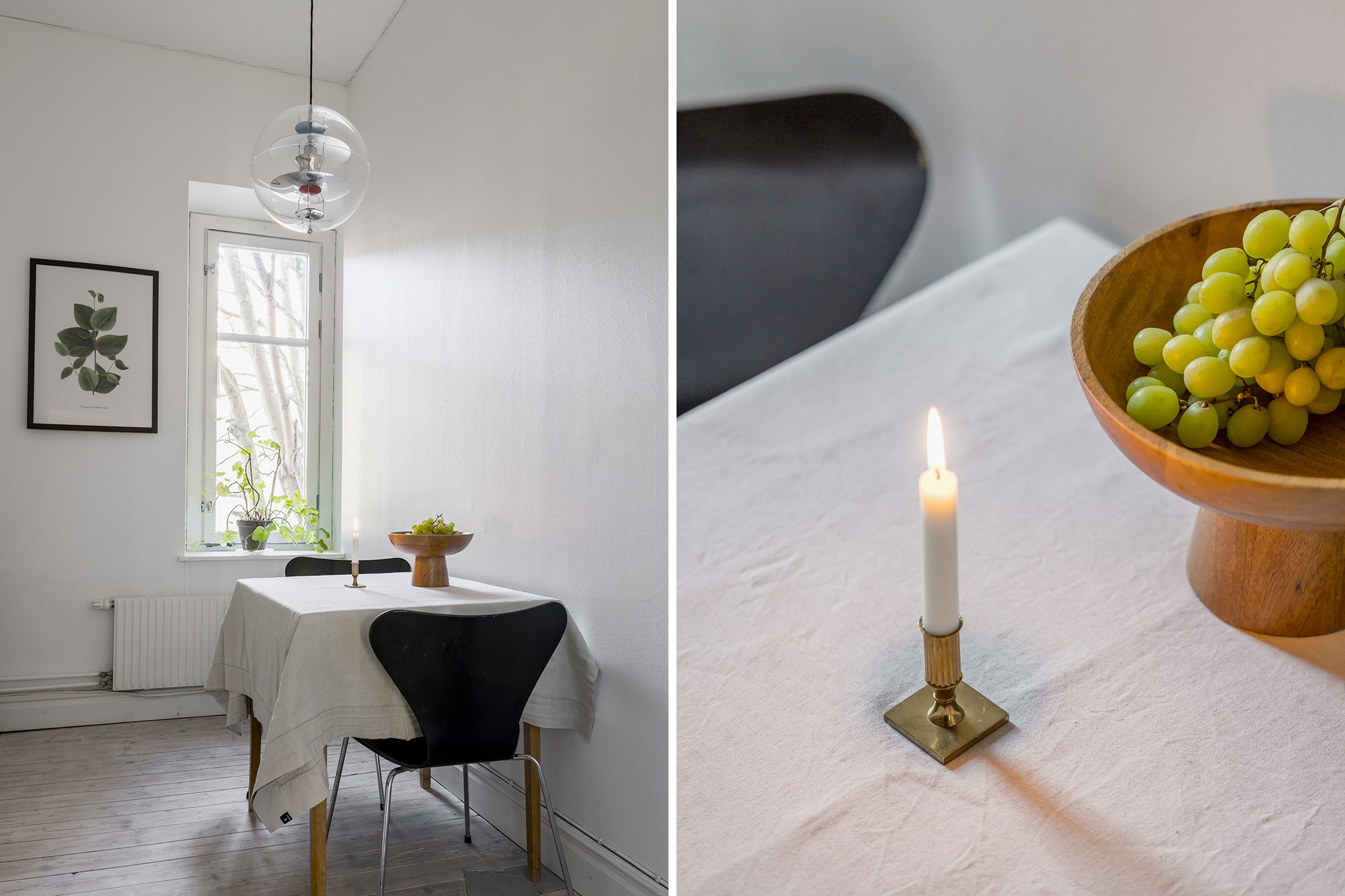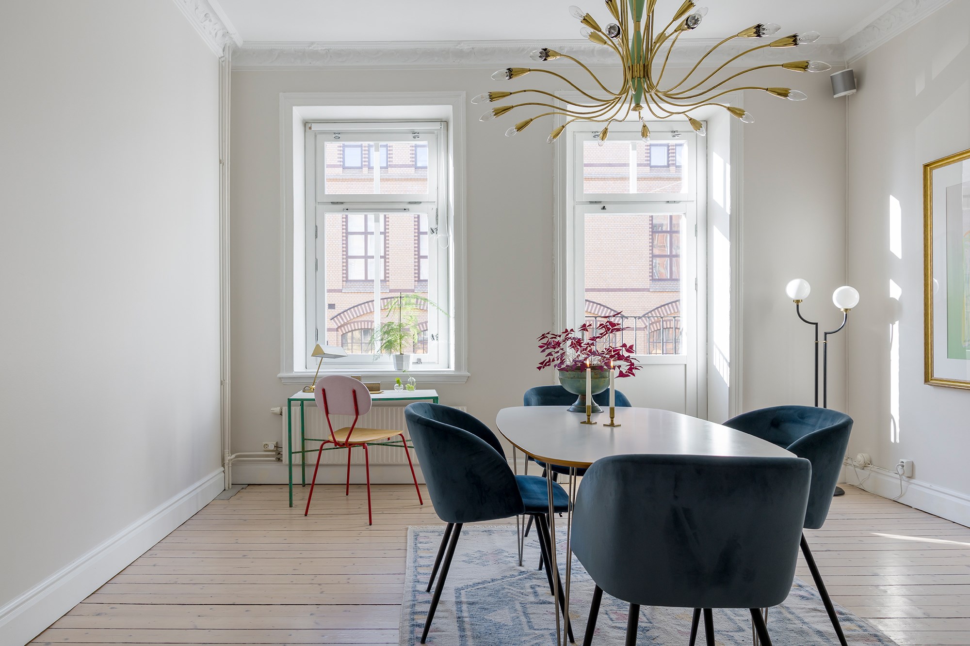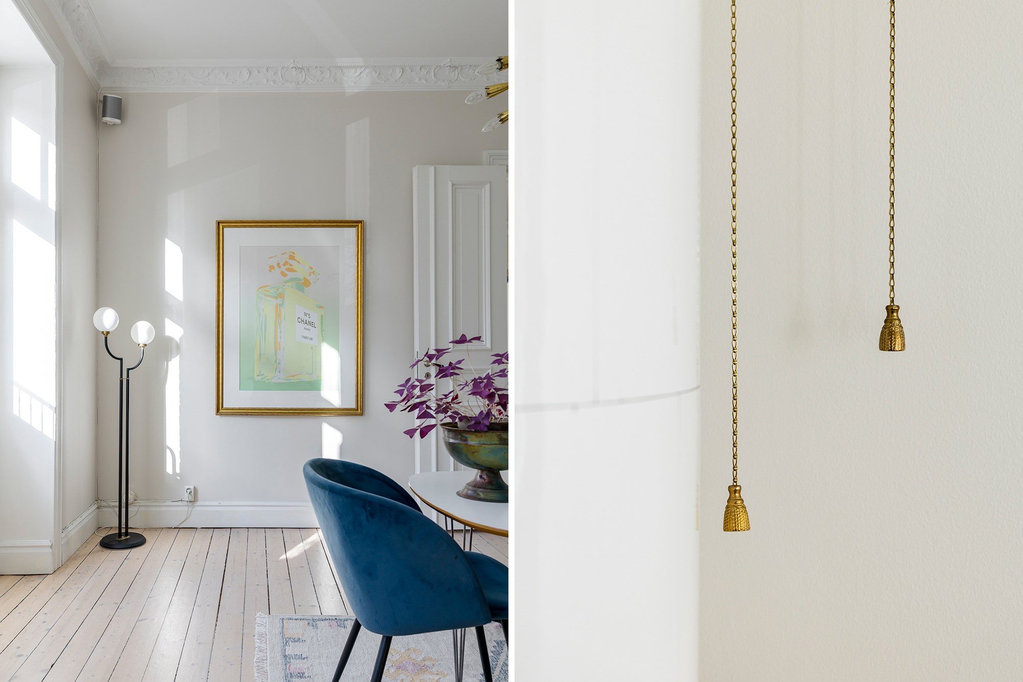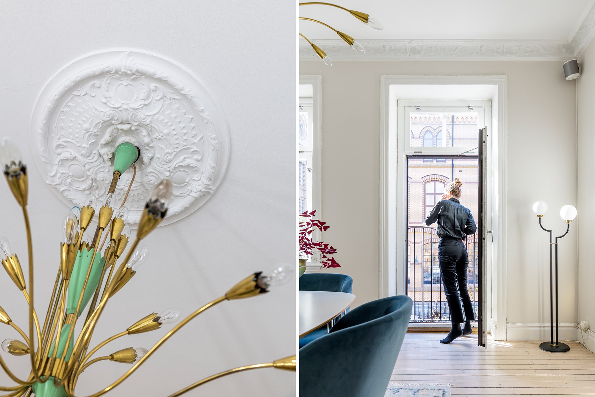 Brädgolv och ljusa väggar ger rummet en luftig känsla. Fönster och fransk balkong släpper in gott om ljus. Kakelugn, stuckaturer och takrosett ger rummet sin tydliga sekelskifteskaraktär. Här finns plats för både soffhörna och matbord.