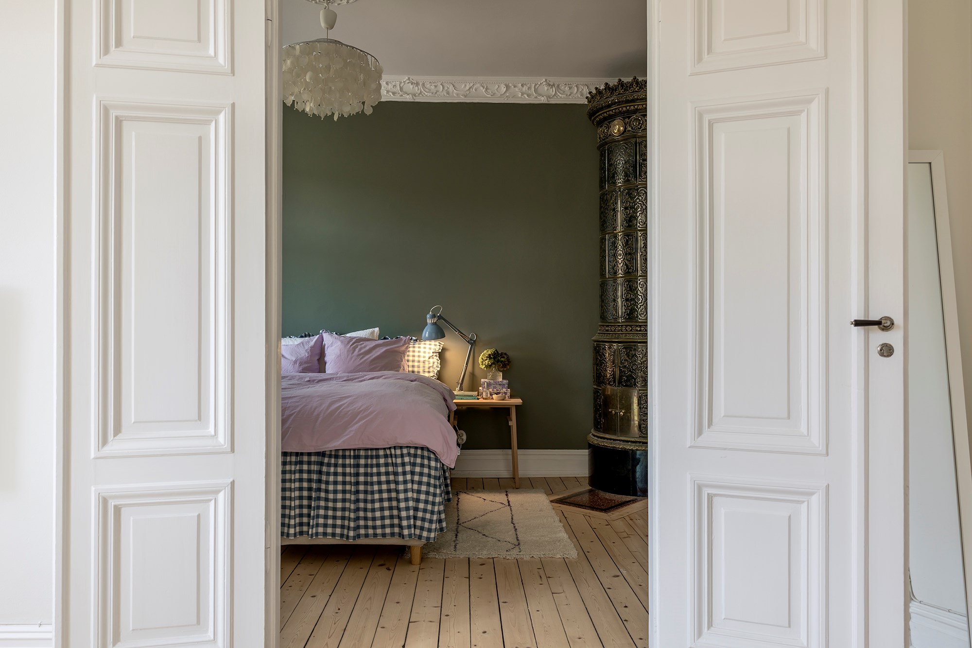 Brädgolv, målade väggar i en lugn mörkgrön ton och vackra stuckaturer. Här finns platsbyggda garderober och en kakelugn. Plats för dubbelsäng.