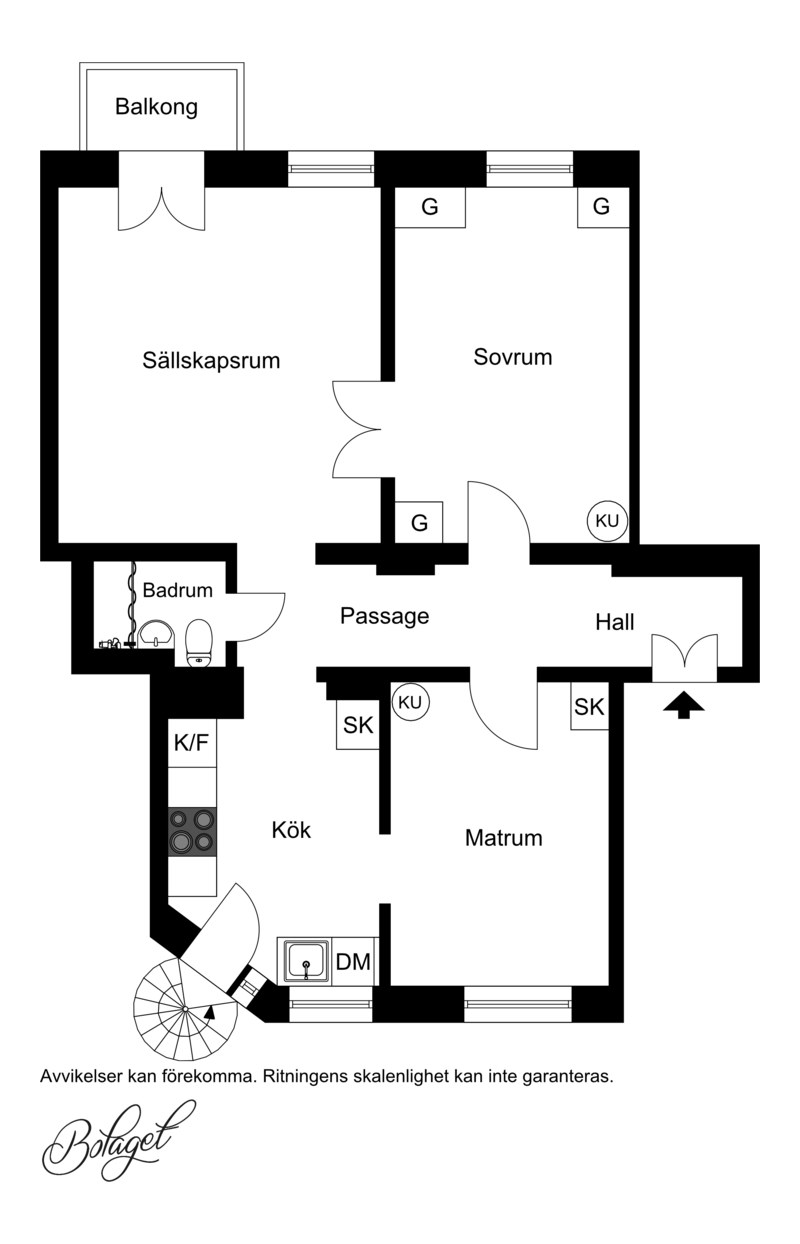 Brädgolv, ljusa väggar och stuckaturer. Plats för större soffgrupp. I anslutning finns en härlig balkong som rymmer bord och stolar.