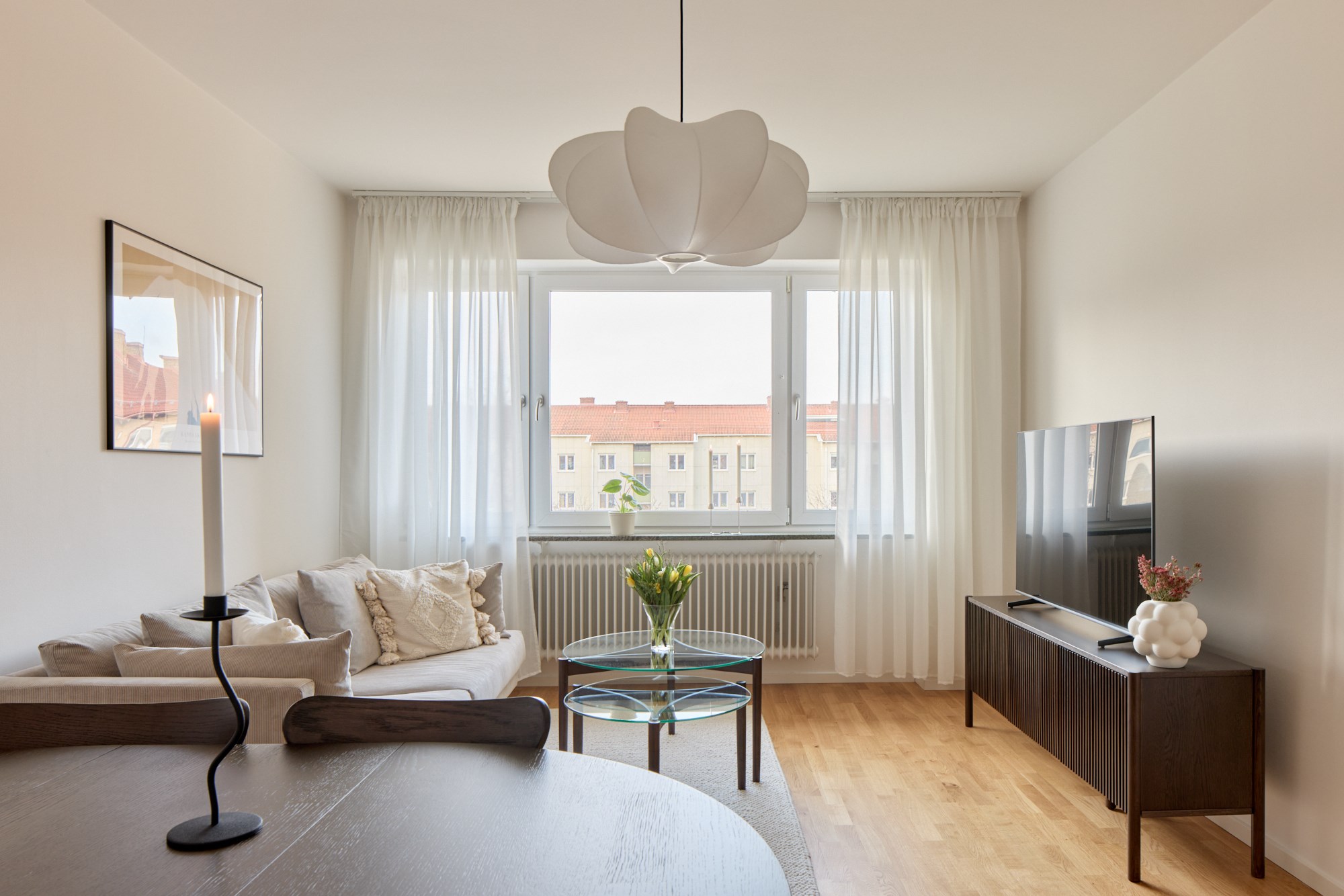 Pildammsparken är lika vacker året om, fylld av karaktär och gångstråk med skyddande växtlighet. Utegym, porlande vatten och vår som väntar, vilket grannskap! Högst upp i huset på Mariedalsvägen med utsikt ut över vida innergårdar i skönt solläge väntar en ljus tvåa med fin bas. Snart syns vårlökarna nicka i rabatterna och gården blir kanske en plats för dig att utnyttja. Boendets yta är väldisponerad och från hallen nås både sovrum, klädkammare, sällskapsrum - och ett fräscht kök. Vita, släta väggar och vacker parkett bidrar tillsammans med de rena linjerna till en attraktiv lägenhet - breda fönsterpartier bjuder in utsikt och ljus, det är en fantastisk rymd och luftig känsla i rummen. Intill köket ligger våningens sovrum, generöst och med samma fria utsikt. Här bor ni i de mysiga kvarteren vid Slottsstaden, mellan de stora parkerna och nära både innersta city och havets vågor - perfekt!