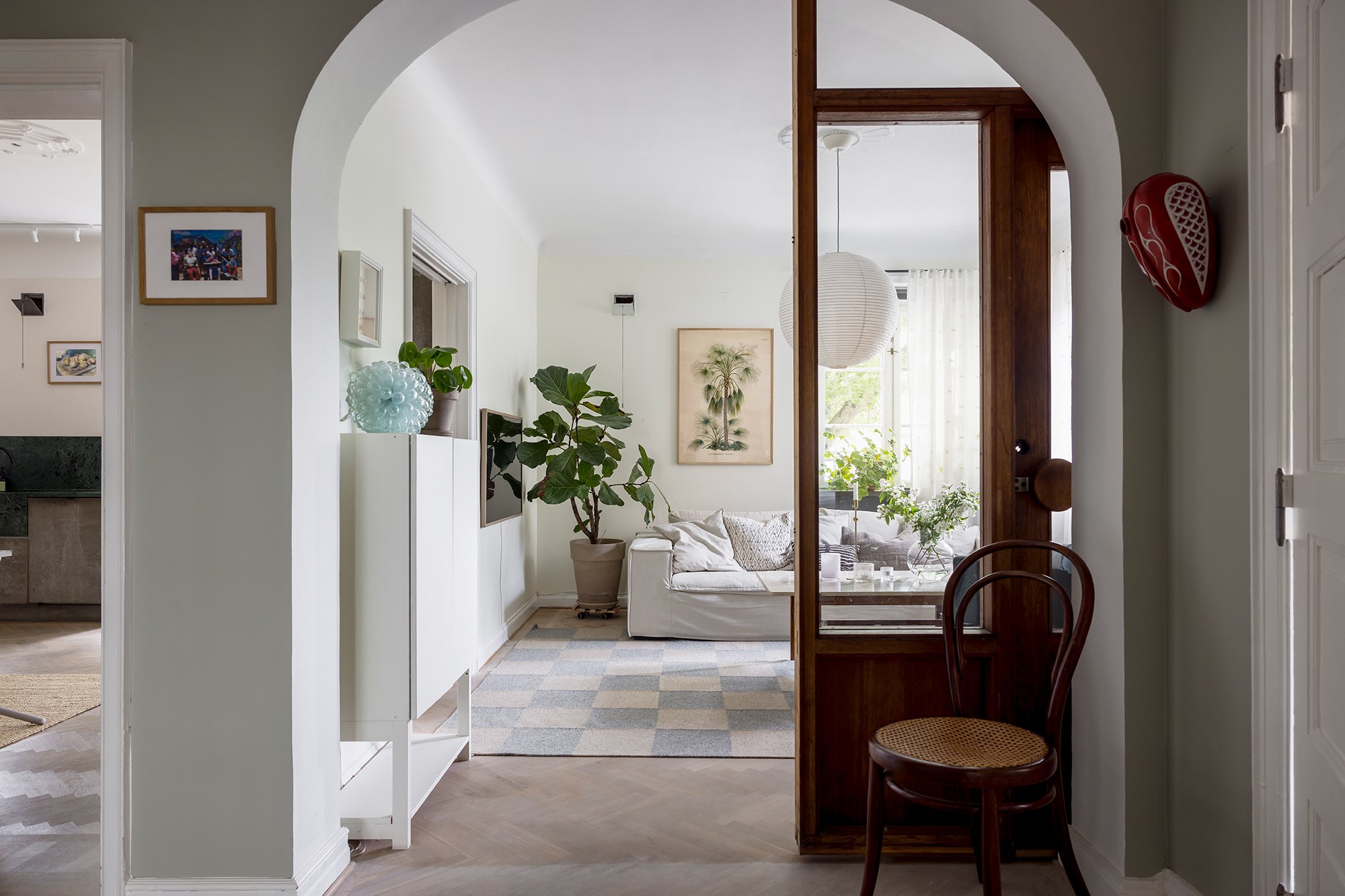 Fiskbensparkett och väggar i en pistagegrön färg.