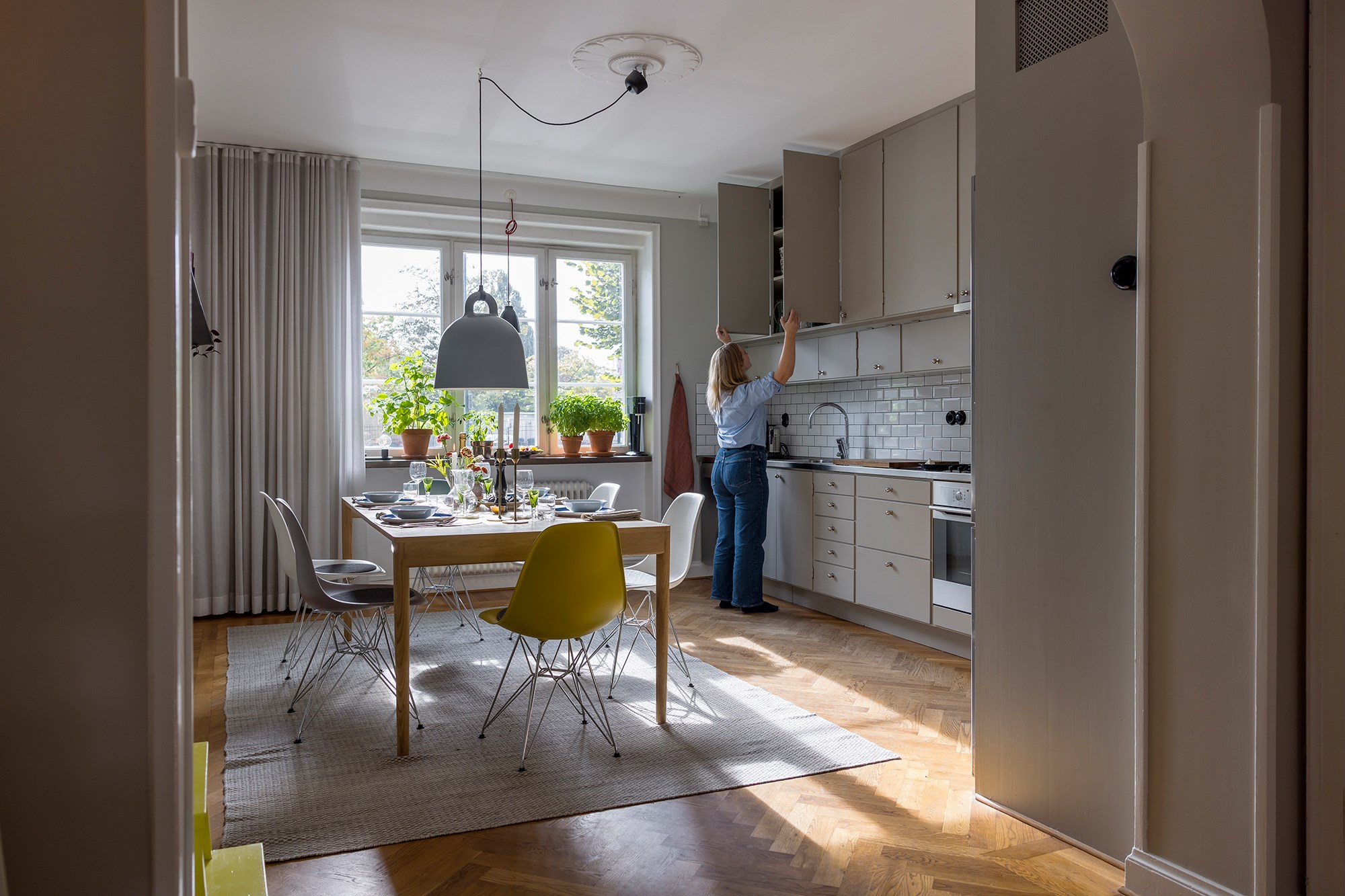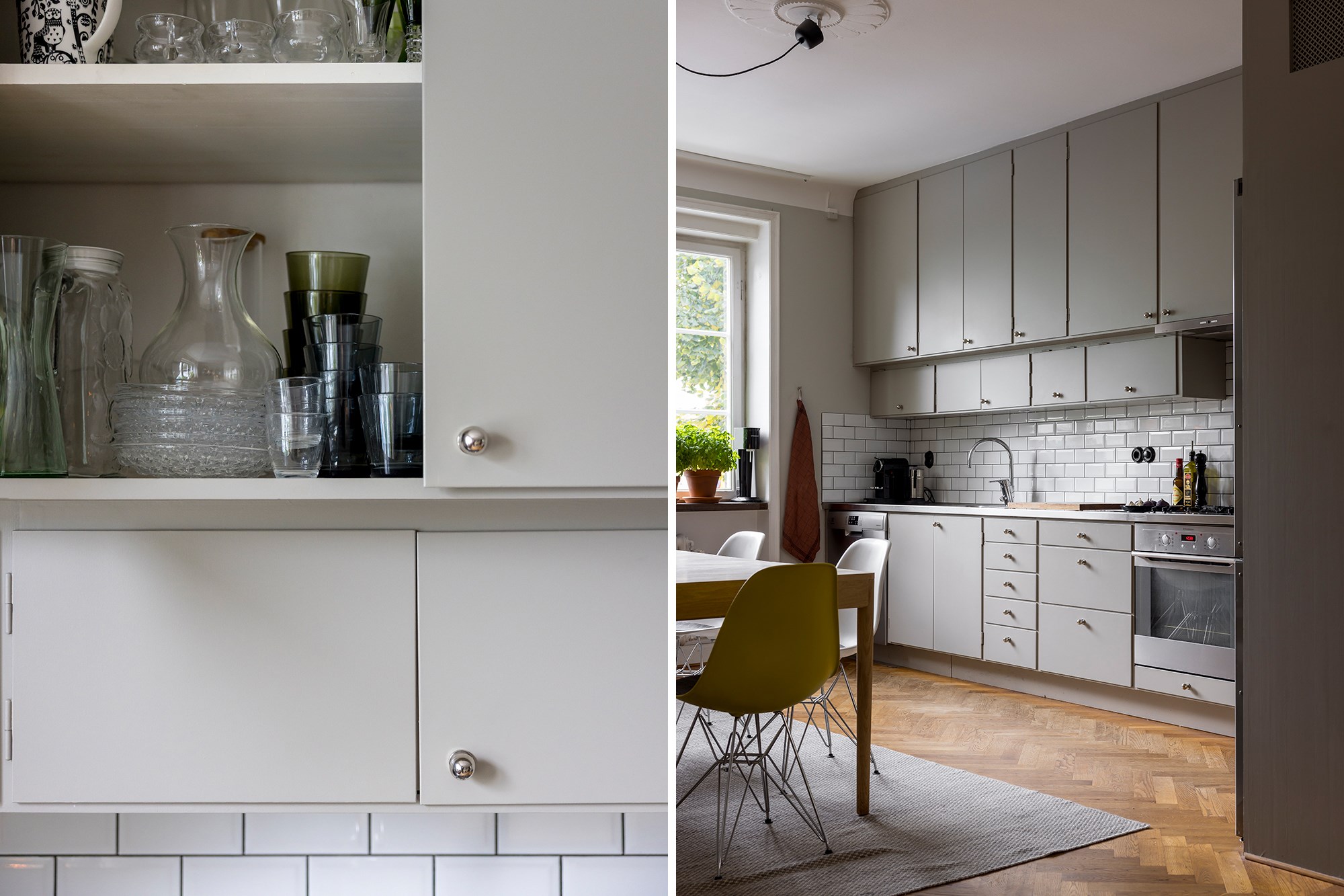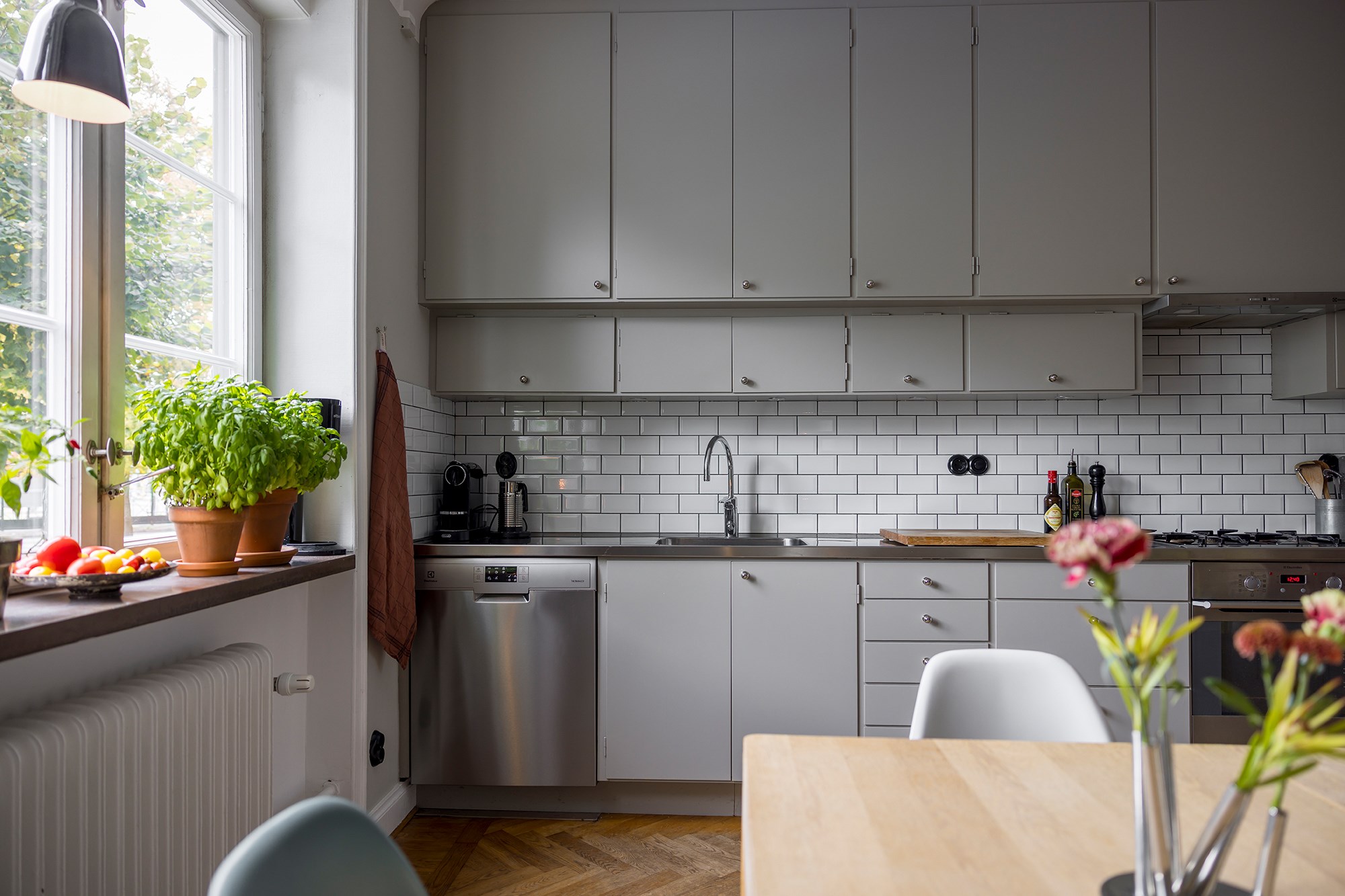 Fiskbensparkett och väggar målade i grått. Platsbyggt kök och bänkskiva i rostfritt stål. Maskinell utrustning i form av gasspis och fläkt, ugn, diskmaskin samt kyl/frys. God förvaring i skafferi.