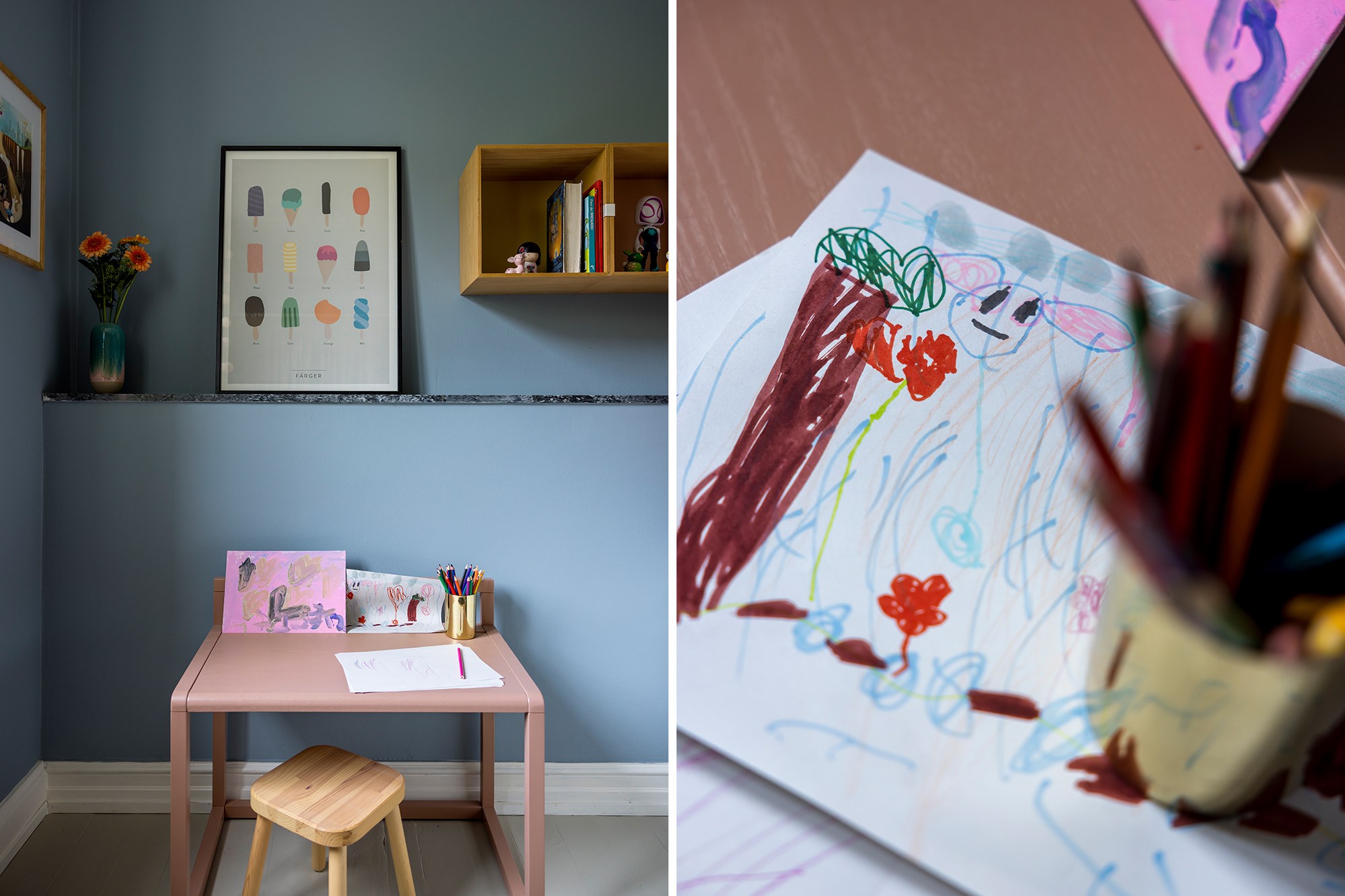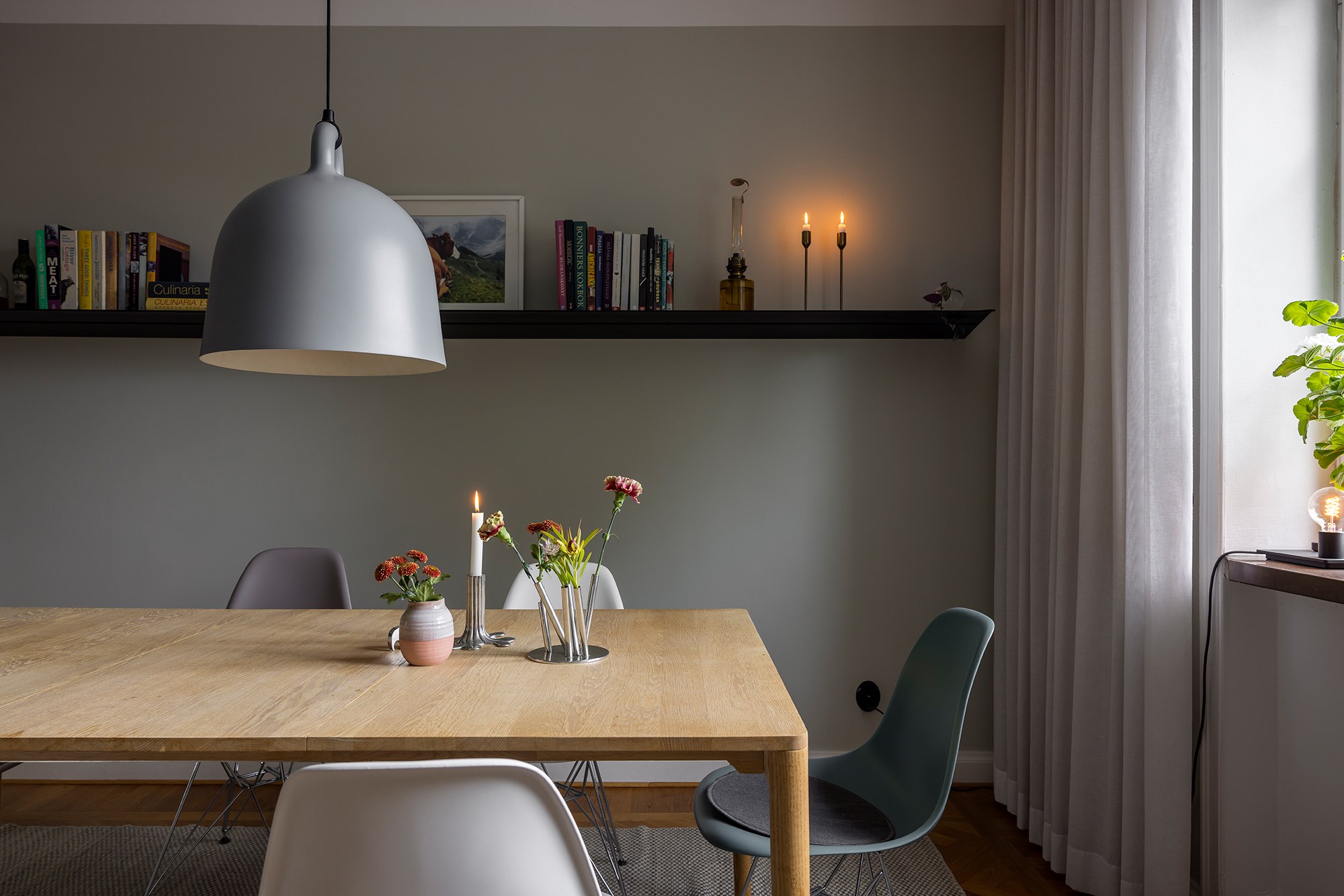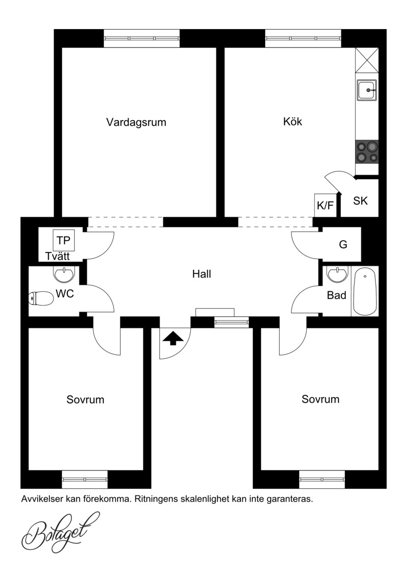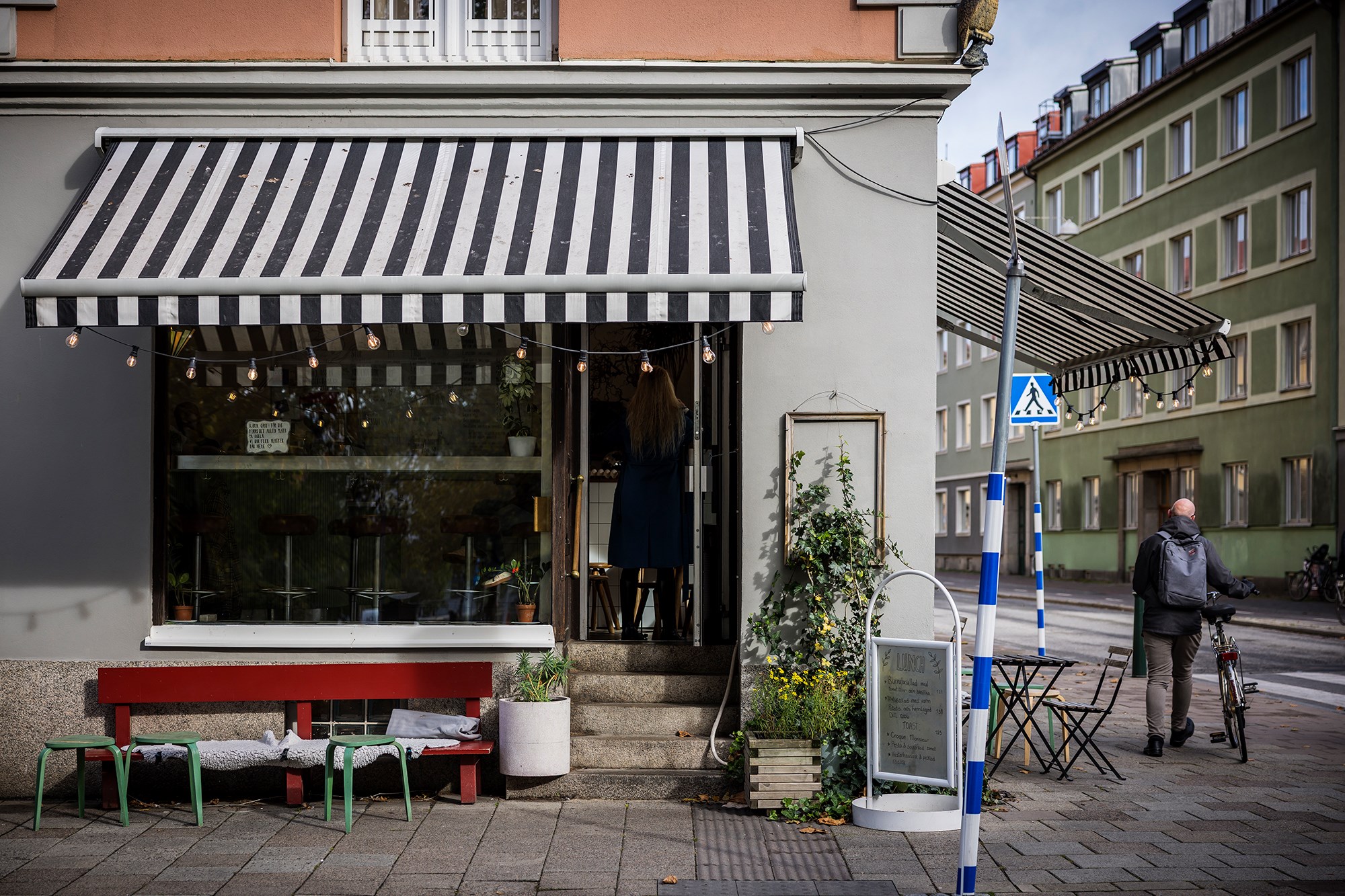 Fiskbensparkett och väggar målade i grått. Platsbyggt kök och bänkskiva i rostfritt stål. Maskinell utrustning i form av gasspis och fläkt, ugn, diskmaskin samt kyl/frys. God förvaring i skafferi.