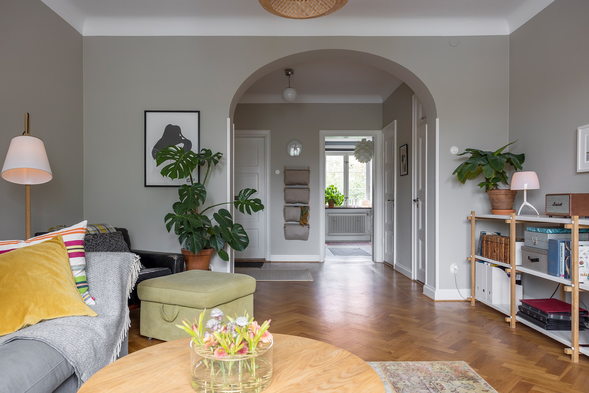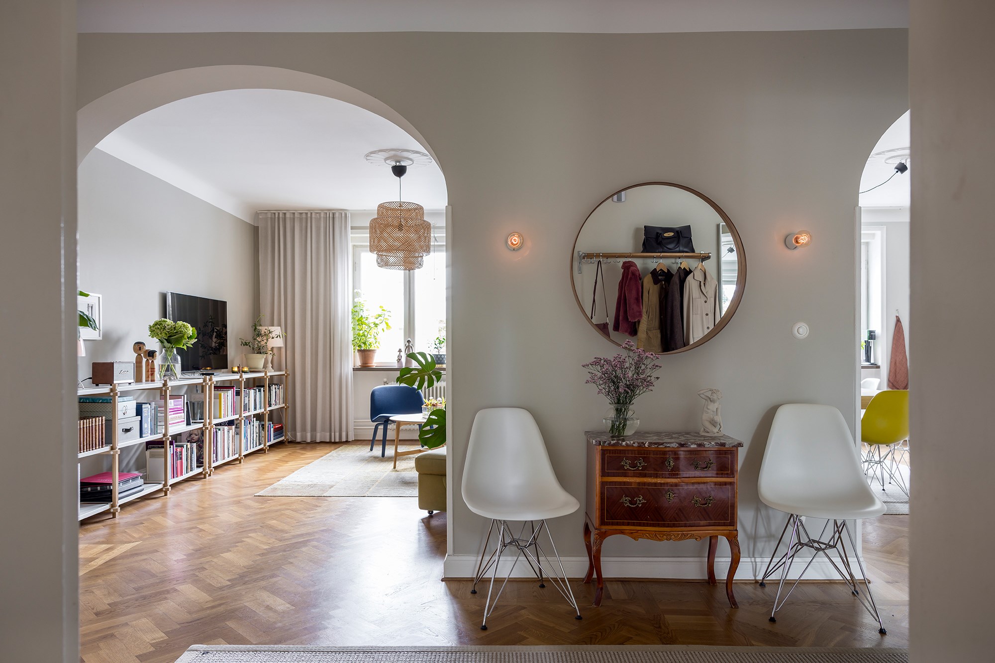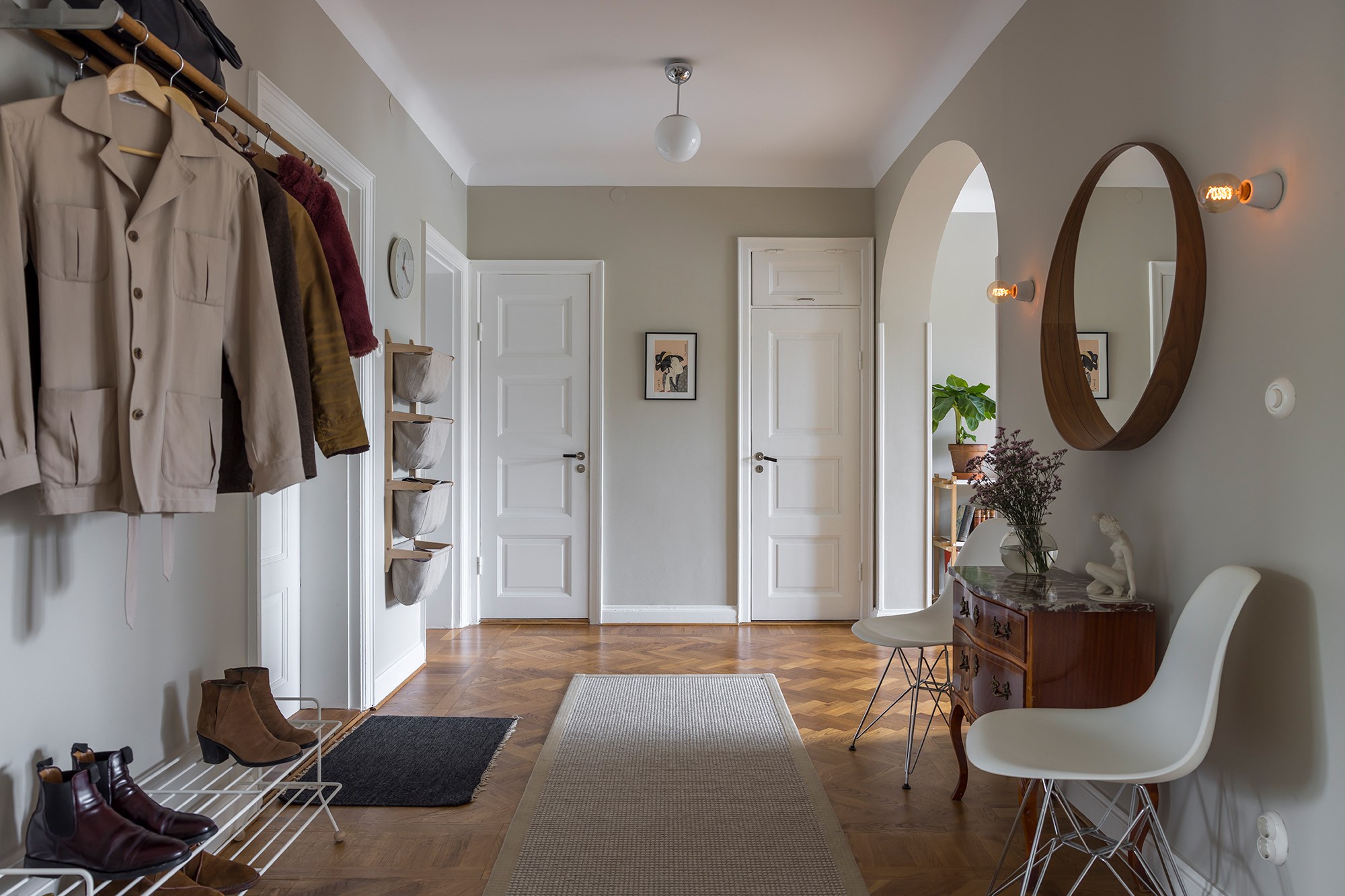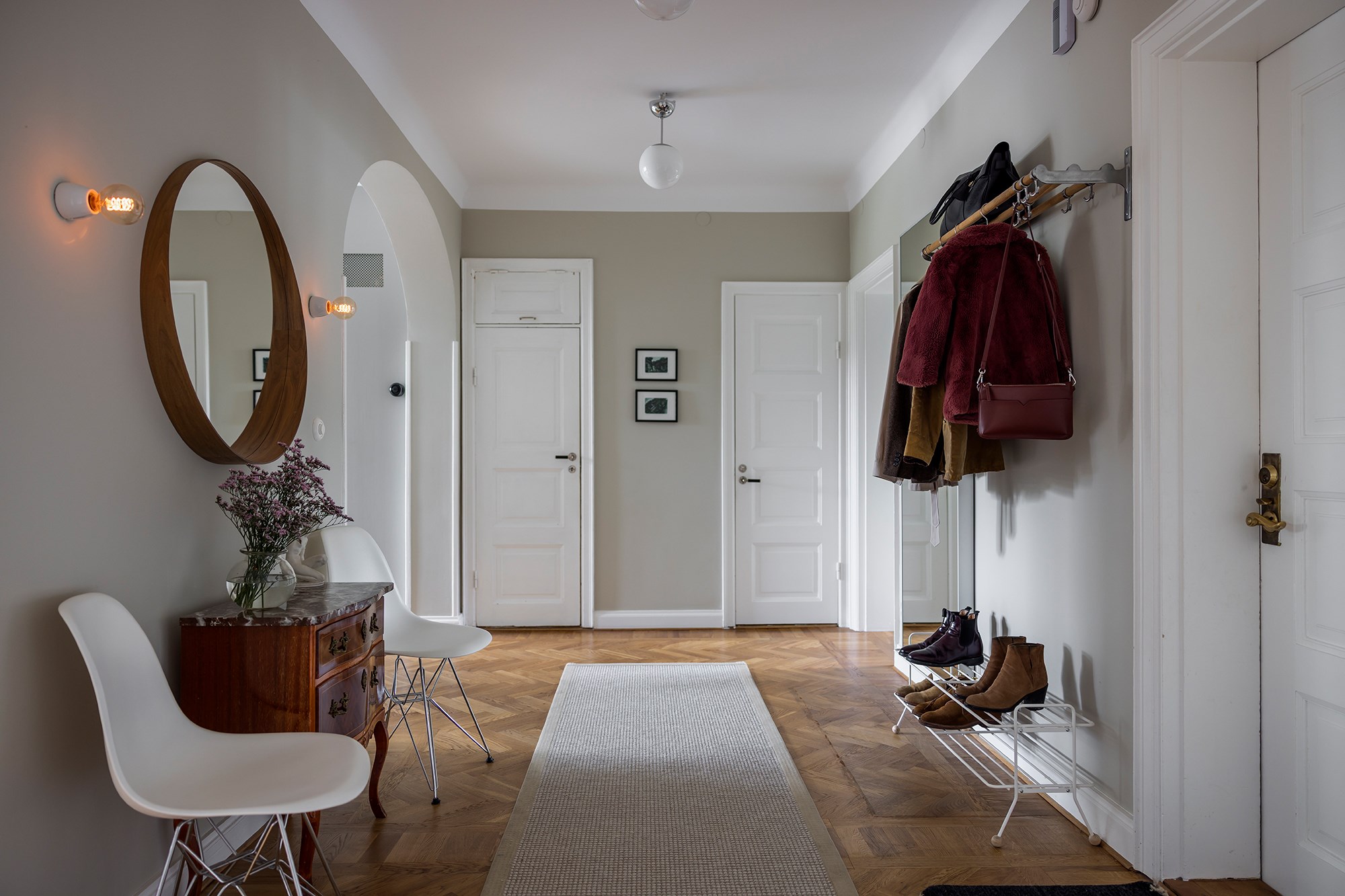 Fiskbensparkett och väggar målade i beige. Plats för avhängning.