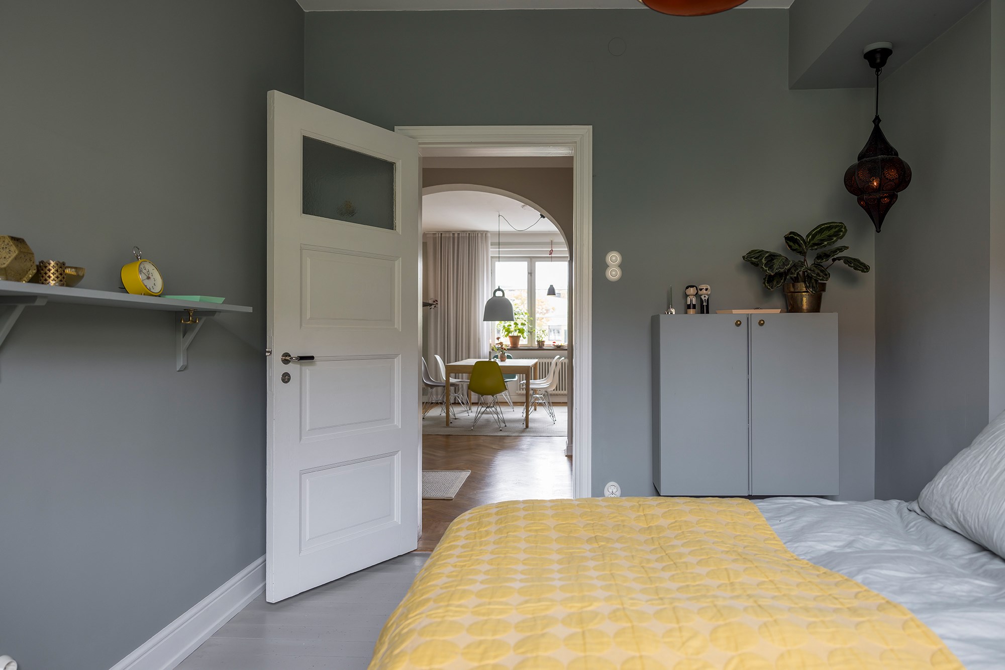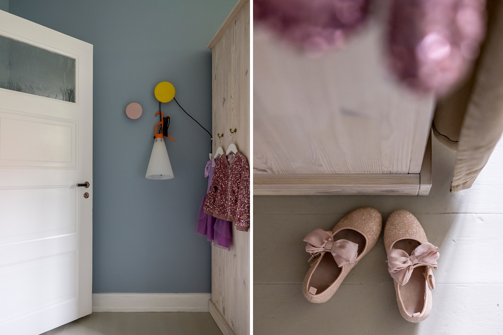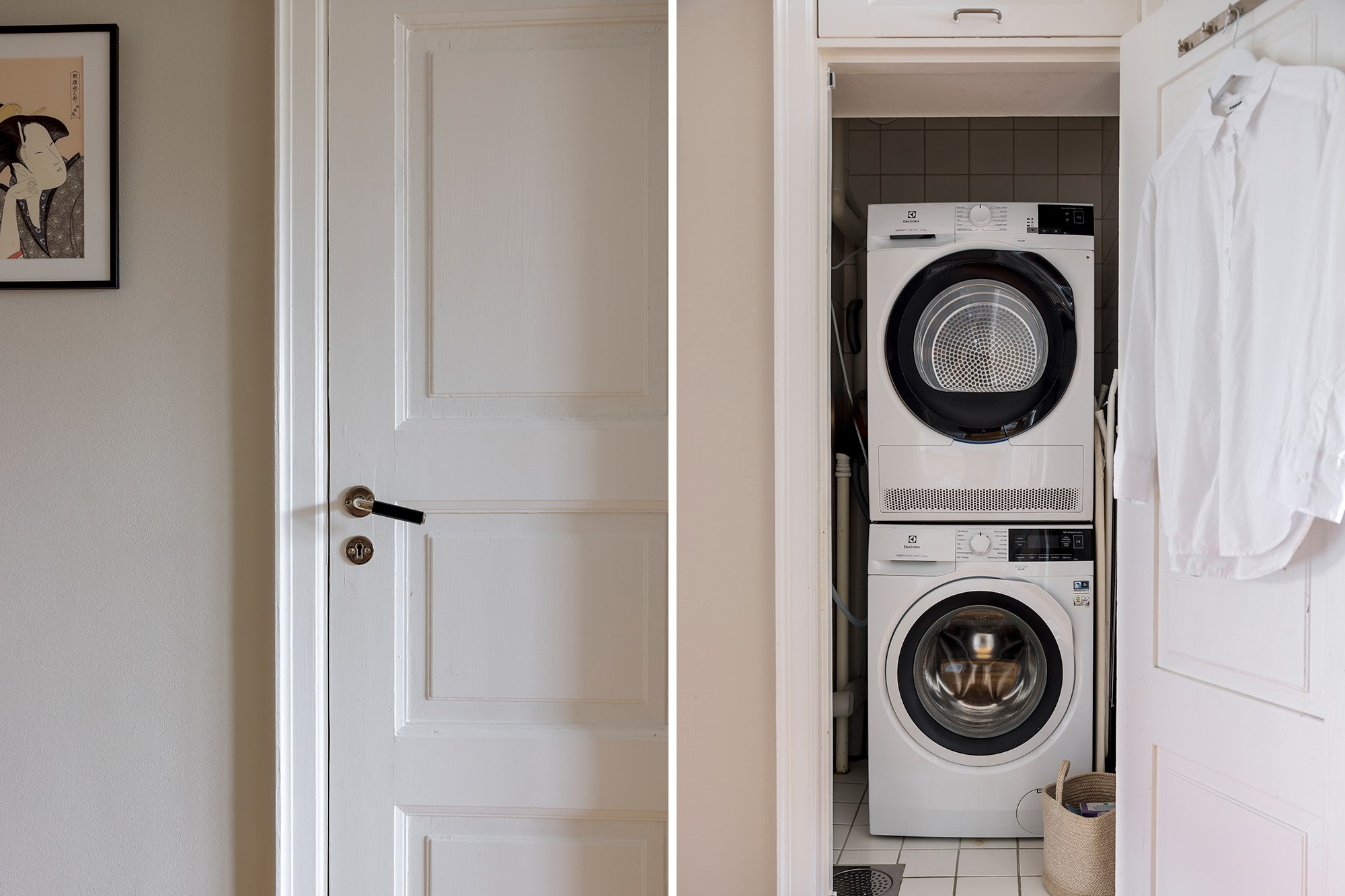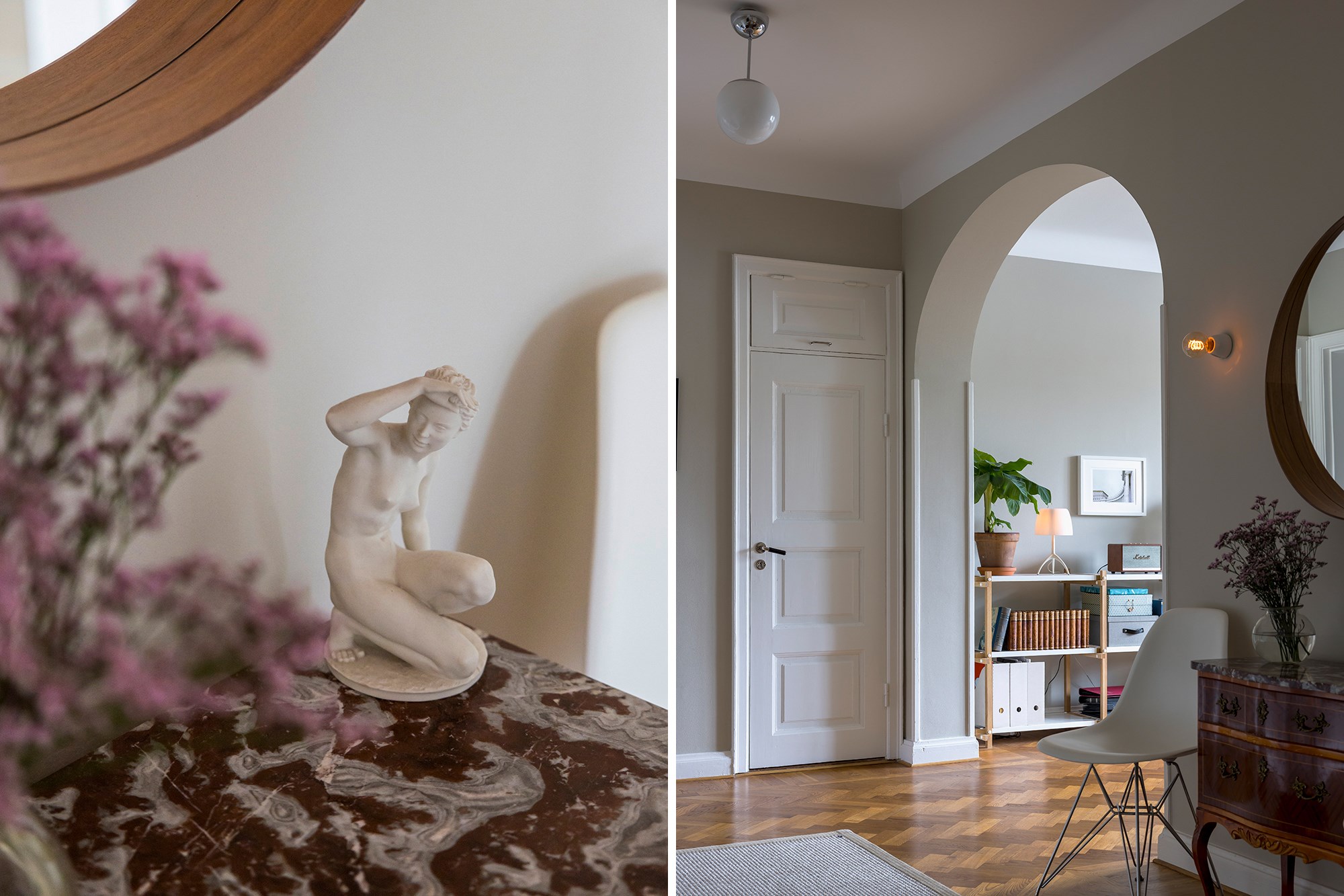 Fiskbensparkett och väggar målade i beige. Plats för avhängning.
