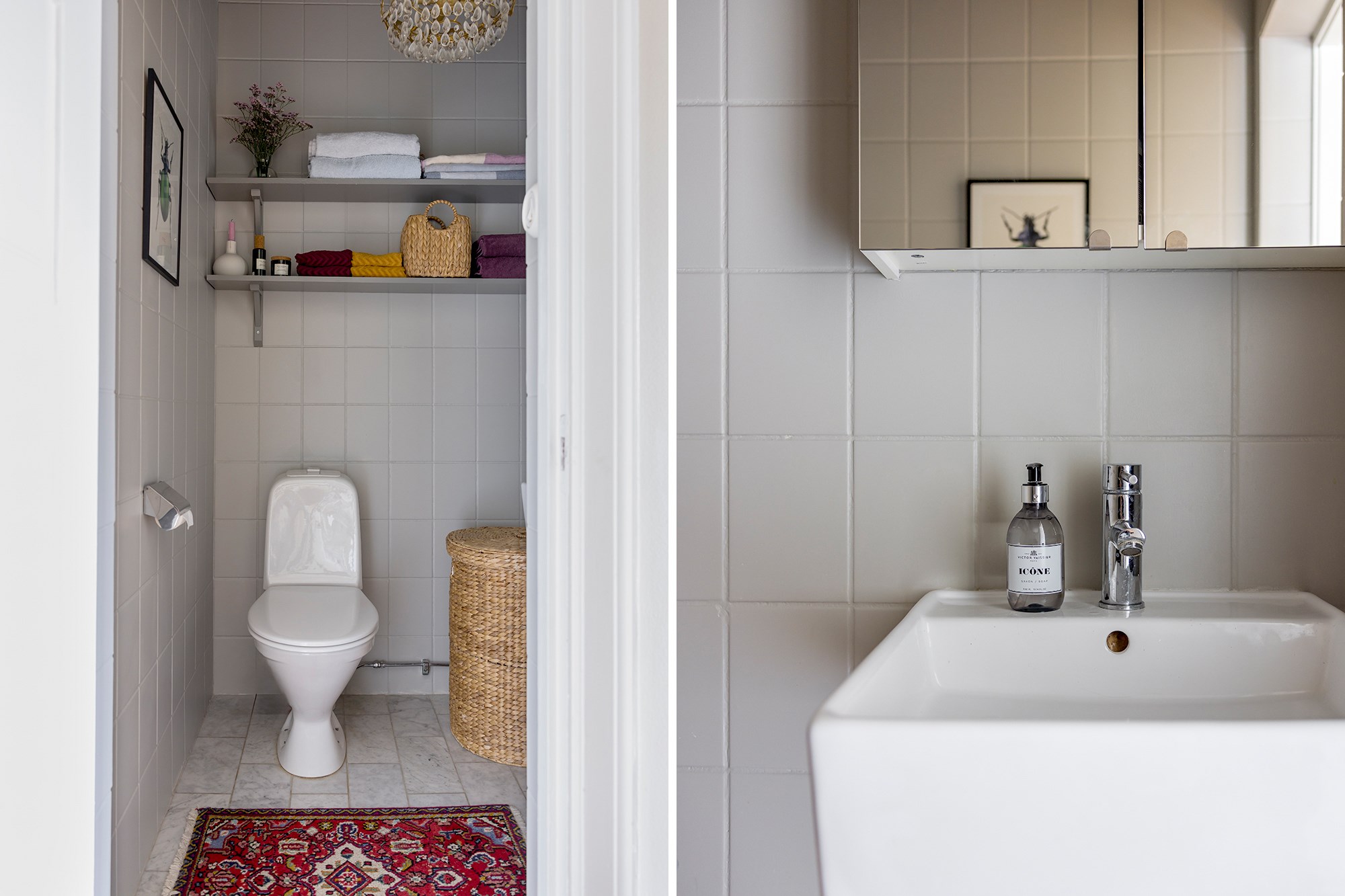 Marmorplattor på golv och kaklade väggar målade i ljusgrått. Utrustad med handfat och WC. Förvaringshyllor. Intill WC finns ett "tvättrum" utrustat med tvättpelare.
