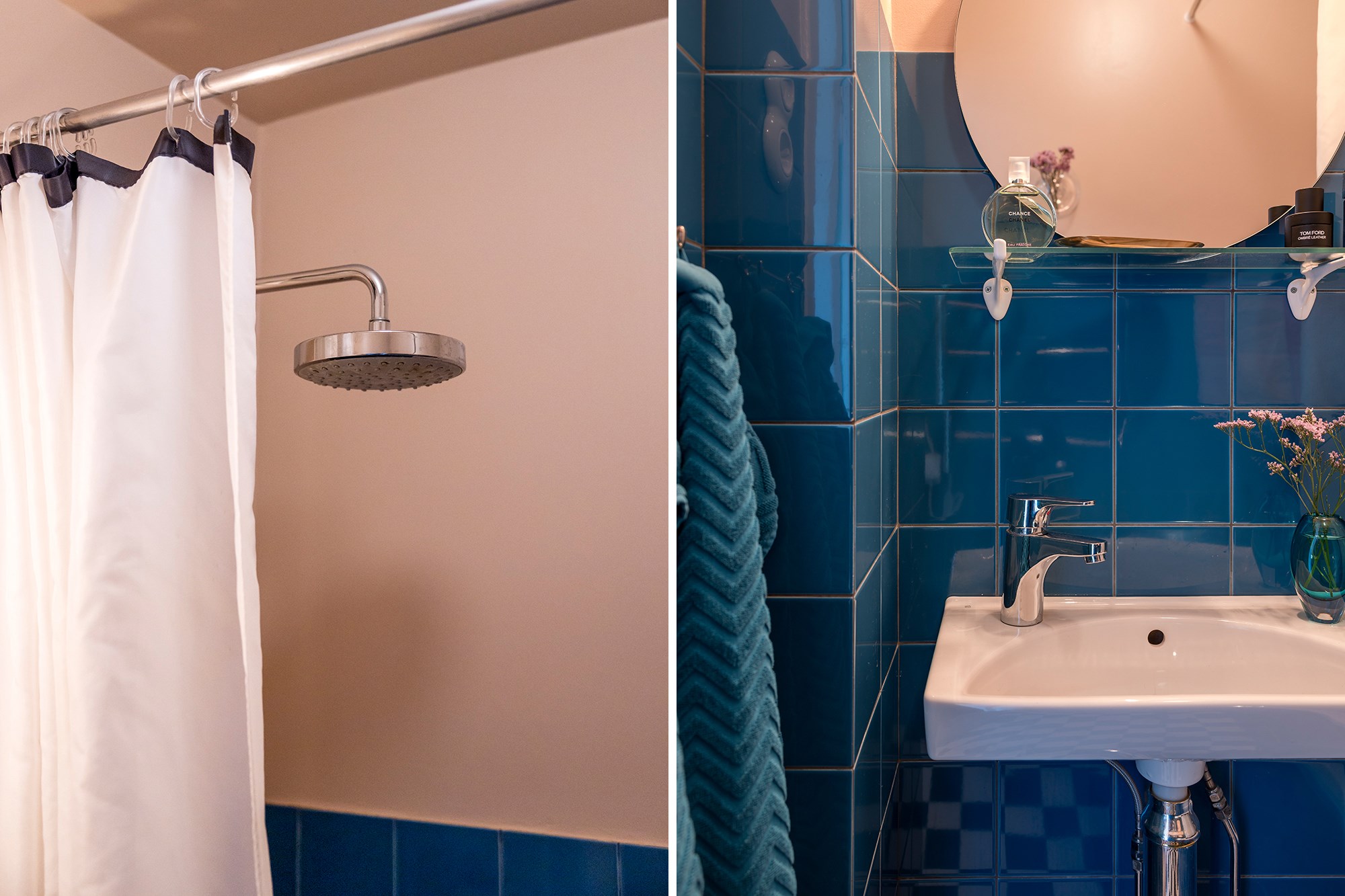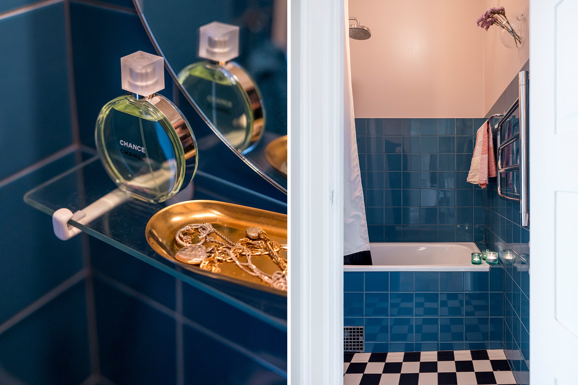 Schackrutigt klinker till golv och blå halvkaklade väggar. Väggar målade i ljusrosa. Utrustad med handfat, badkar med takdusch.