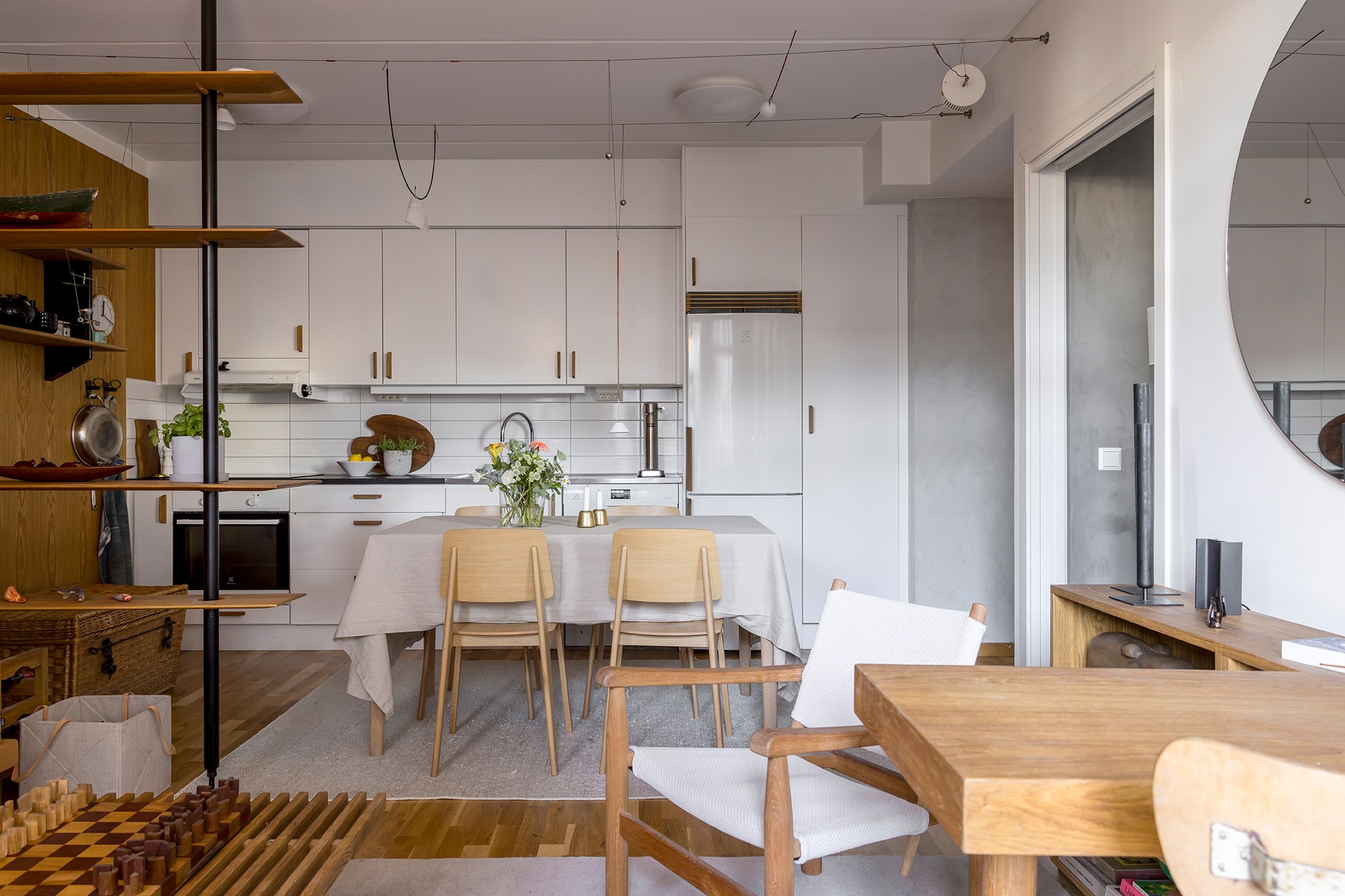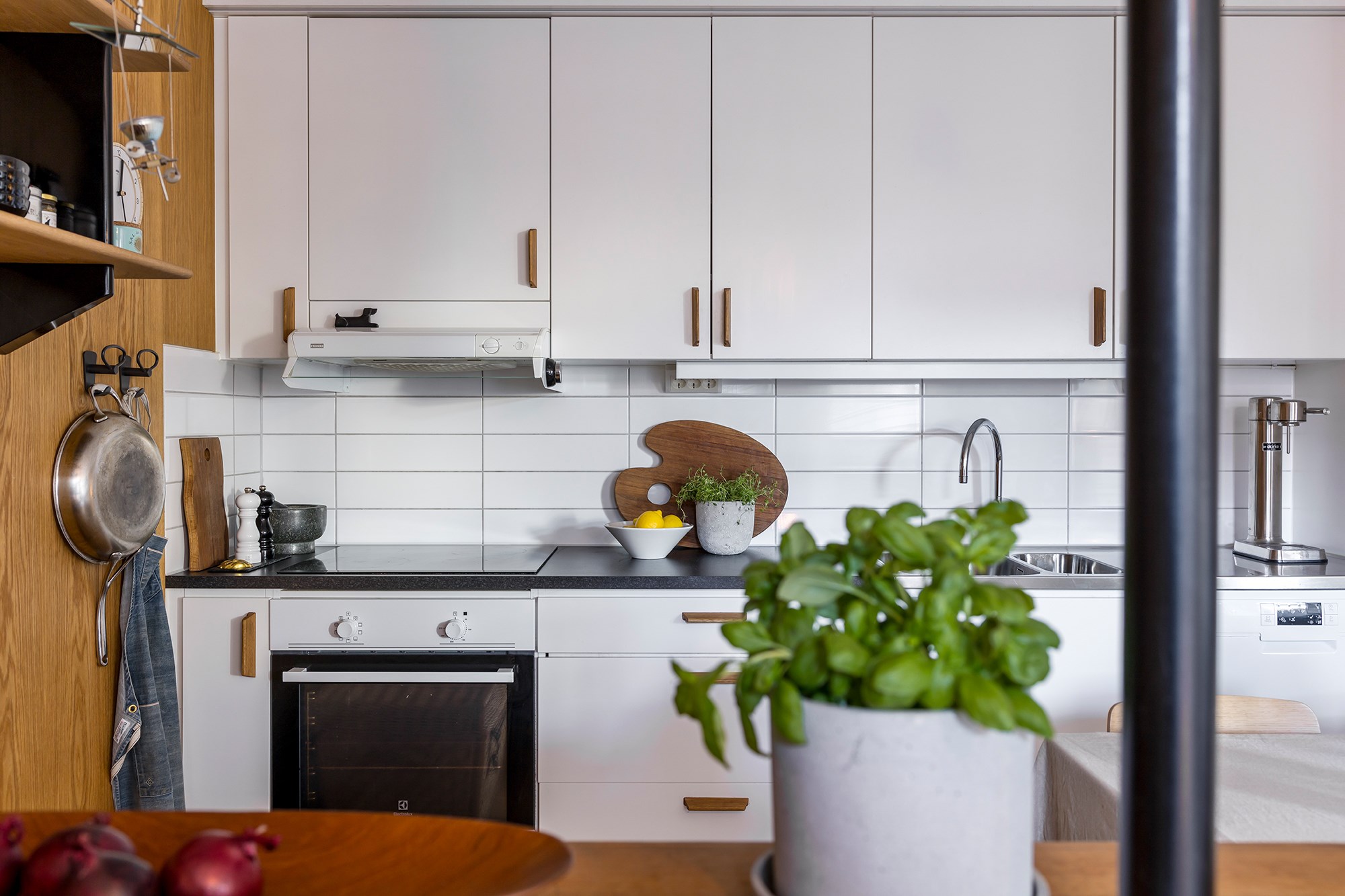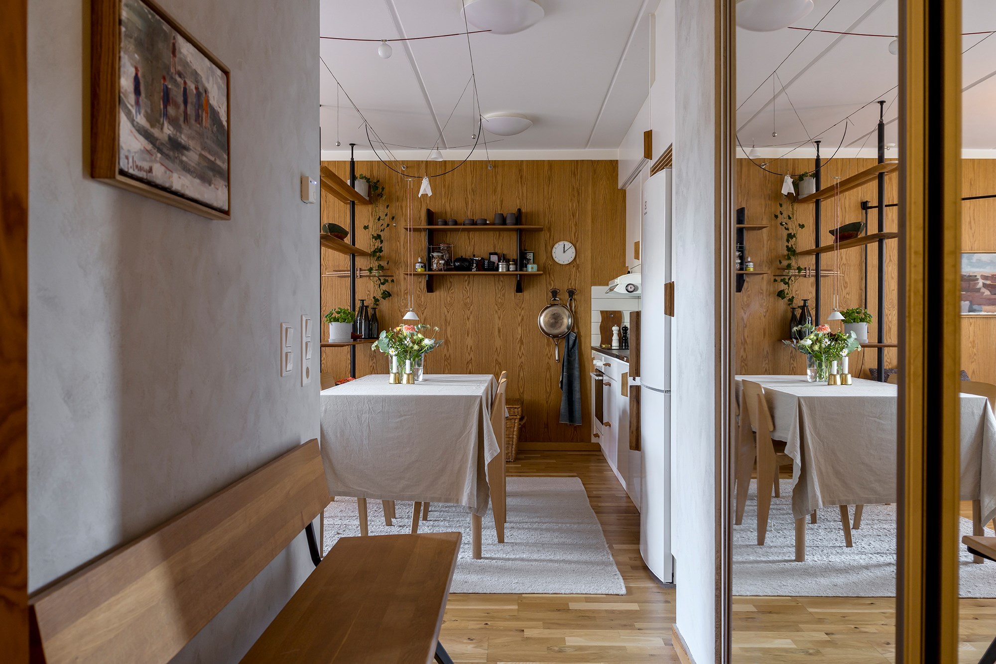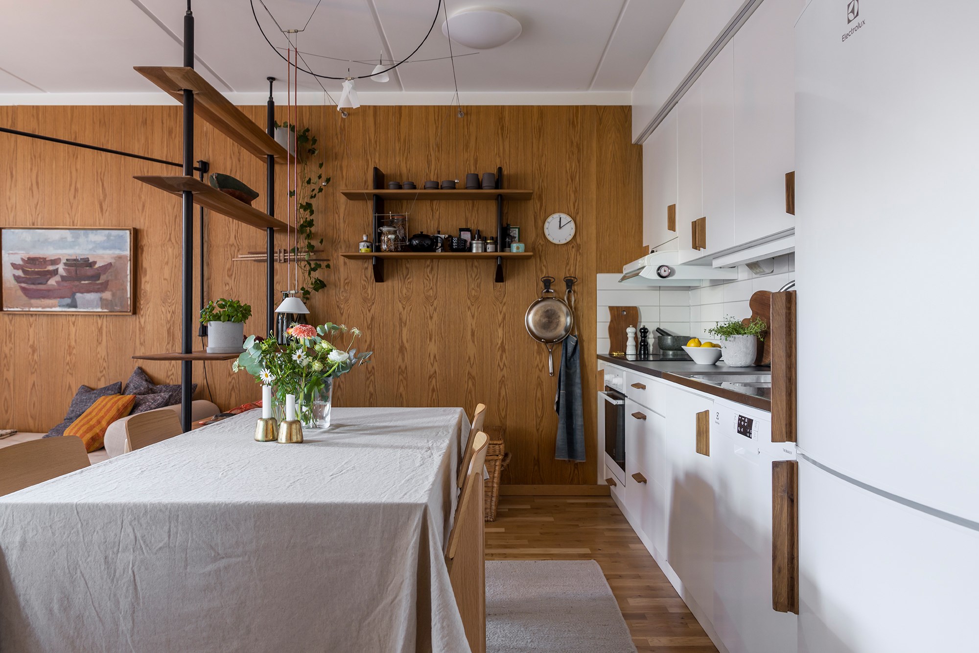 Öppen planlösning mellan kök och sällskapsrum. Trä faner samt vita väggar. Vit köksinredning och bänkskiva i laminat. Ugn, spishäll, fläkt och diskmaskin. Plats för matbord och soffmöblemang. Utgång till balkong i västläge.