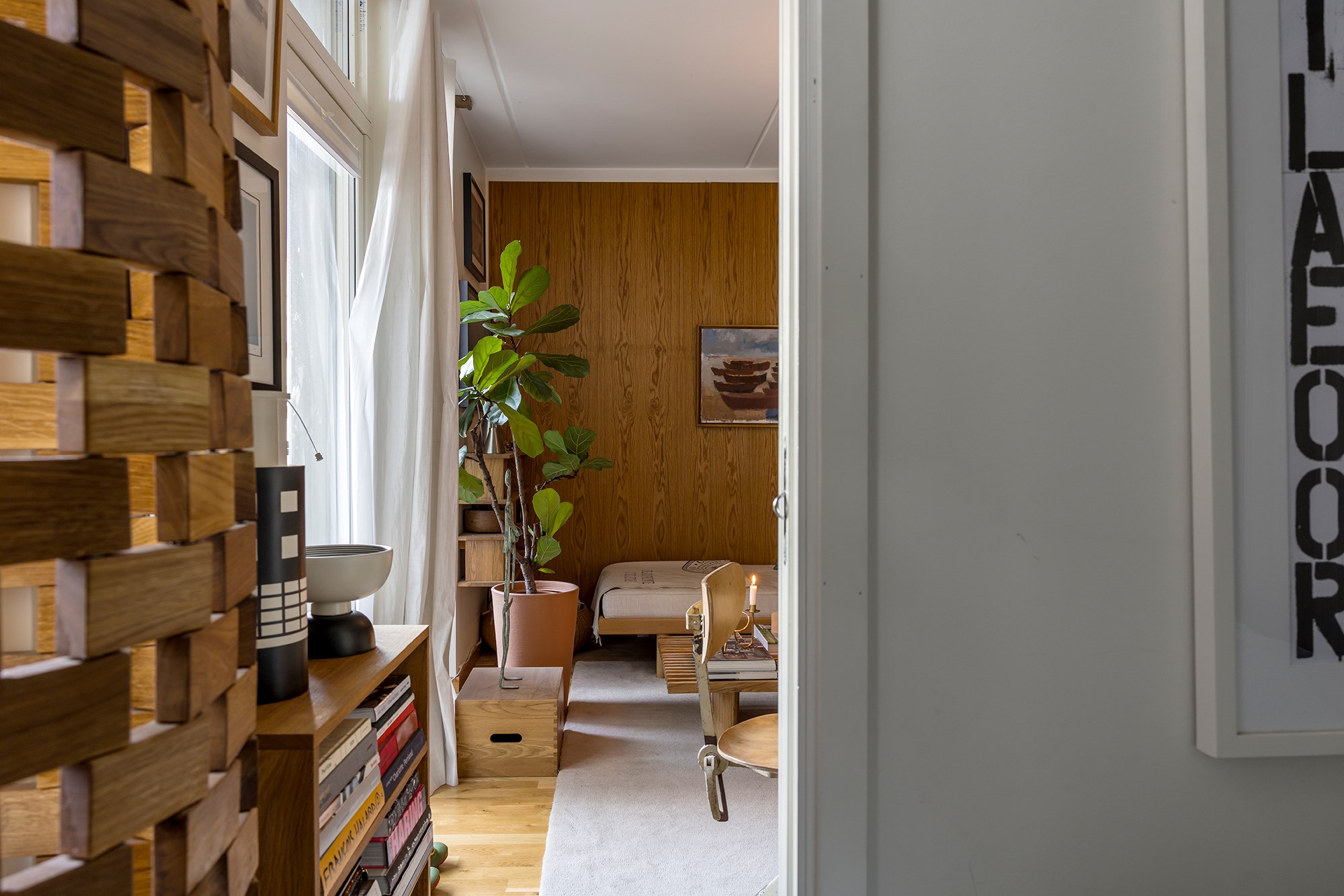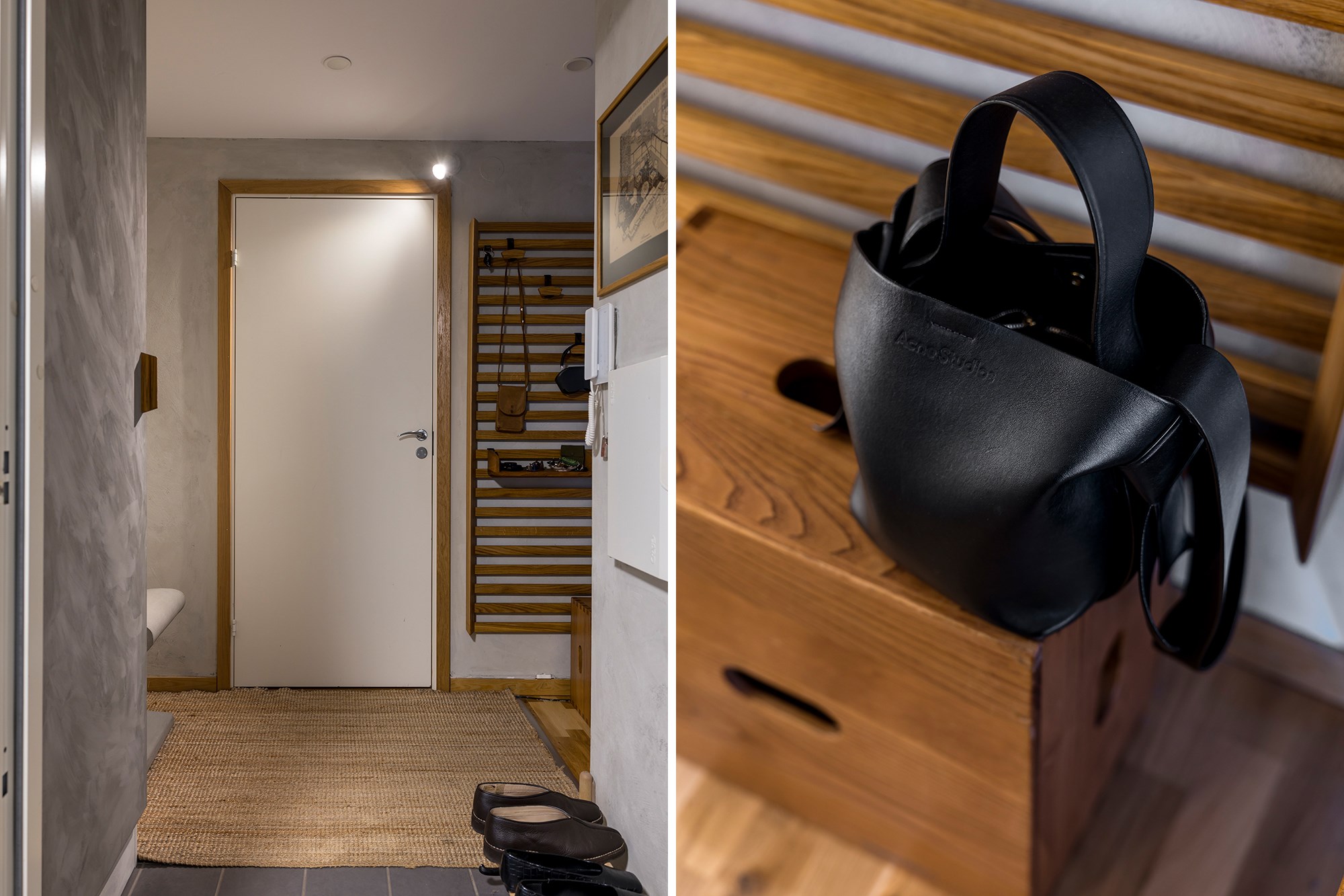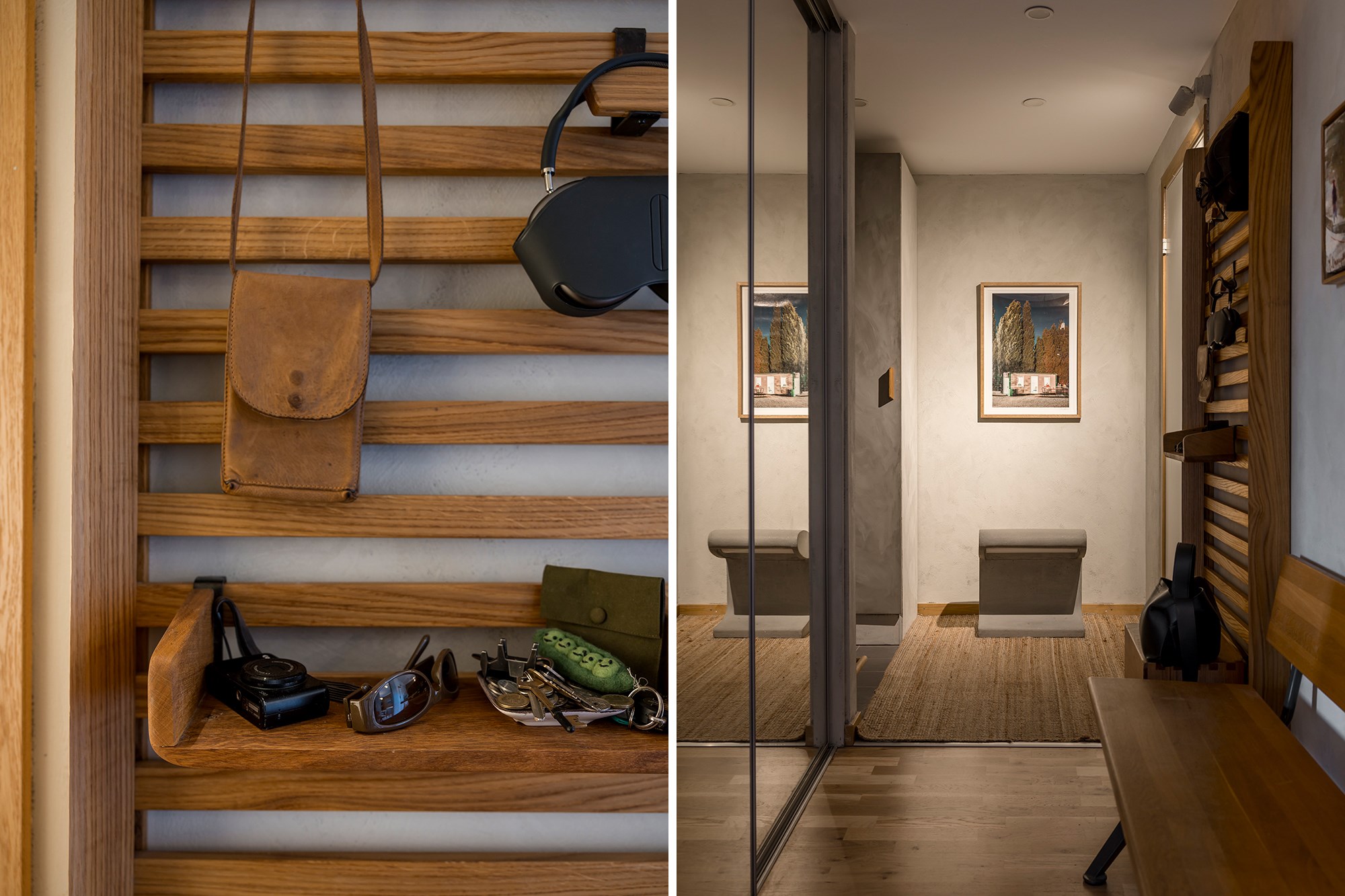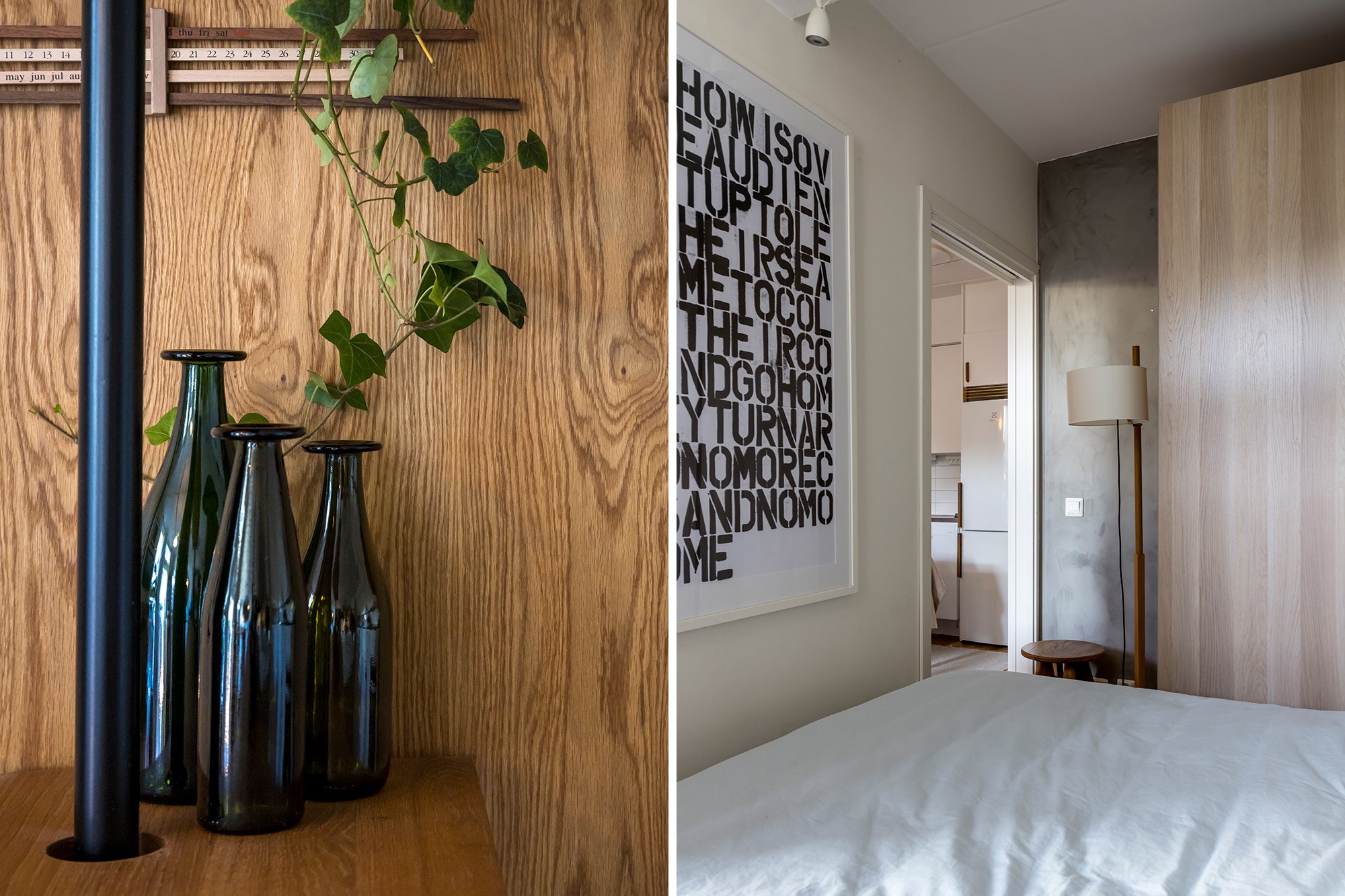 Ljusa väggar och fondvägg i grå-målad kalkfärg. Garderober.