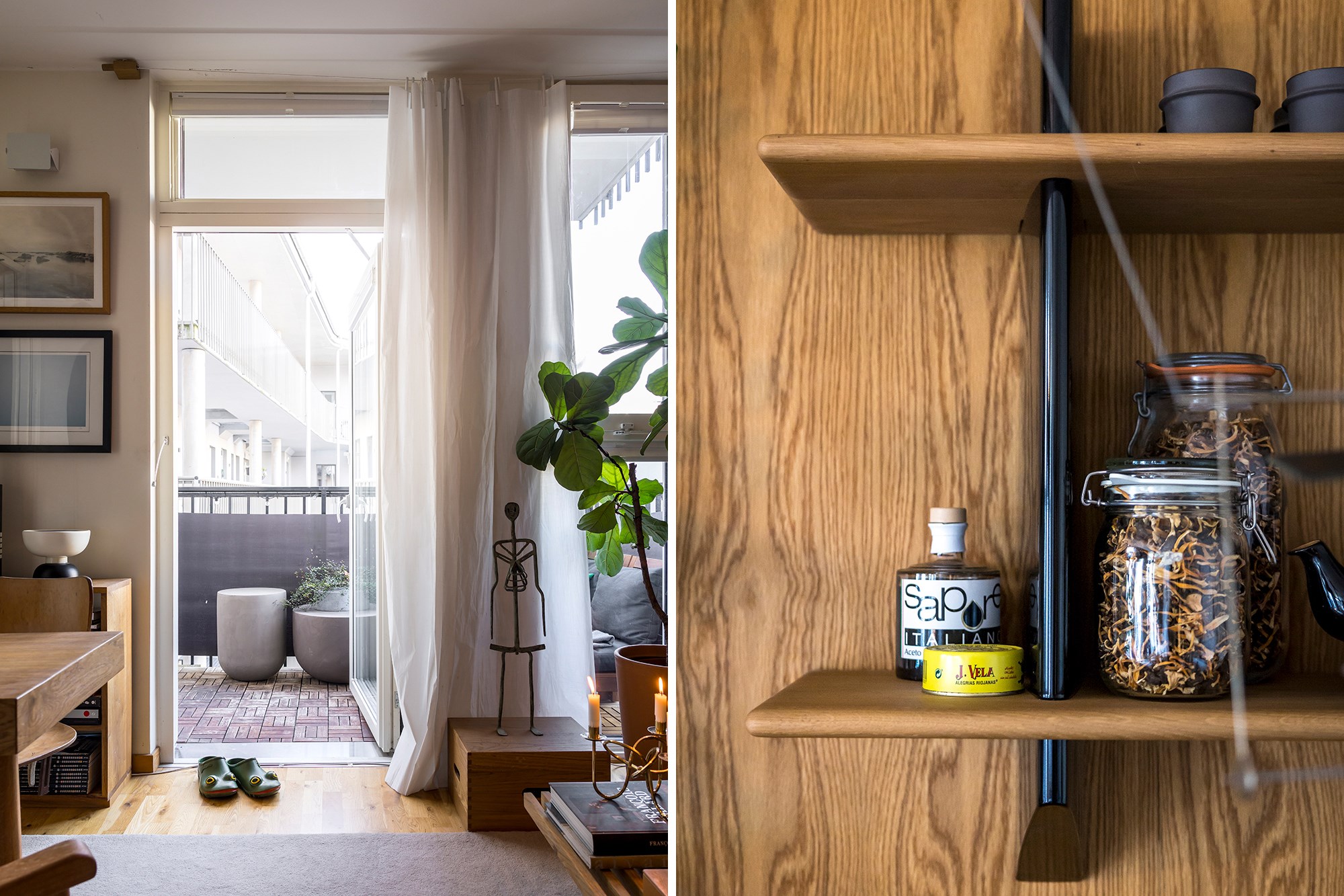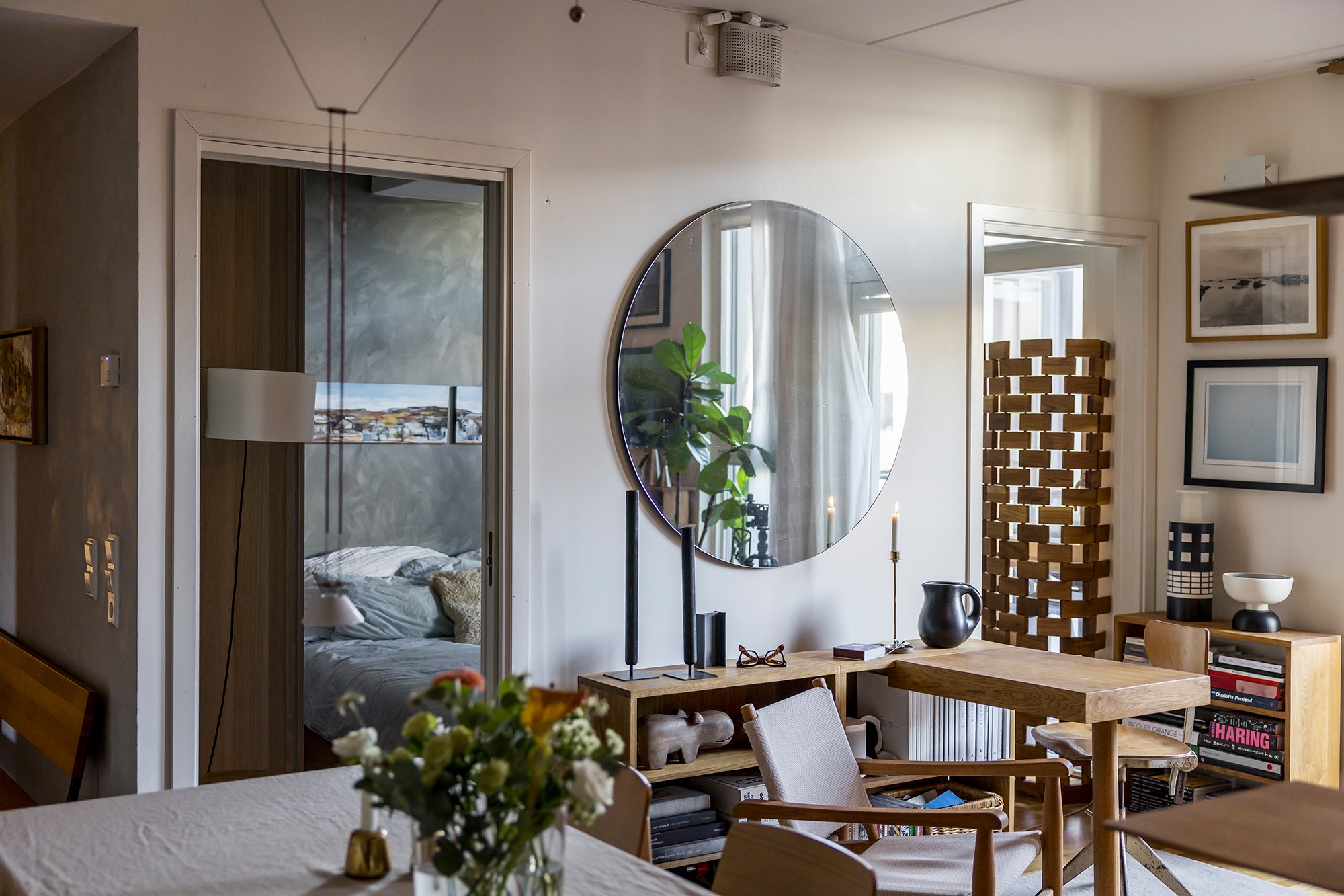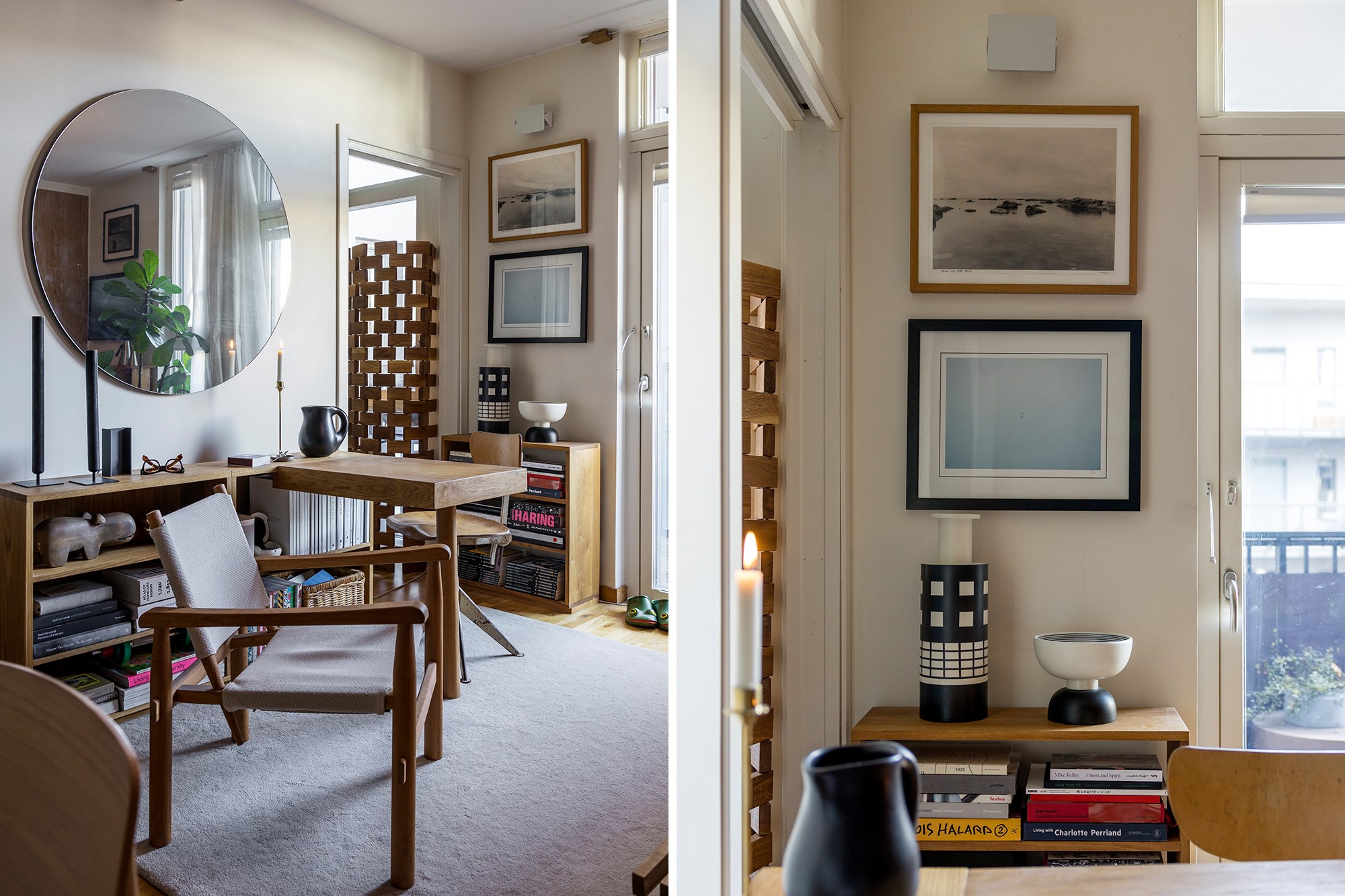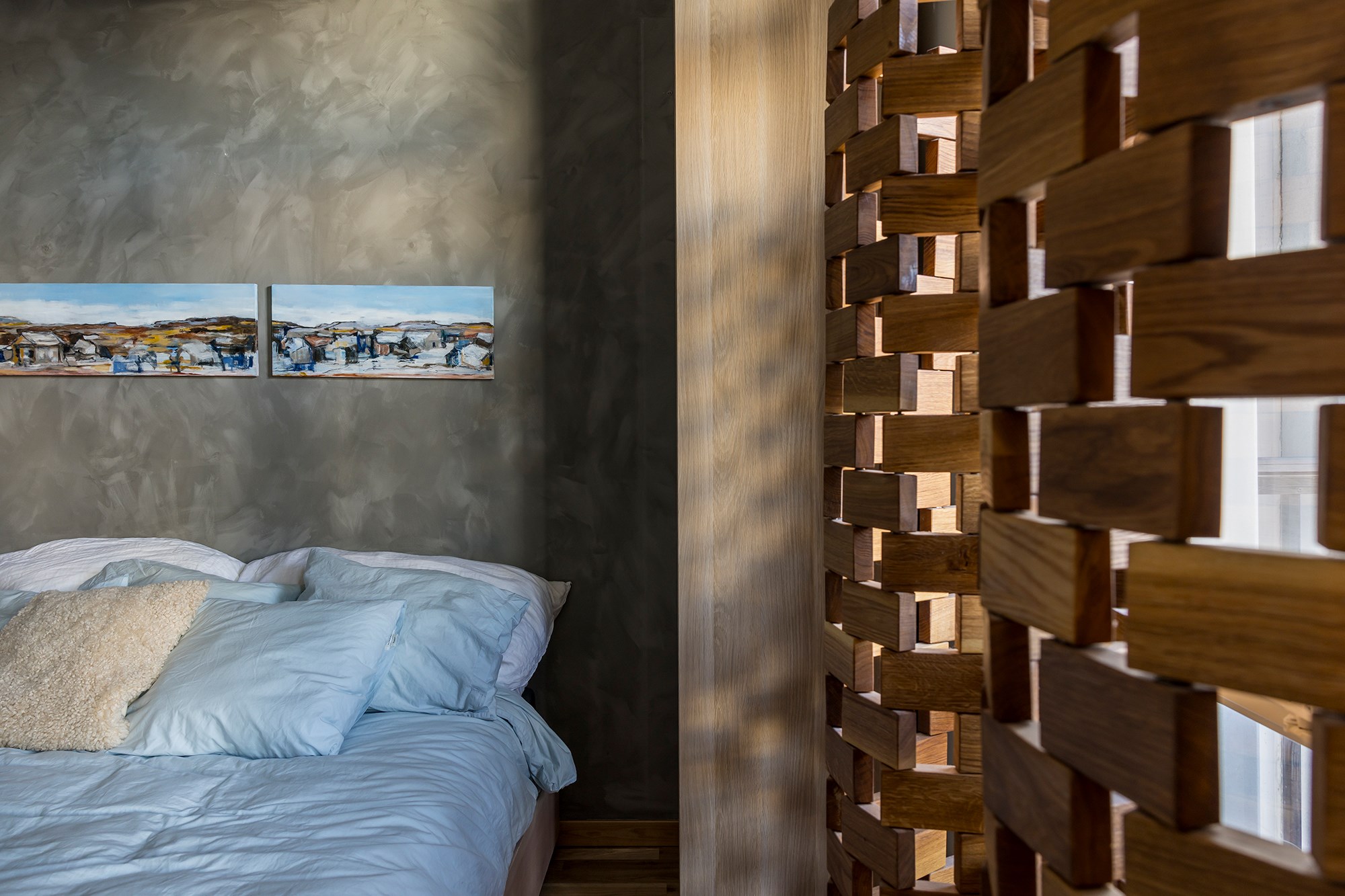 Ljusa väggar och fondvägg i grå-målad kalkfärg. Garderober.