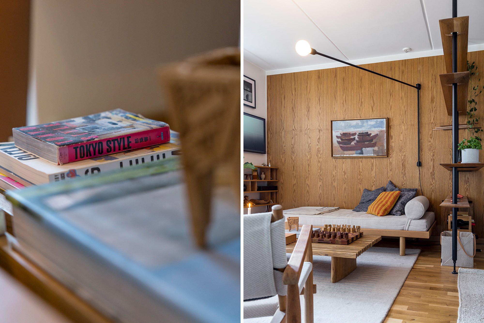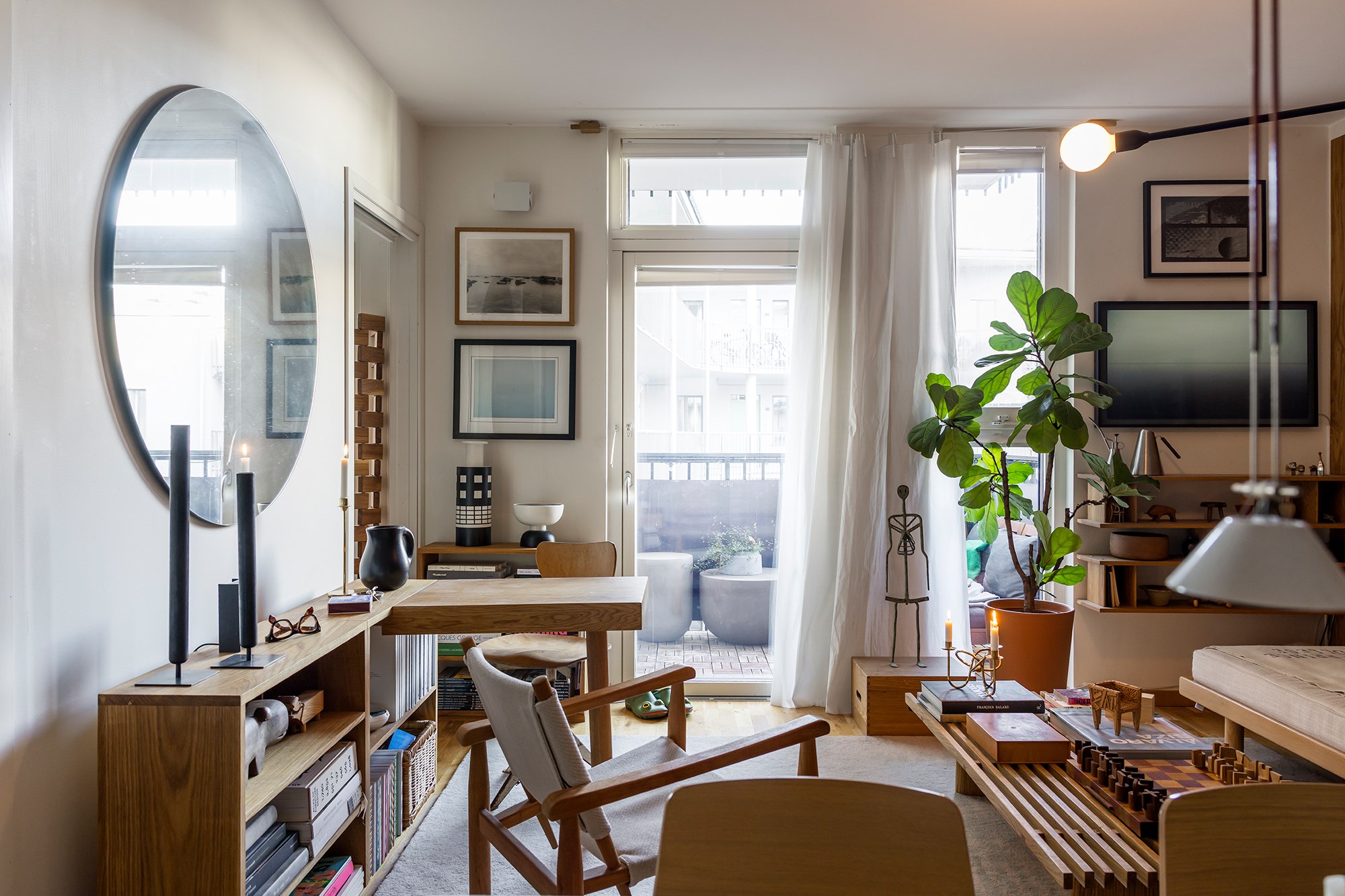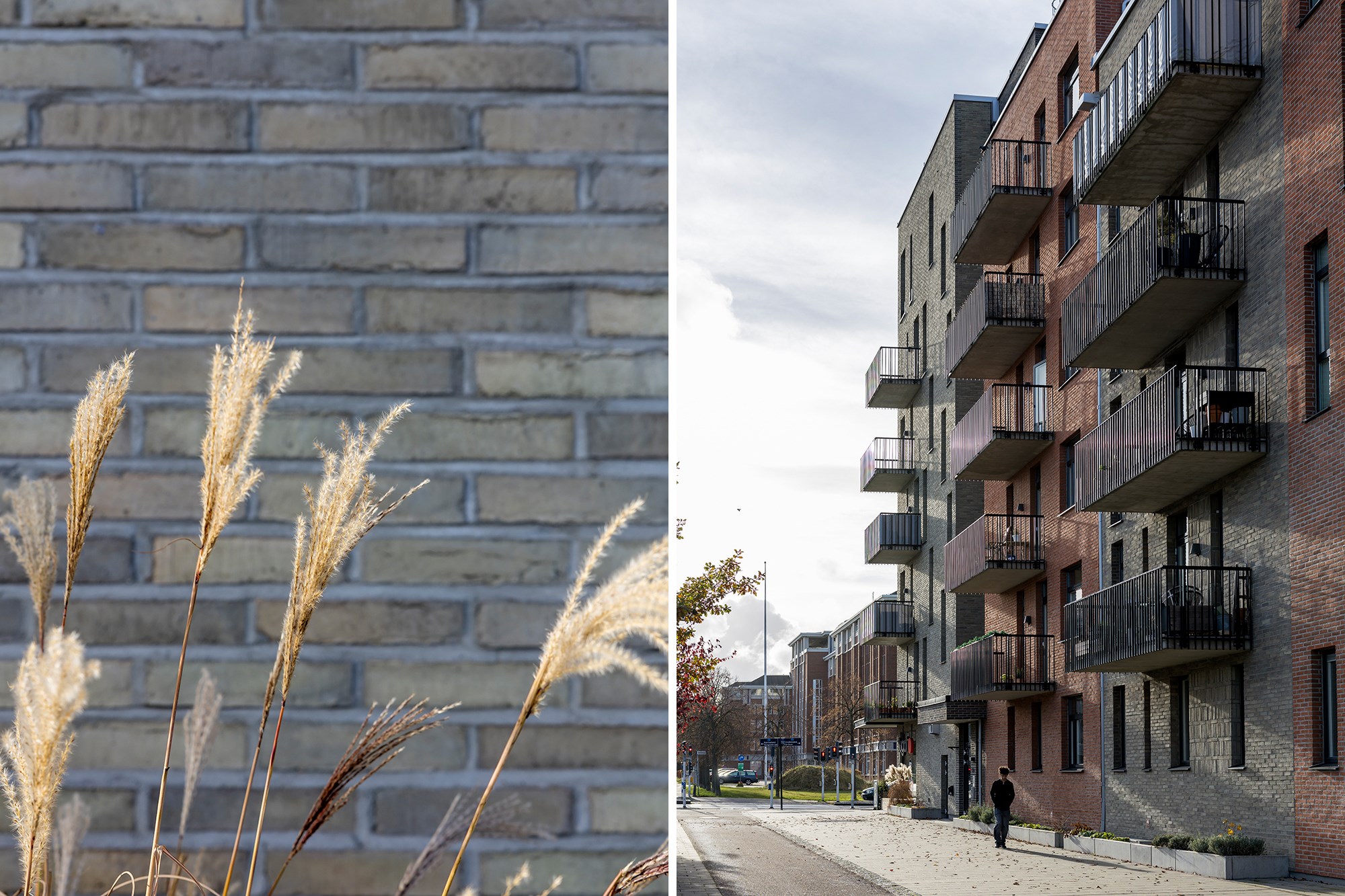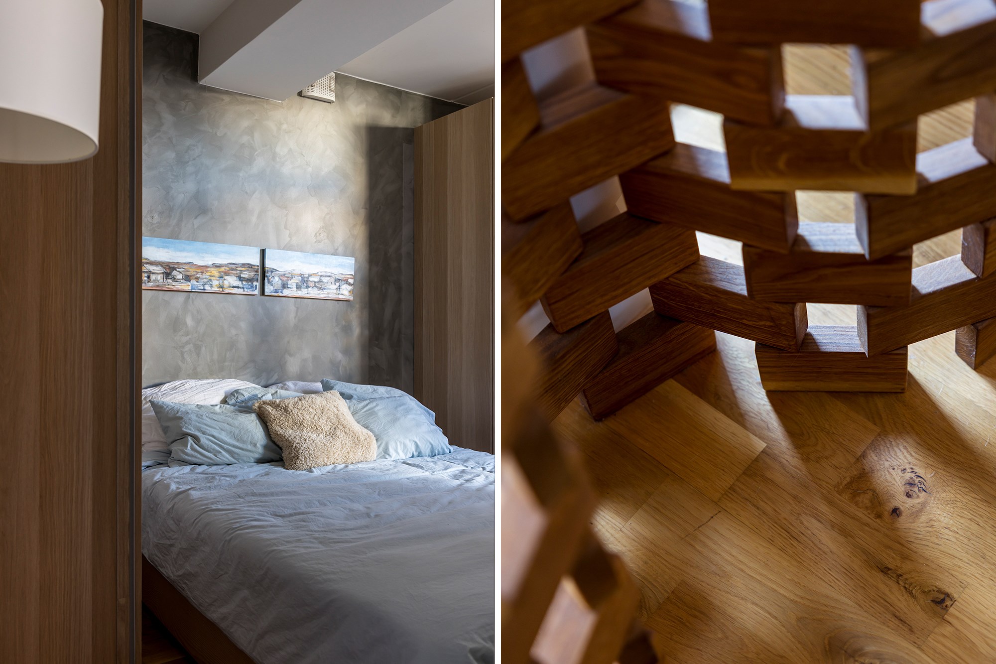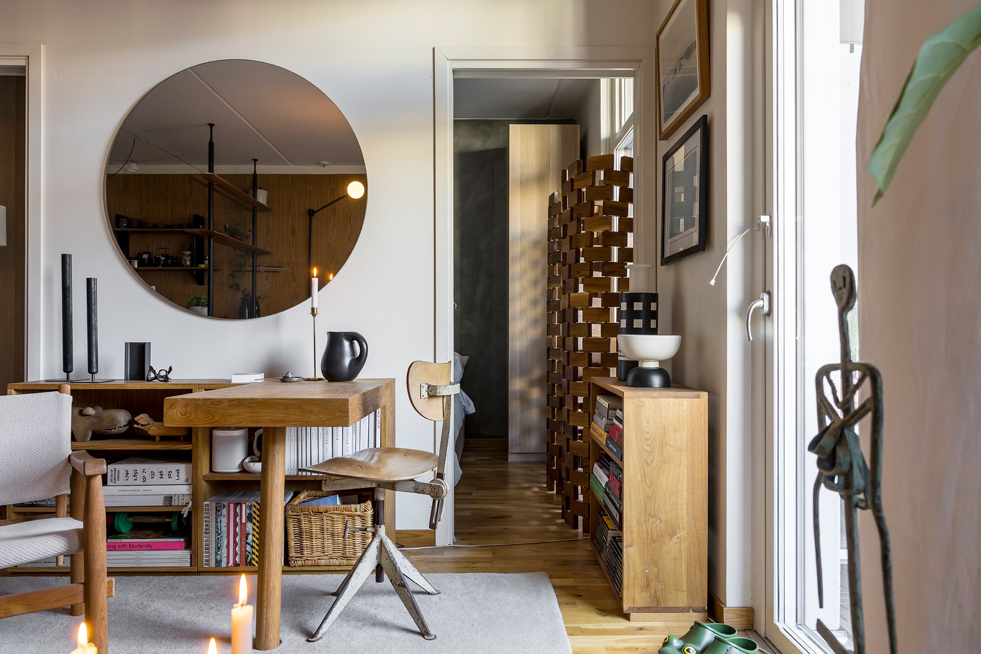 Ljusa väggar och fondvägg i grå-målad kalkfärg. Garderober.