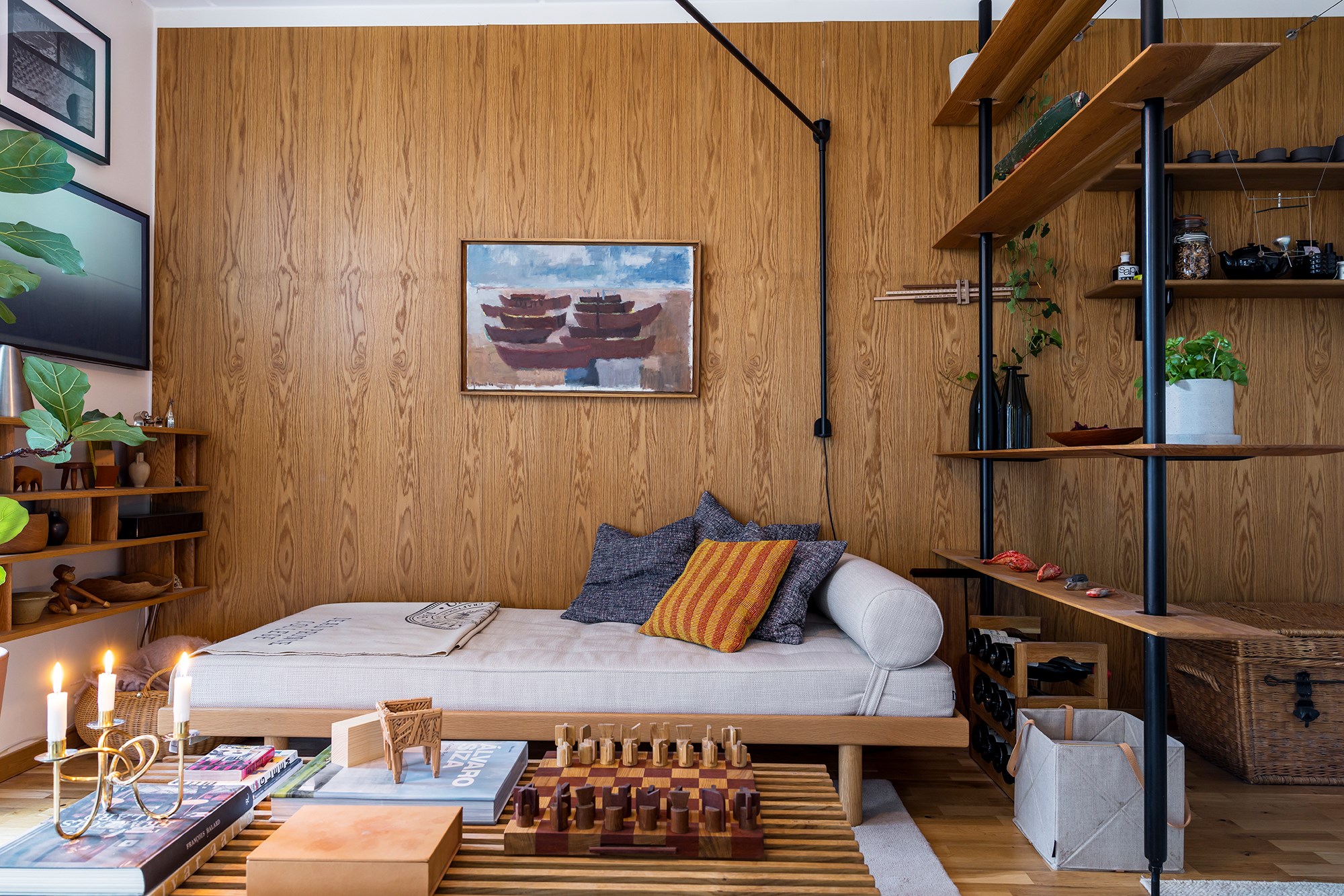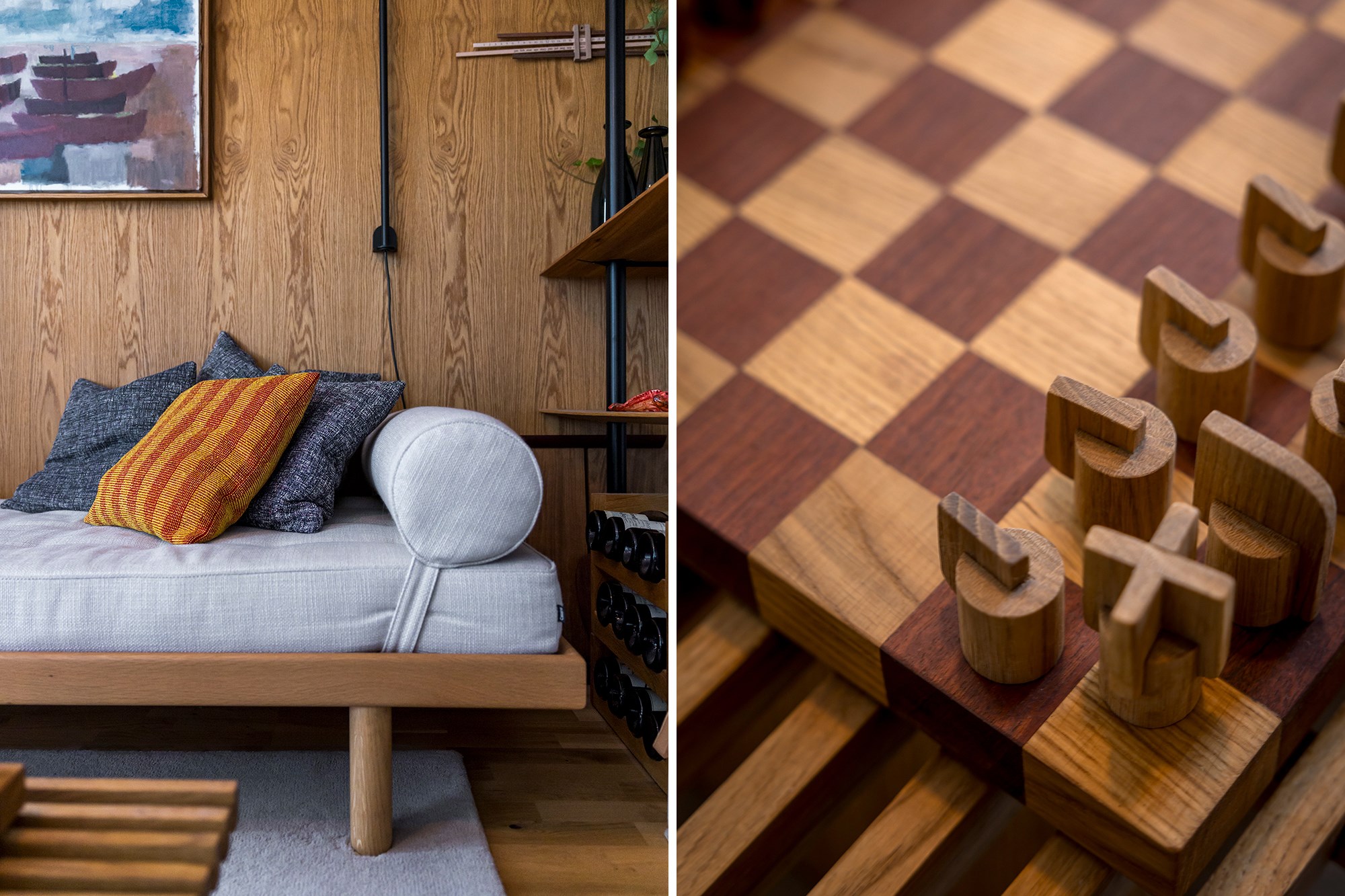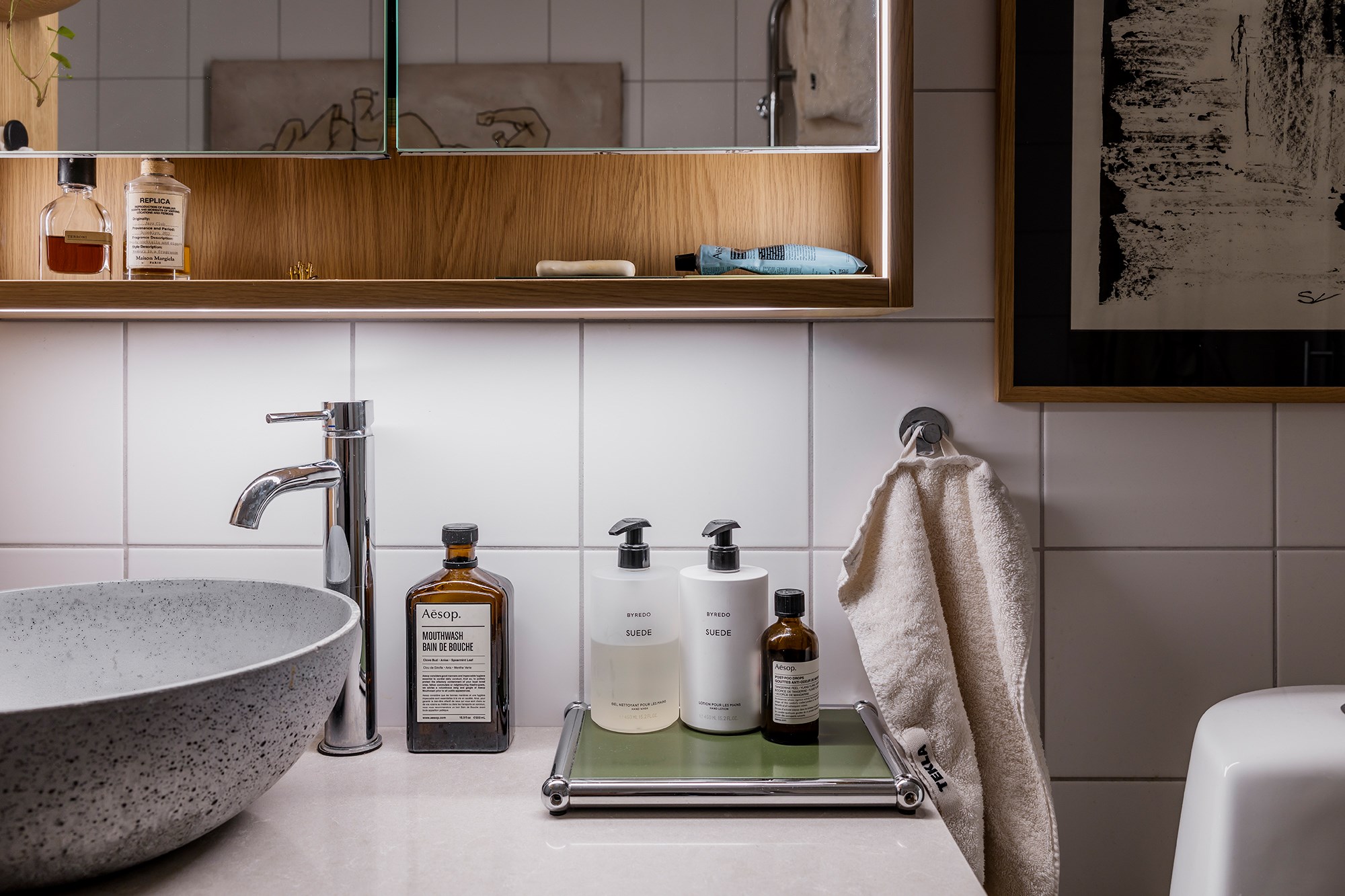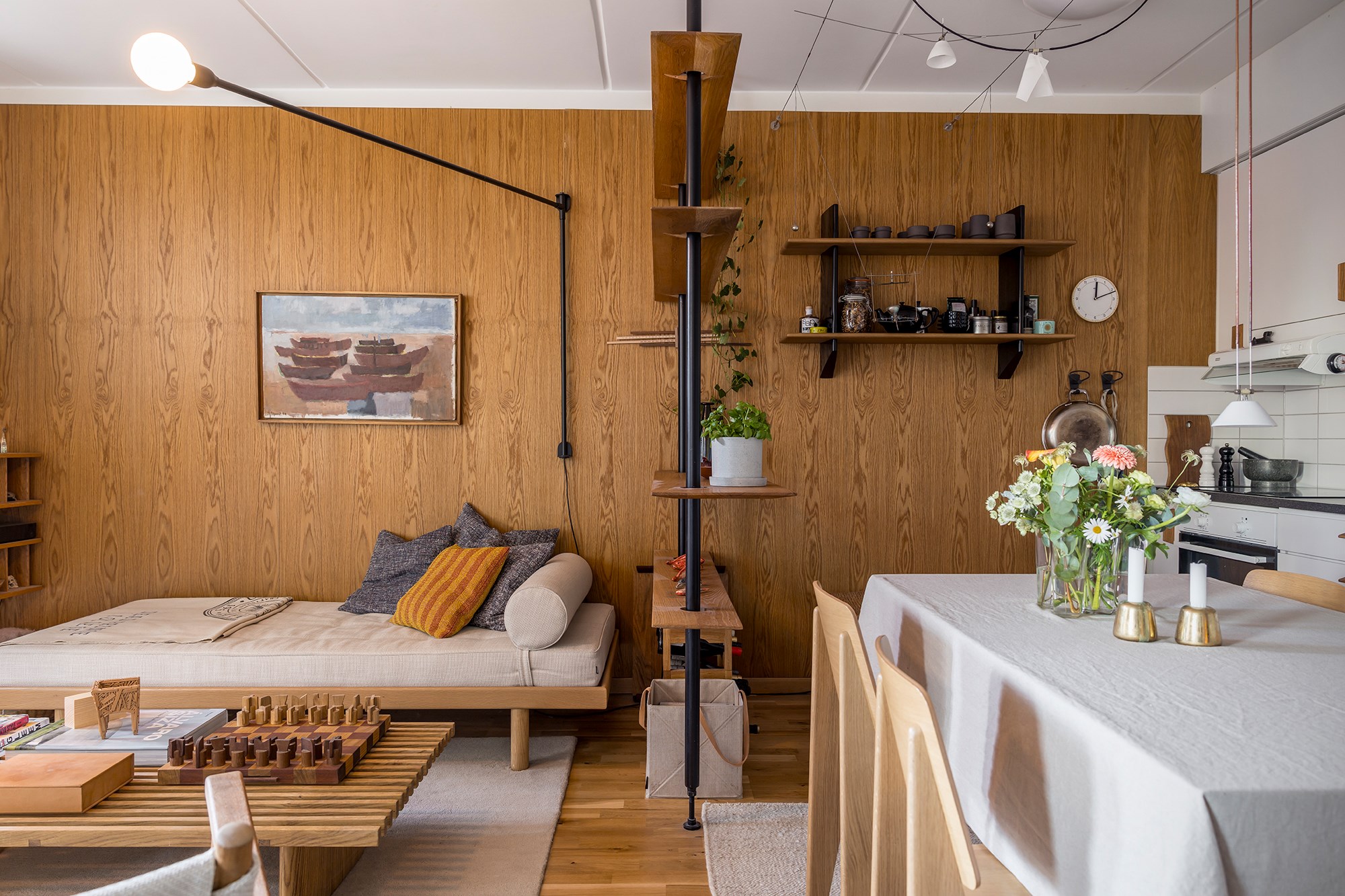 Ljusa väggar och fondvägg i grå-målad kalkfärg. Garderober.
