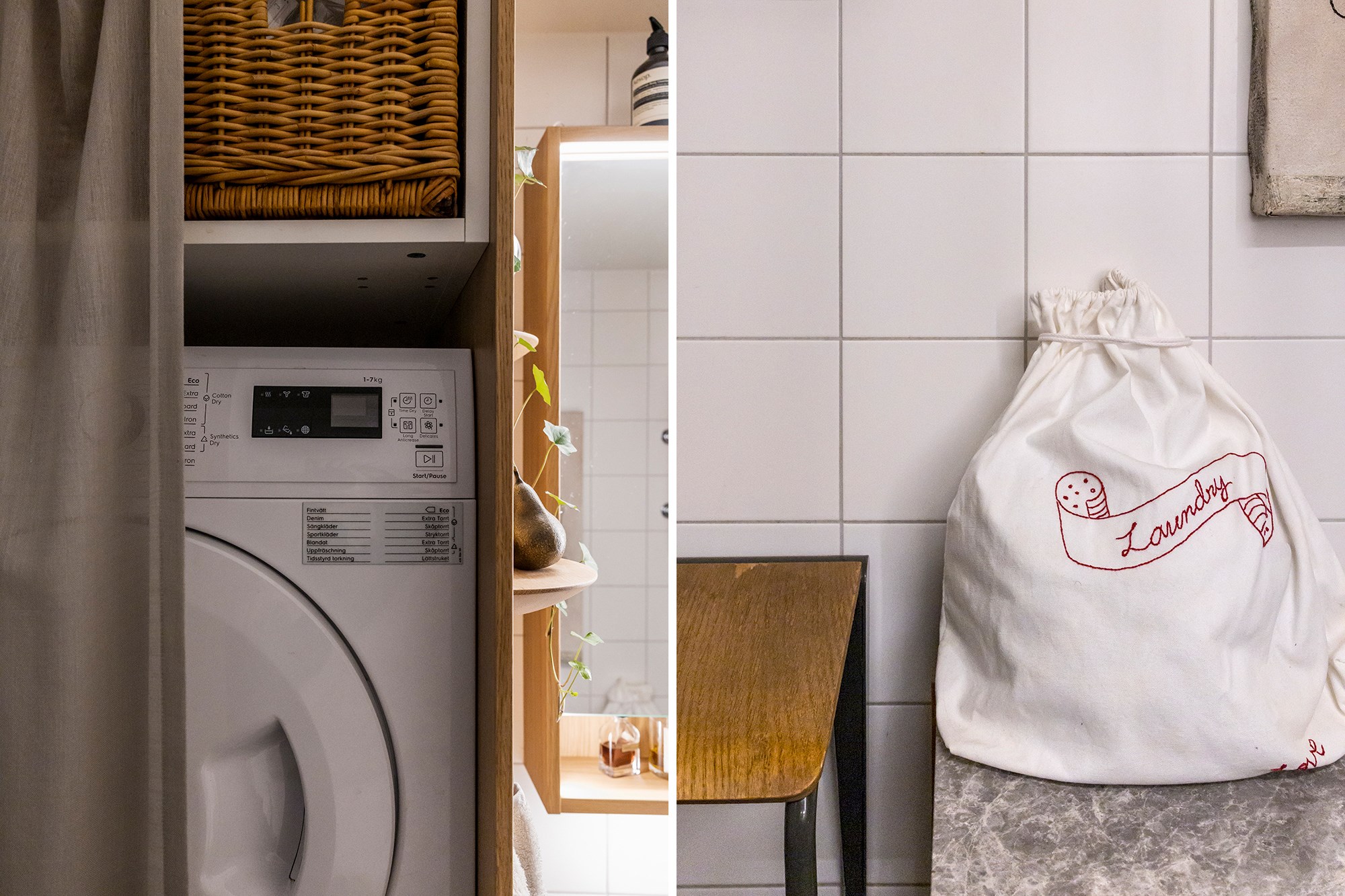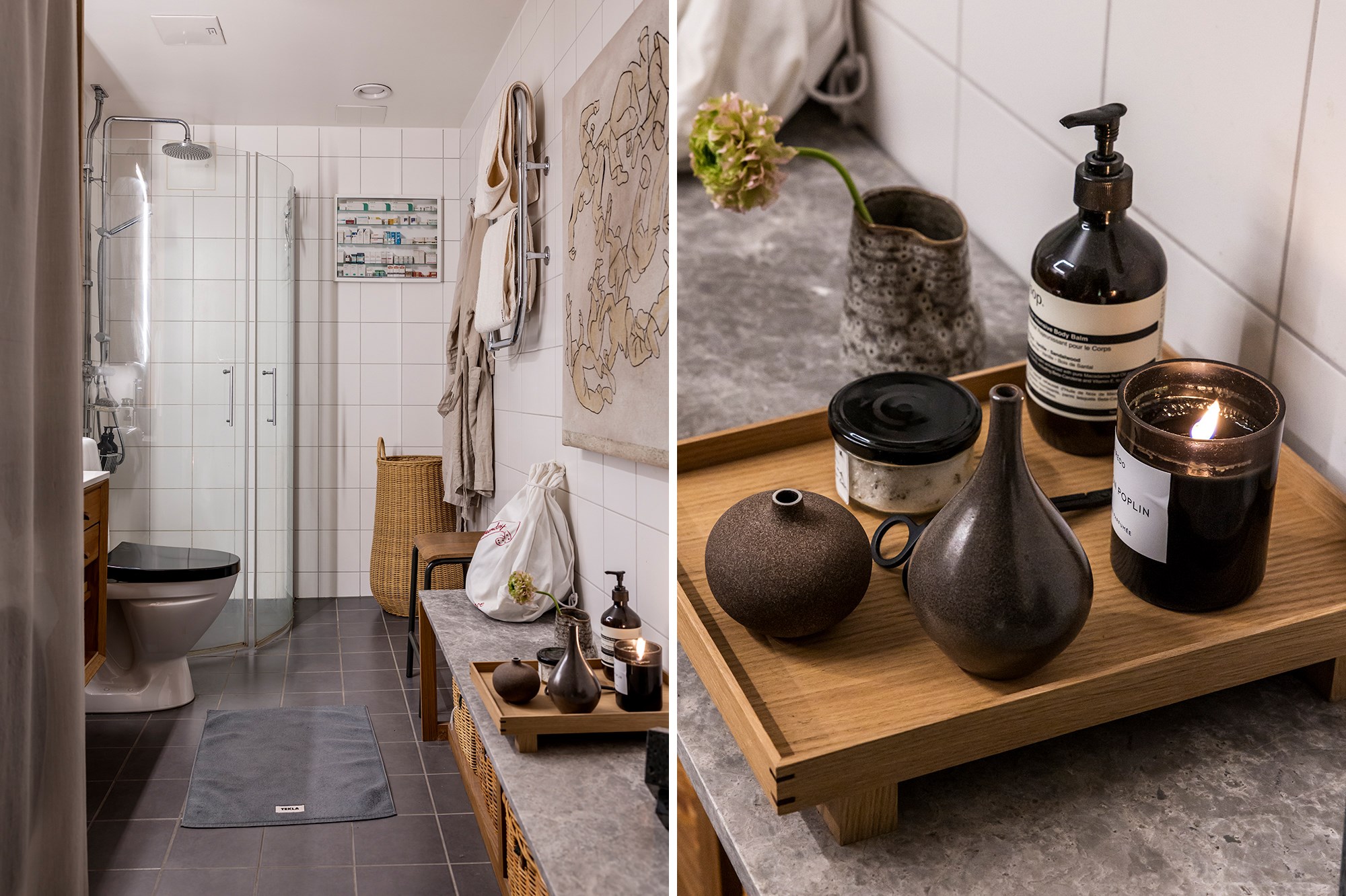 Grått klinkergolv och vit kaklade väggar. Duschväggar, WC, handfat med kommod, spegelskåp, handdukstork, kombinerad tvättmaskin och torktumlare. Golvvärme.