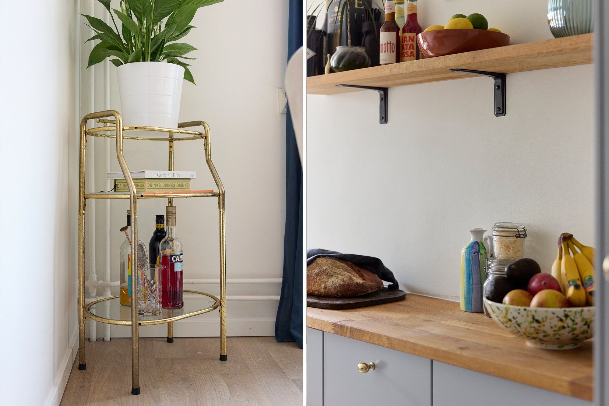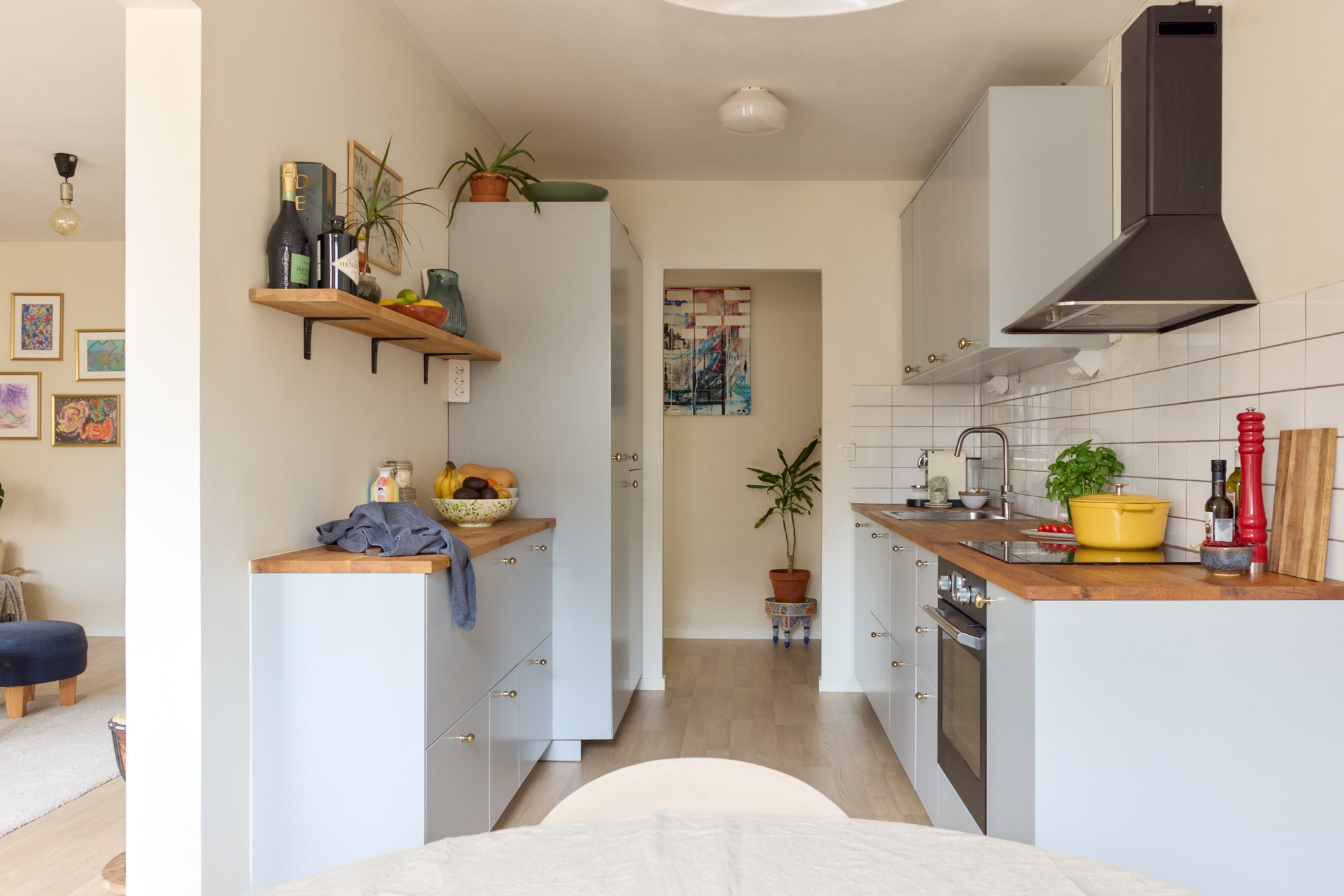 Ljust parkettgolv och ljusa väggar. Ljus köksinredning samt bänkskiva i trä. Maskinell utrustning i form av integrerad diskmaskin, spis, fläkt, frys och hel kyl. Renoverades 2023.