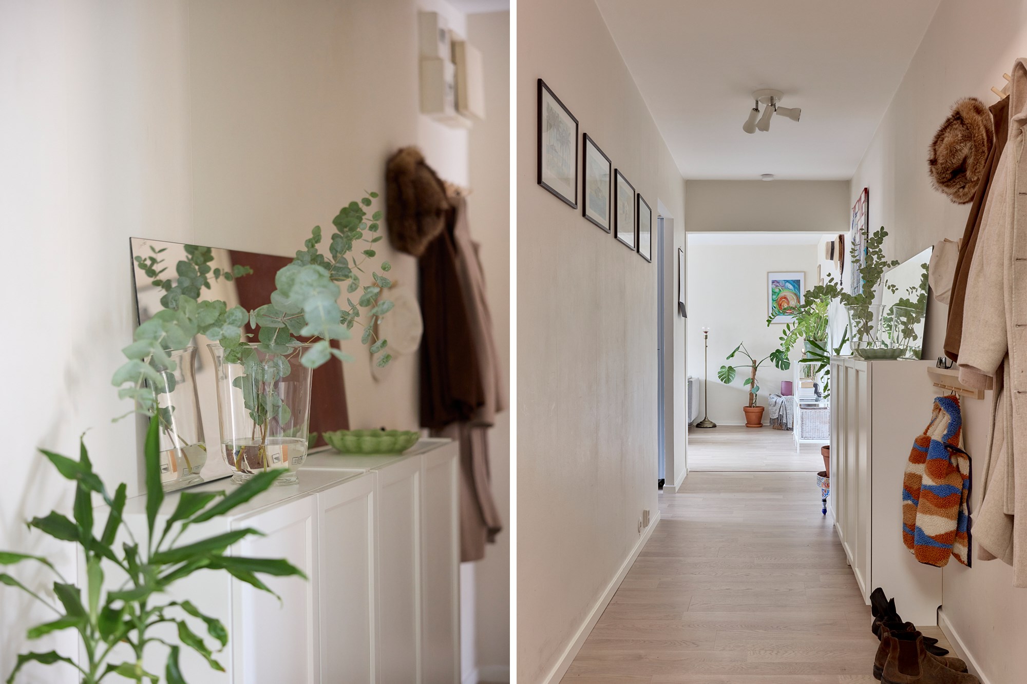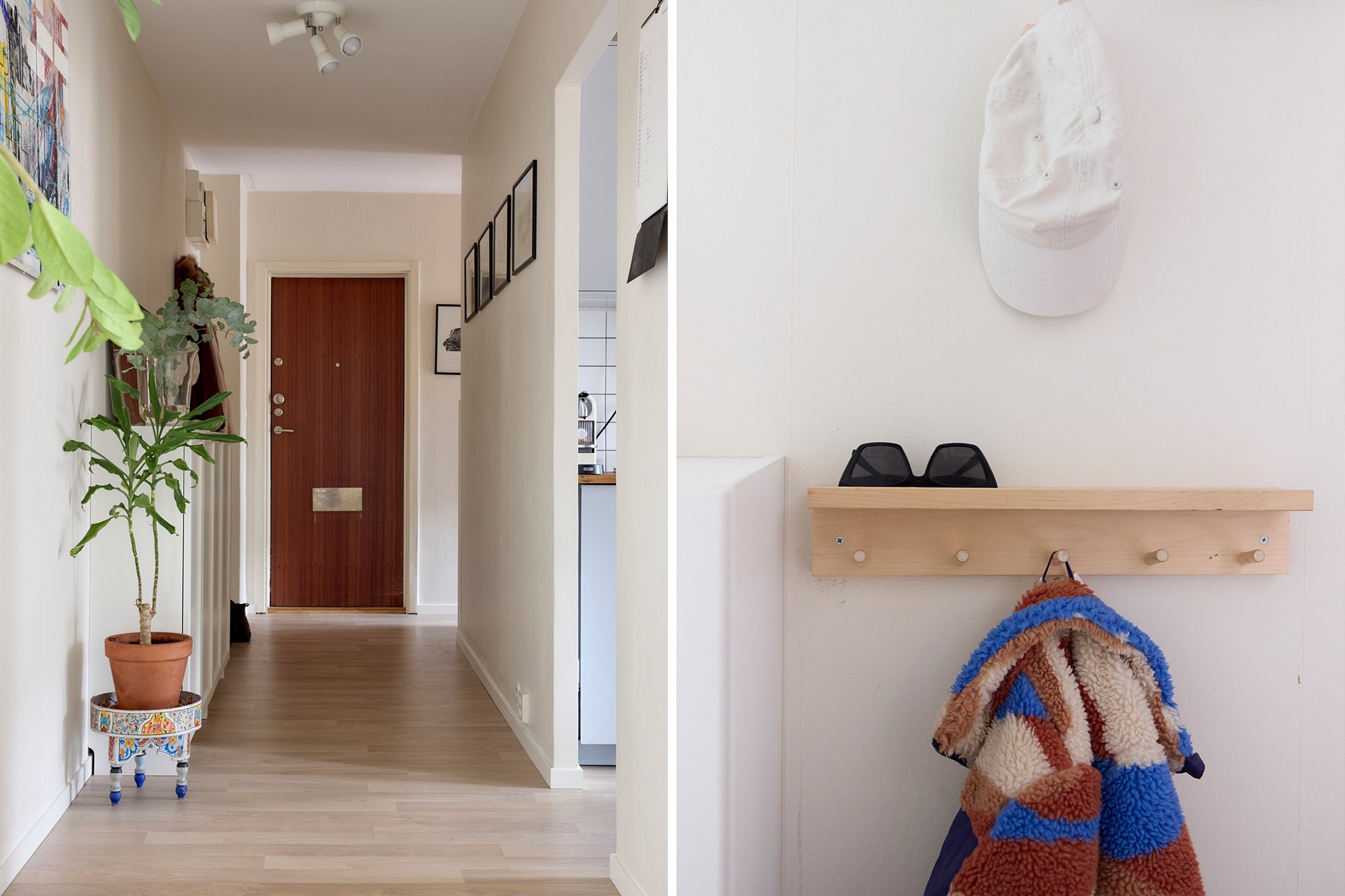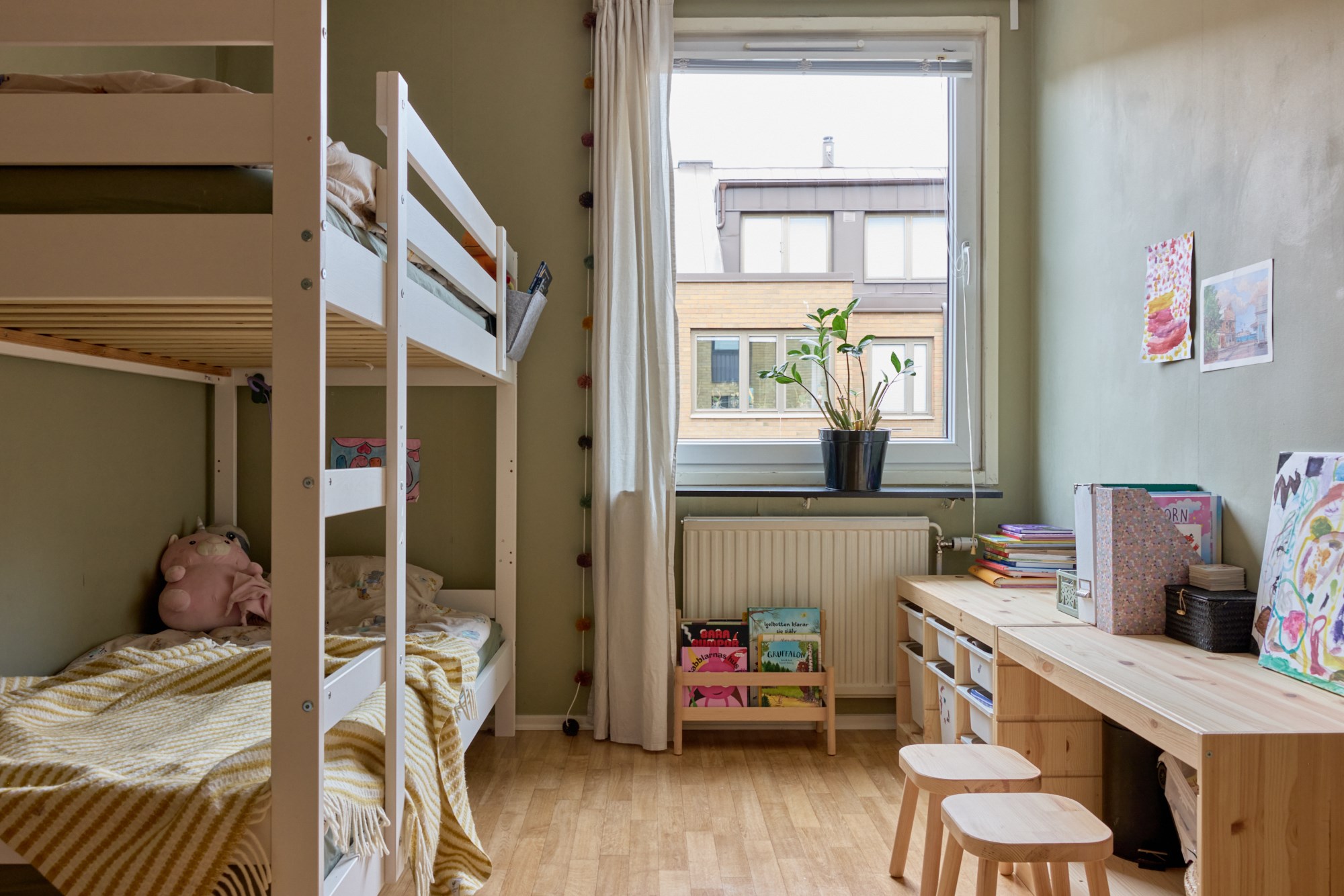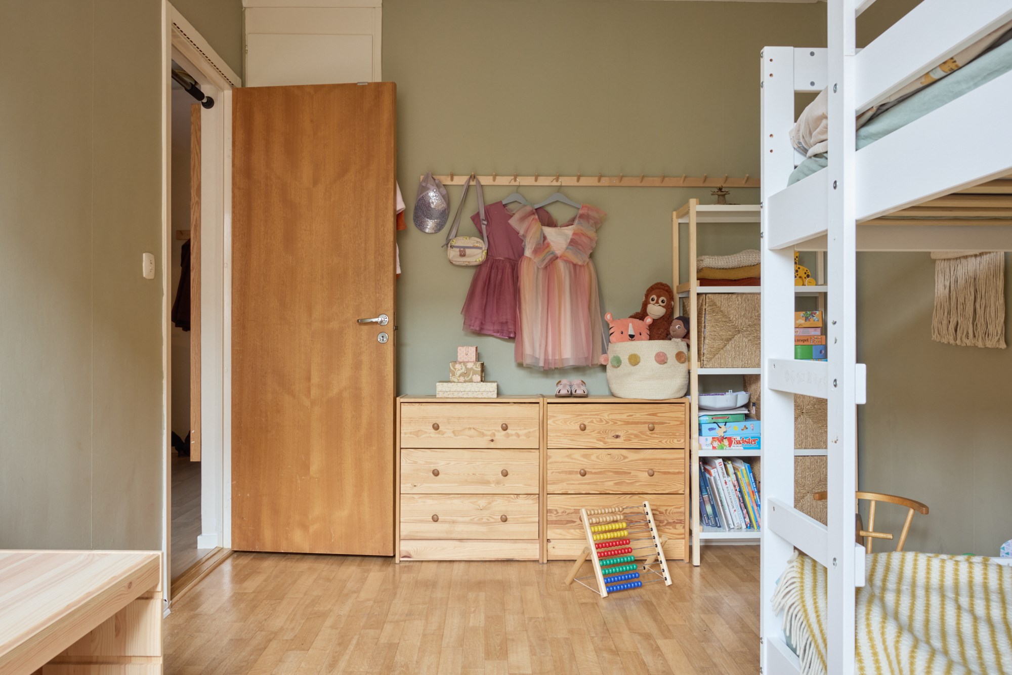 Parkettgolv och gröna väggar. Garderob.