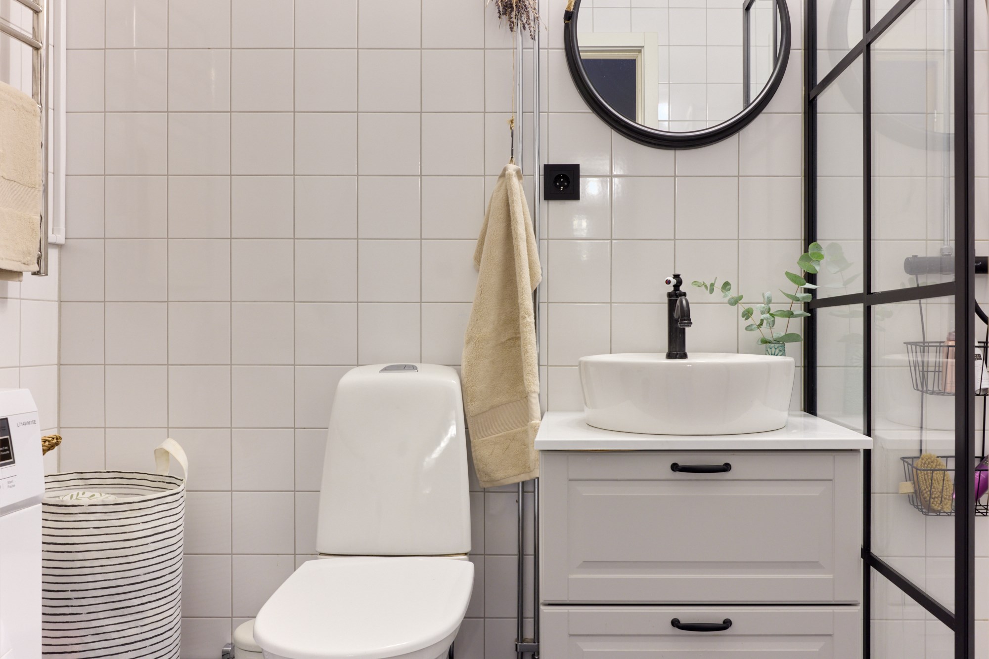 Helkaklat badrum. I badrummet finns wc, kommod, spegelskåp, tvättmaskin samt dusch med duschdörrar. Renoverades 2023. Kvalitetsdokument finns.