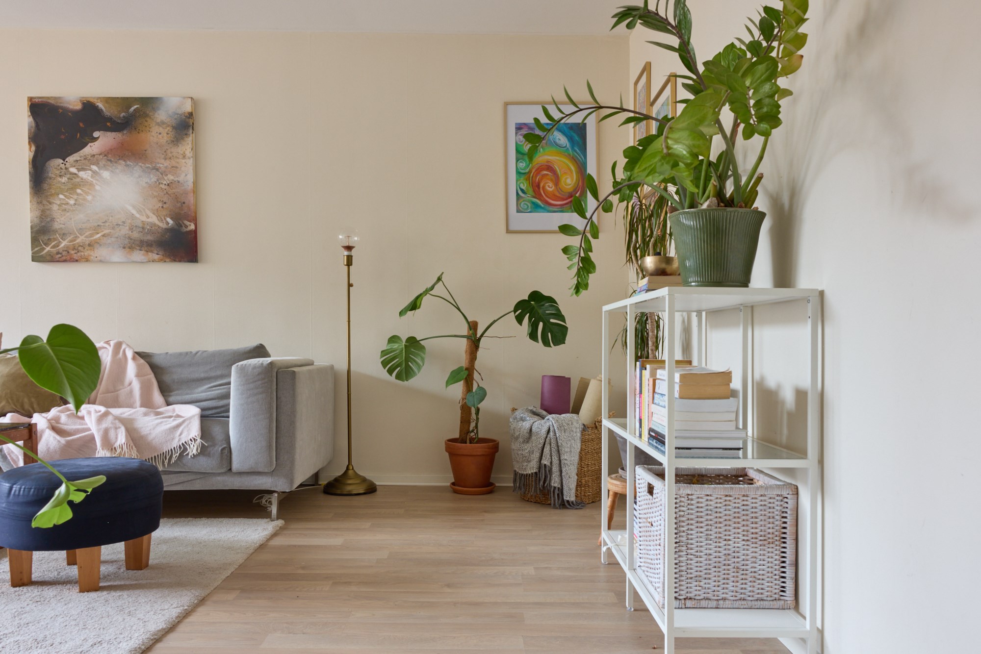 Ljus parkettgolv och ljusa väggar. Balkong i västläget.
