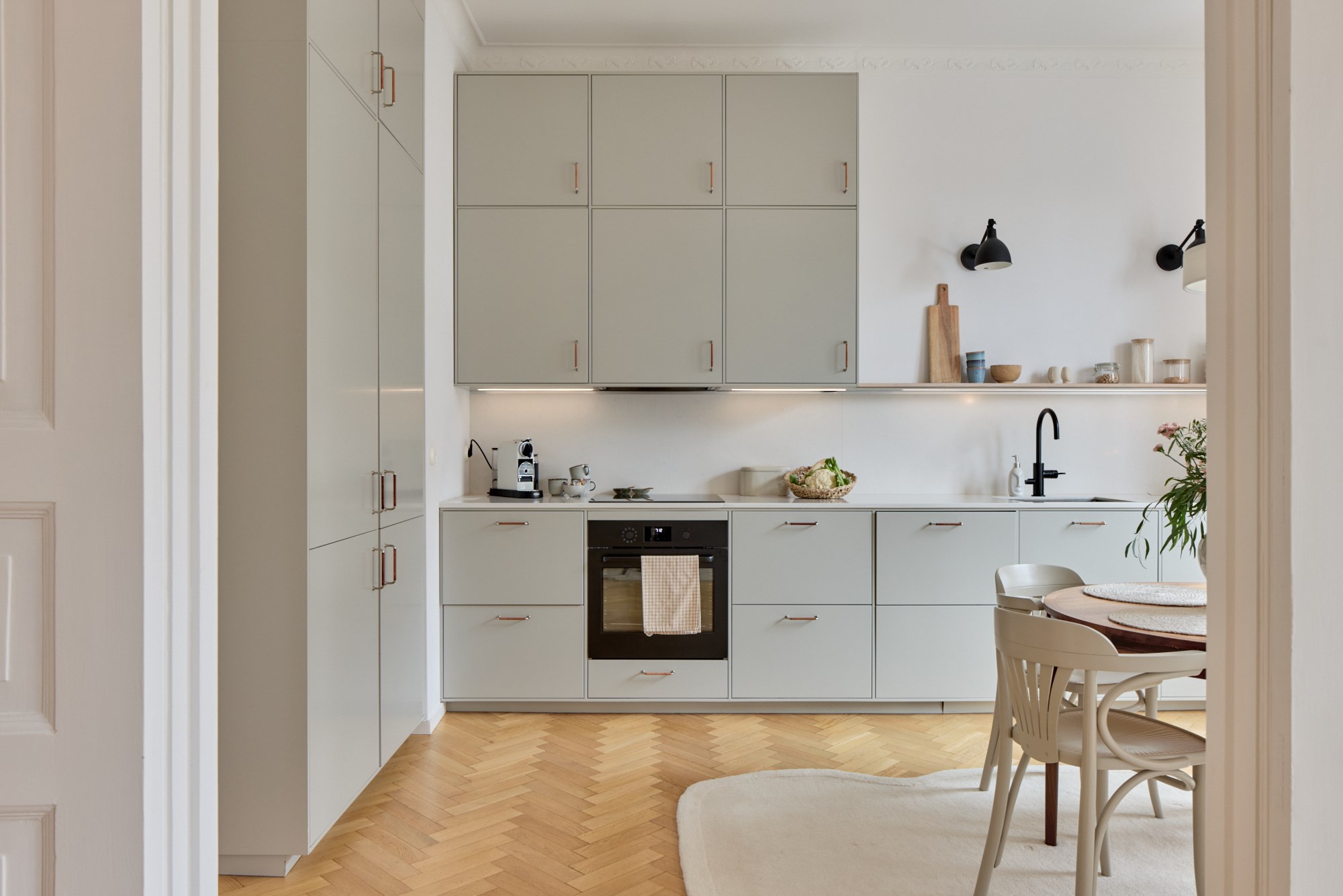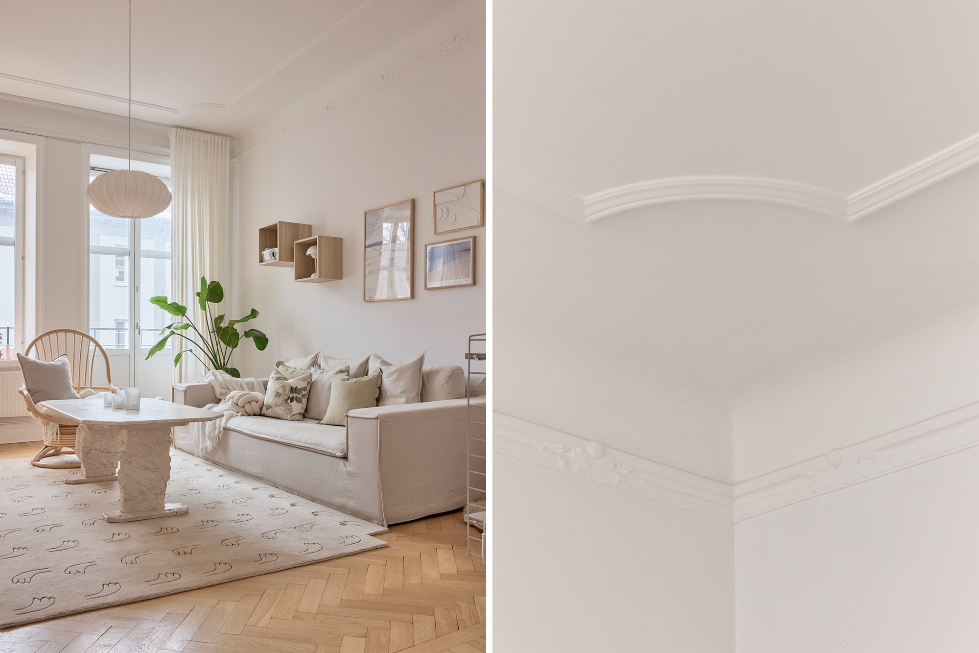Fiskbensparkett och vita väggar. Ligger i fil med köket. Balkong. Stuckatur.