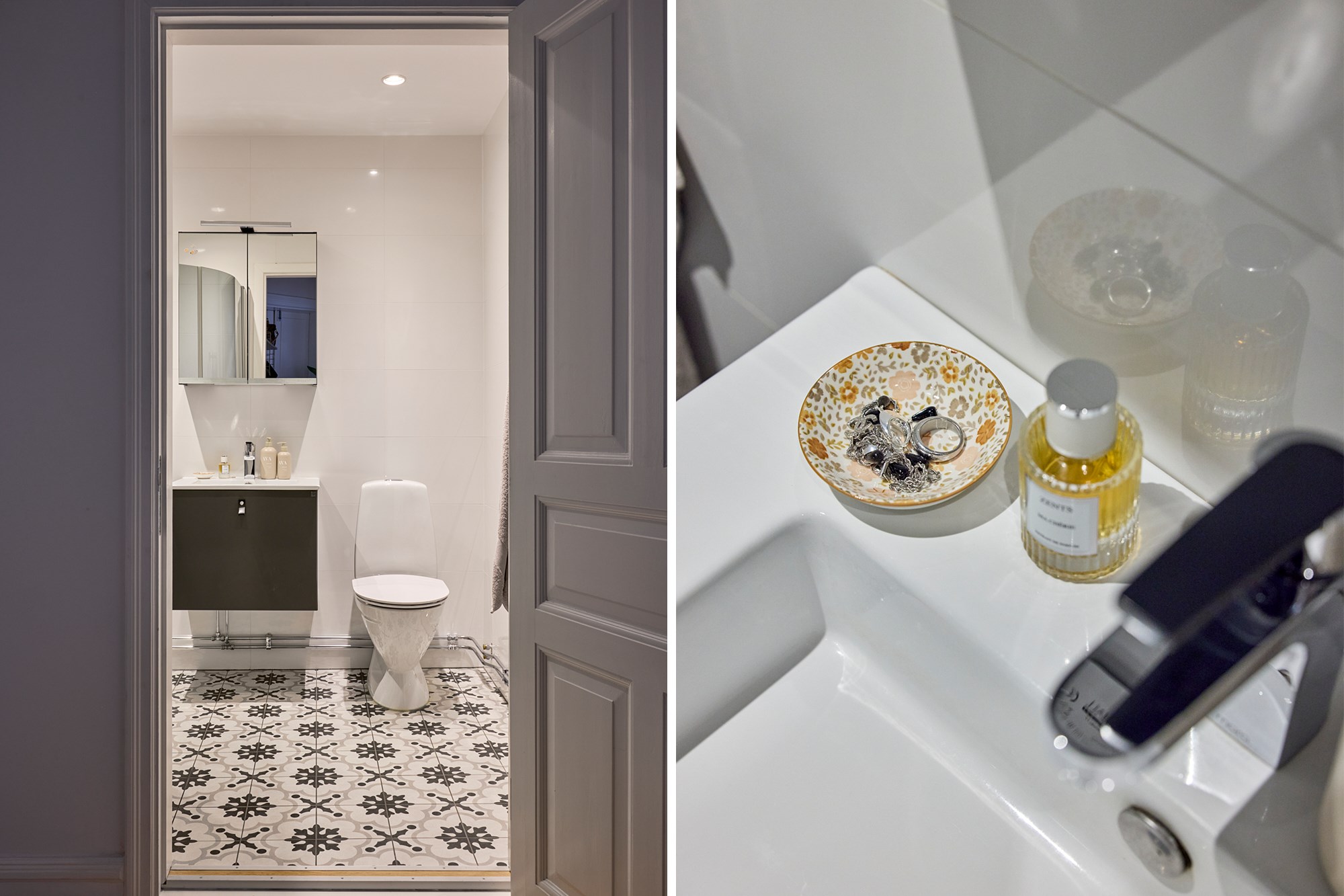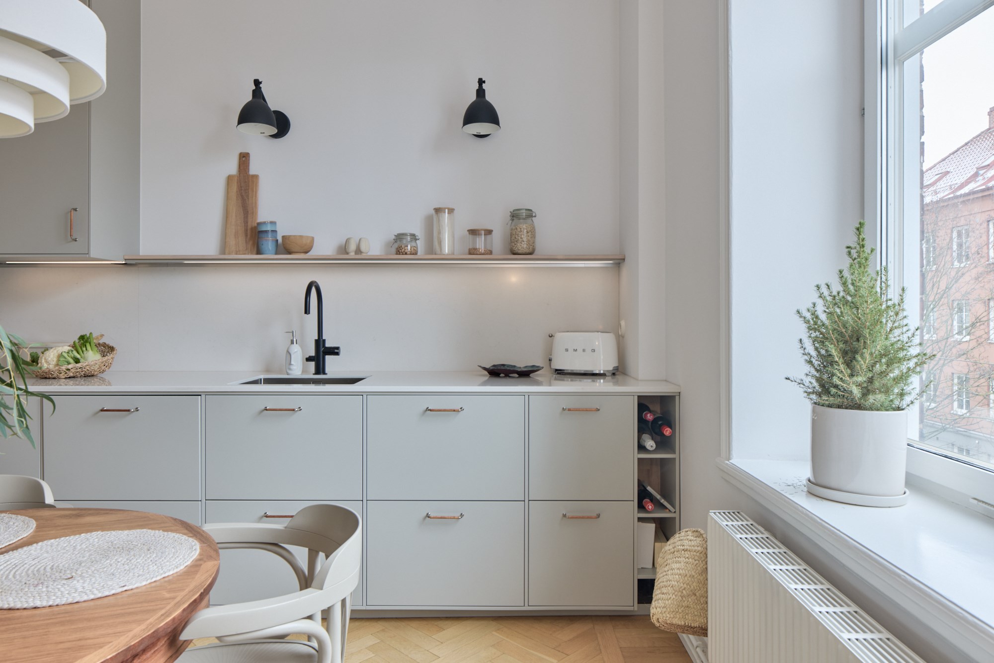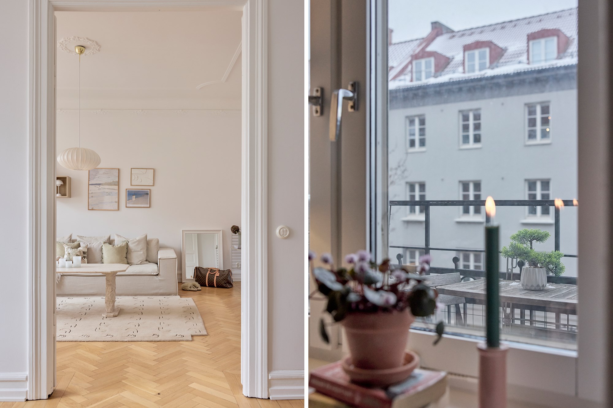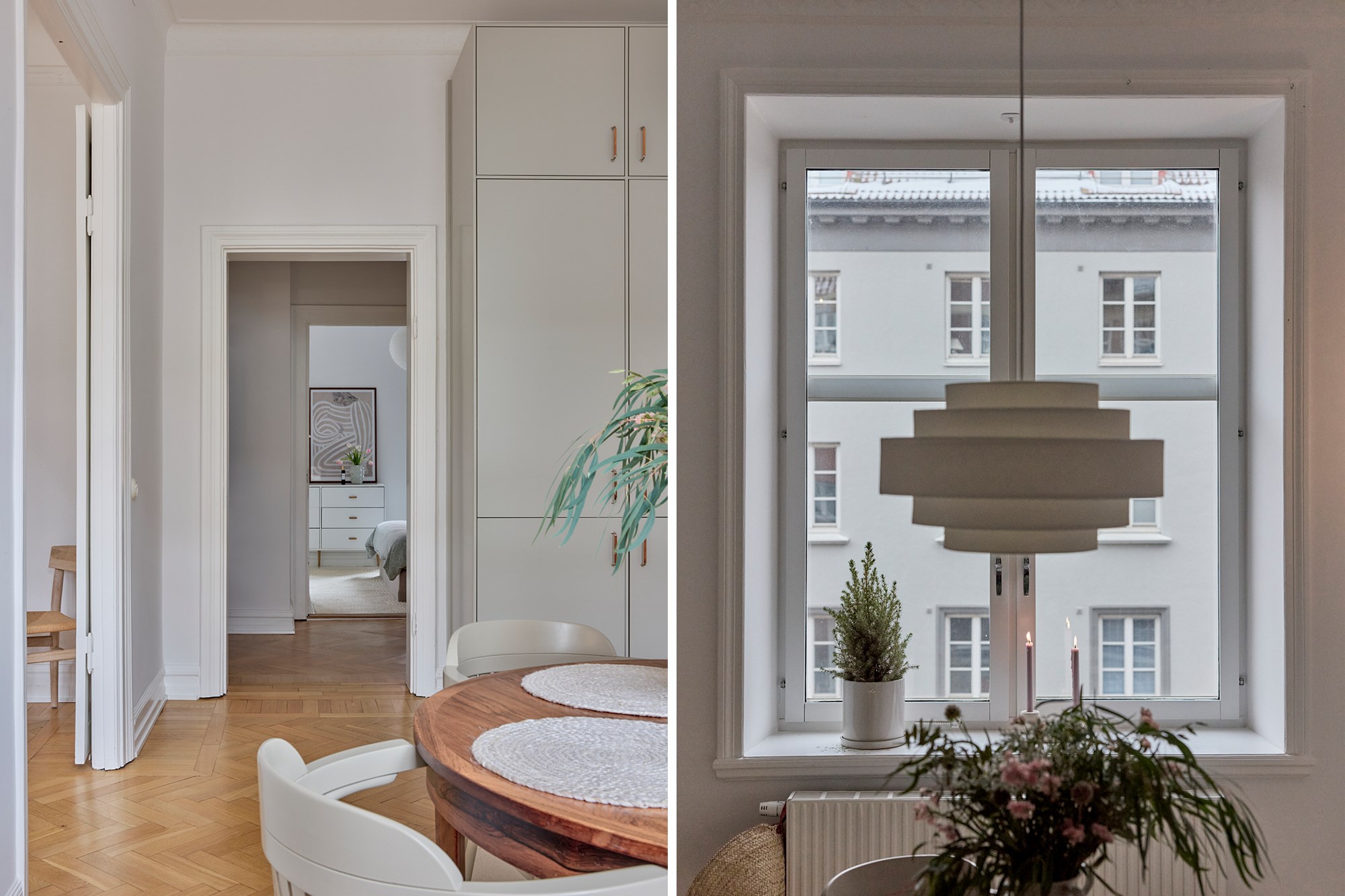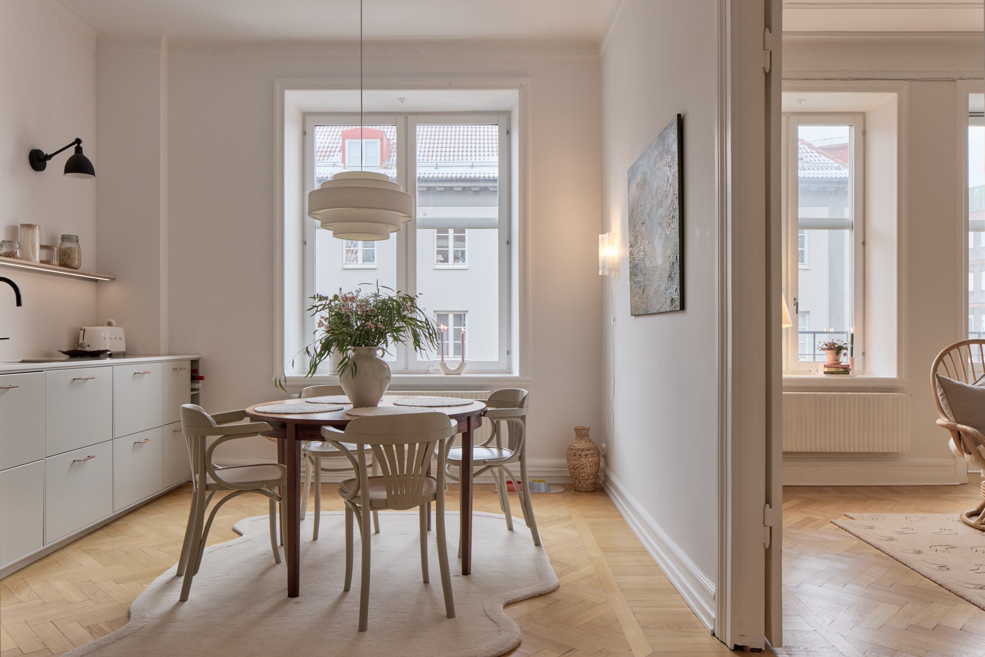 Ett lätt snöfall har bäddat in kvarteret kring Värnhemspalatset i de vitaste snöflingor; hustak, gångstråk och trädens grenar glittrar i det låga solljuset. Tre våningar upp i huset på Östervärnsgatan 2 B väntar lika krispigt vita väggar och tak i en ljuvlig sekelskiftesvåning med balkong. Eleganta två rum och kök välkomnar och byggåret 1909 ses tydligt i stuckaturer, höga lister och de manshöga fönstren. Solen skiner in och förgyller alla väl omhändertagna detaljer i våningens djupa siktlinjer. Sällskapsrum och kök med volym ligger ut mot den lugna tvärgatan, dubbeldörrar delar av de fint möblerade rummen. Det strama, moderna köket har mjukt grå inredning och handtag med inslag av läder samt ljus bänkskiva i kvartskomposit och svarta detaljer, en fin kontrast till våningens pampiga arkitektur. Här sätter man sig gärna ner kring det runda matbordet vid fönstret! I genomgående läge, inåt gården ligger sovrummet med garderober och fransk balkong, även här ger de vita väggarna en luftig och härlig atmosfär. Utanför lockar Värnhems alla matställen och trevliga fik, från torget intill blir pendlingen enkel. Välkomna till en vacker våning i anrikt hus!