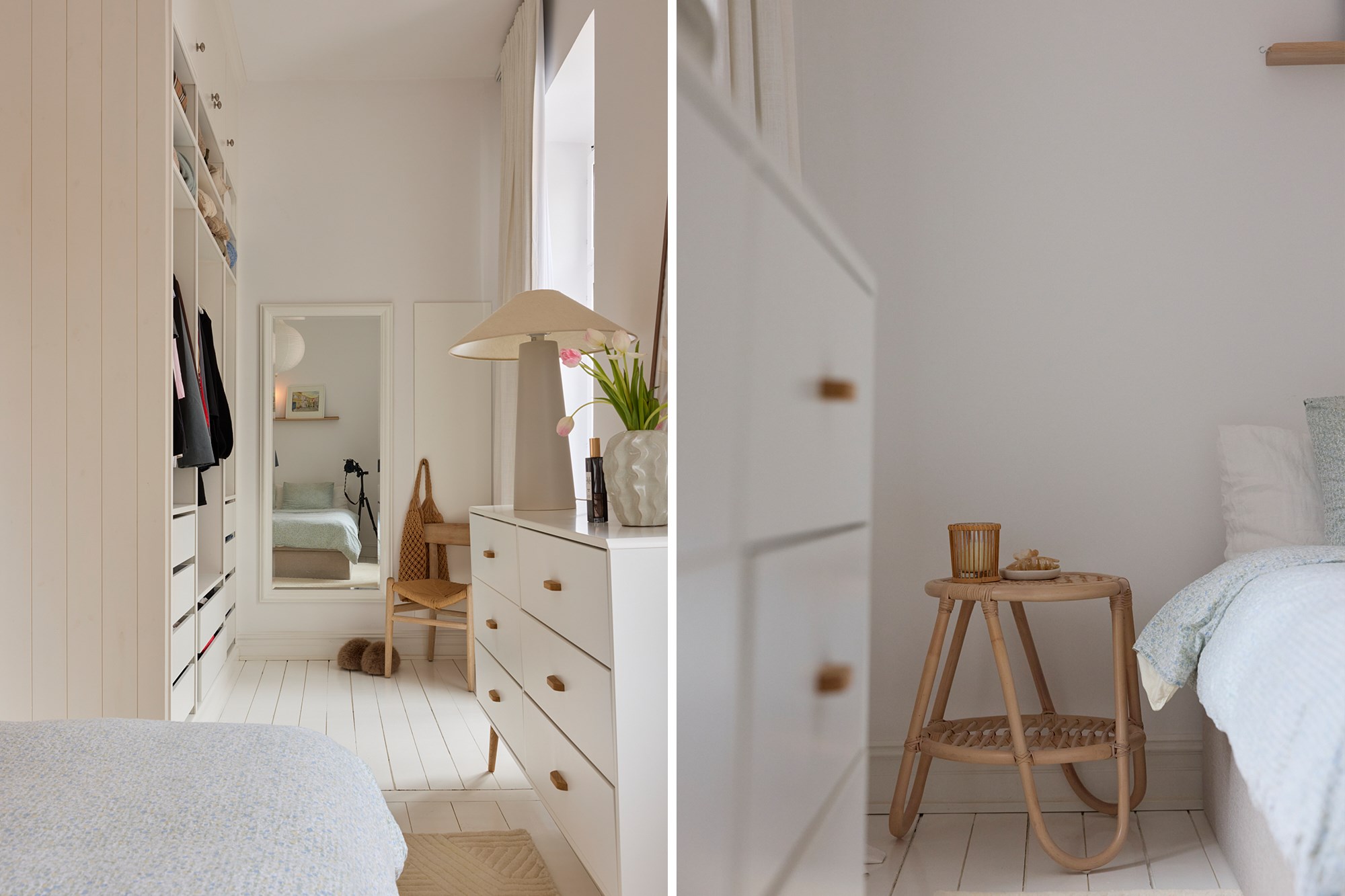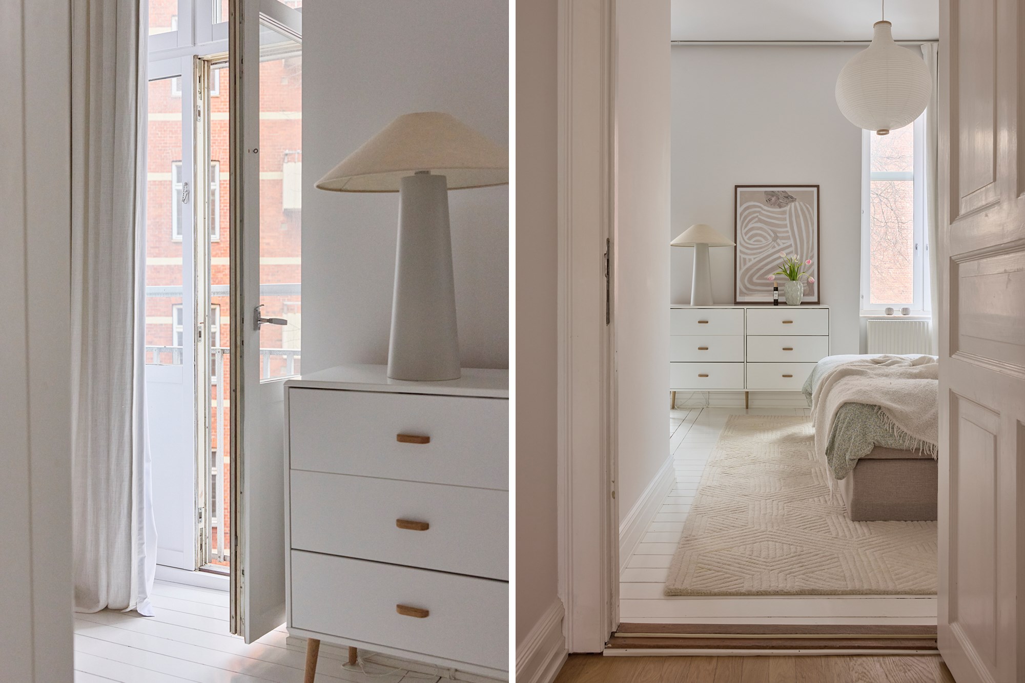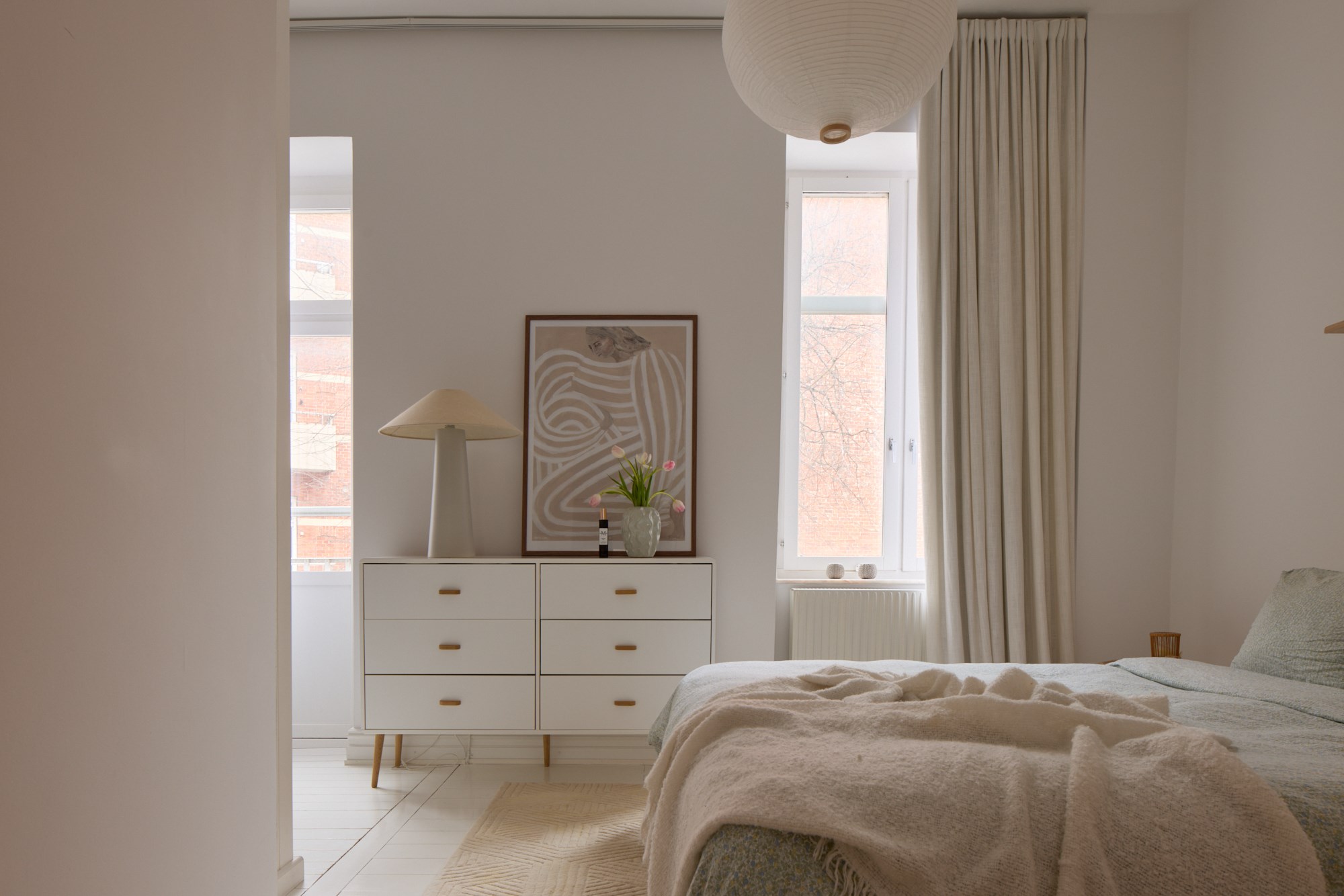 Brädgolv och vita väggar. Generöst sovrum med garderobsvägg och walk-in-closet känsla. Fransk balkong. Beläget mot gården.