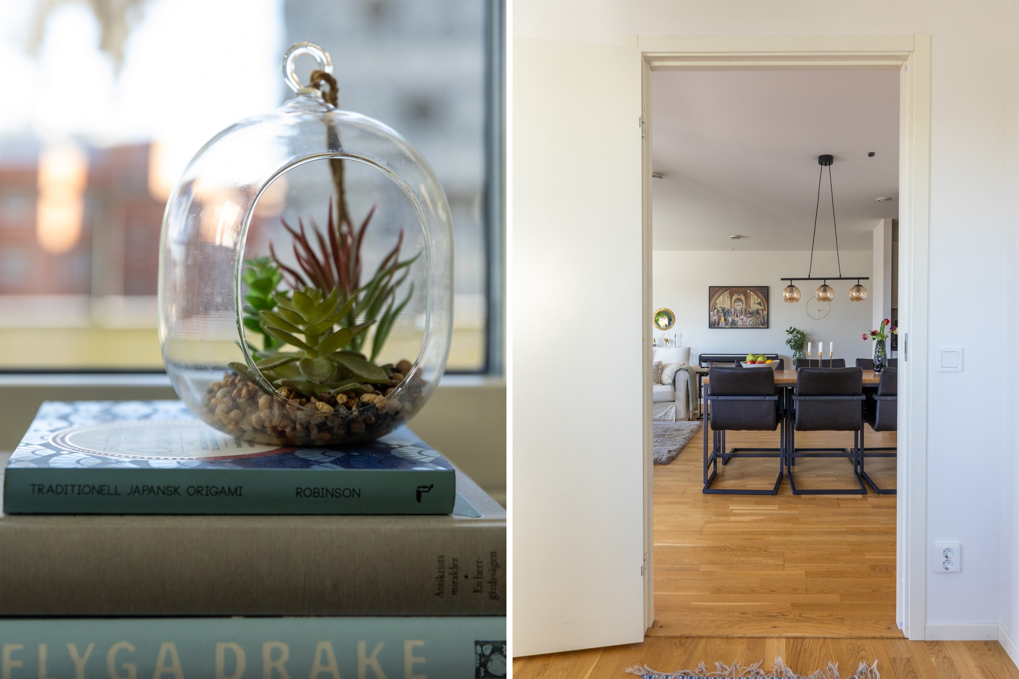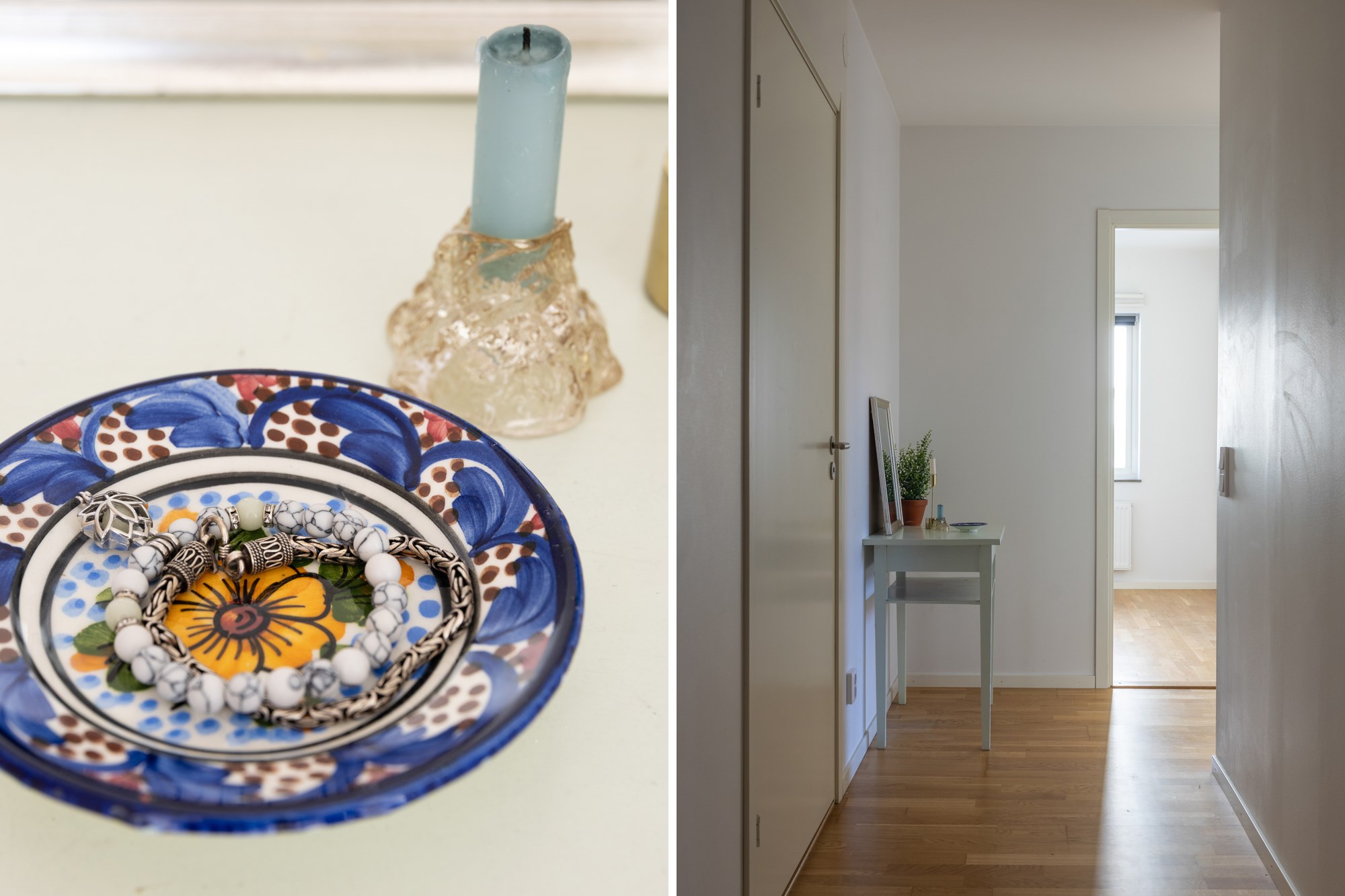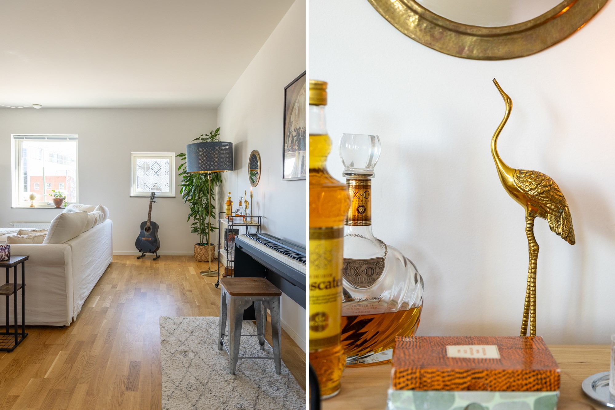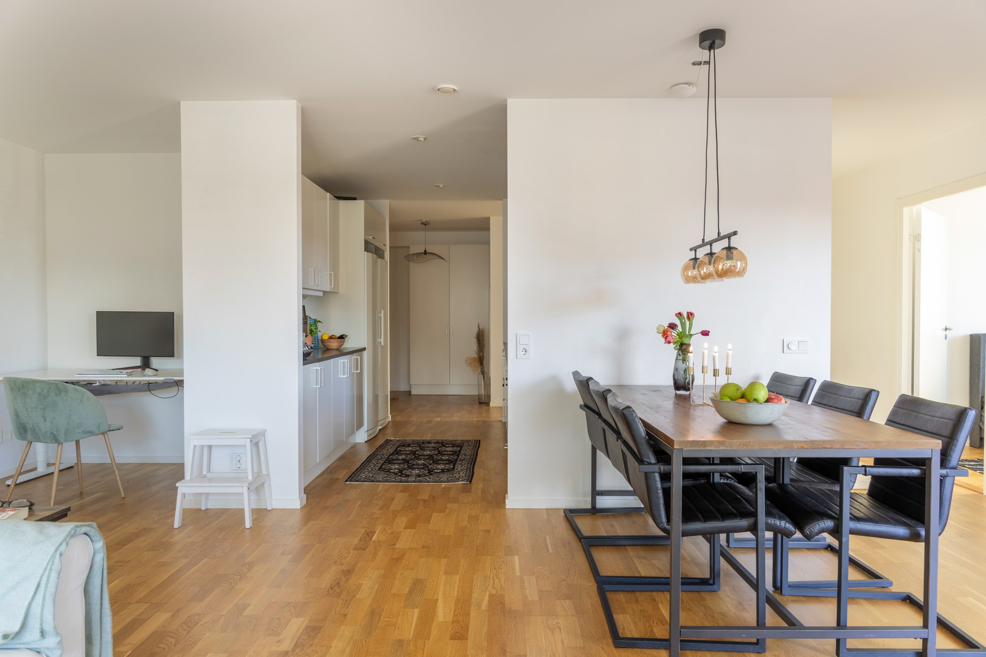 Parkettgolv och ljusa väggar.
