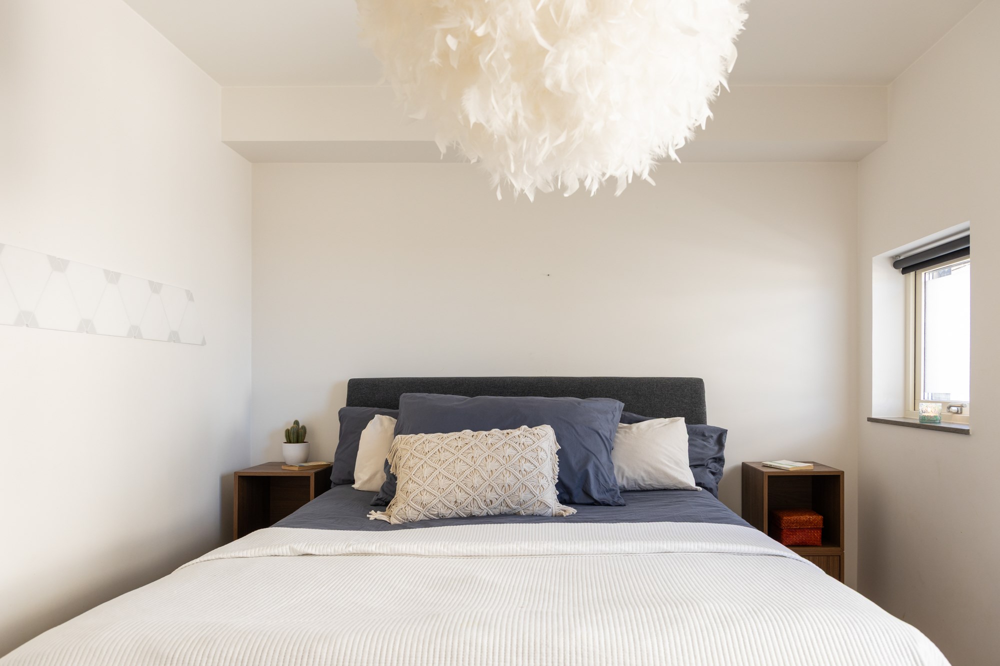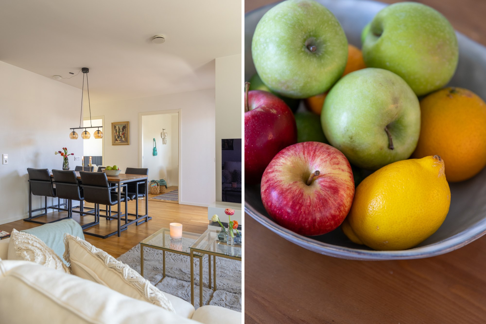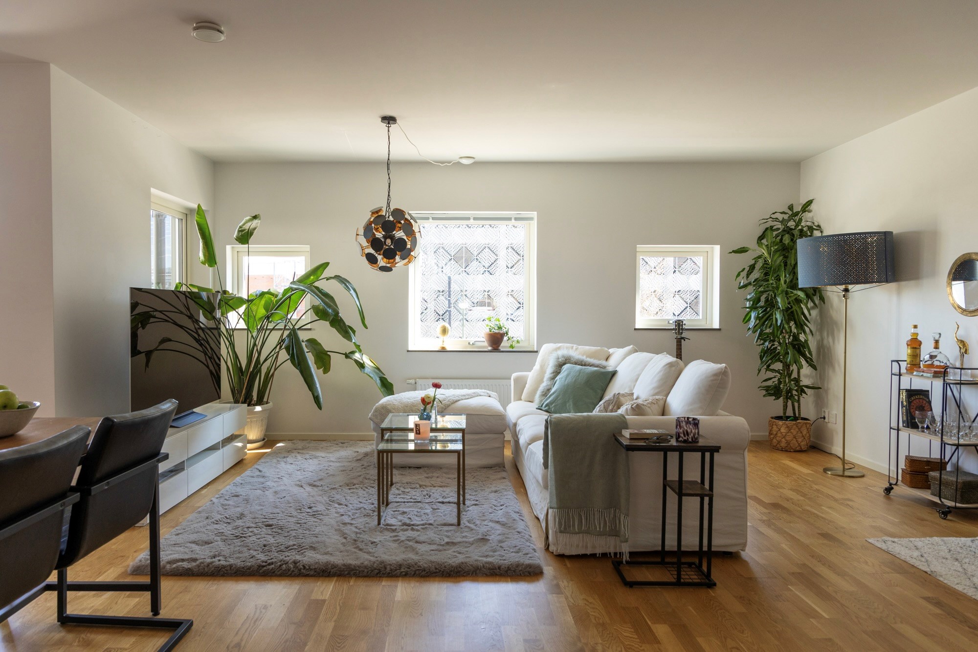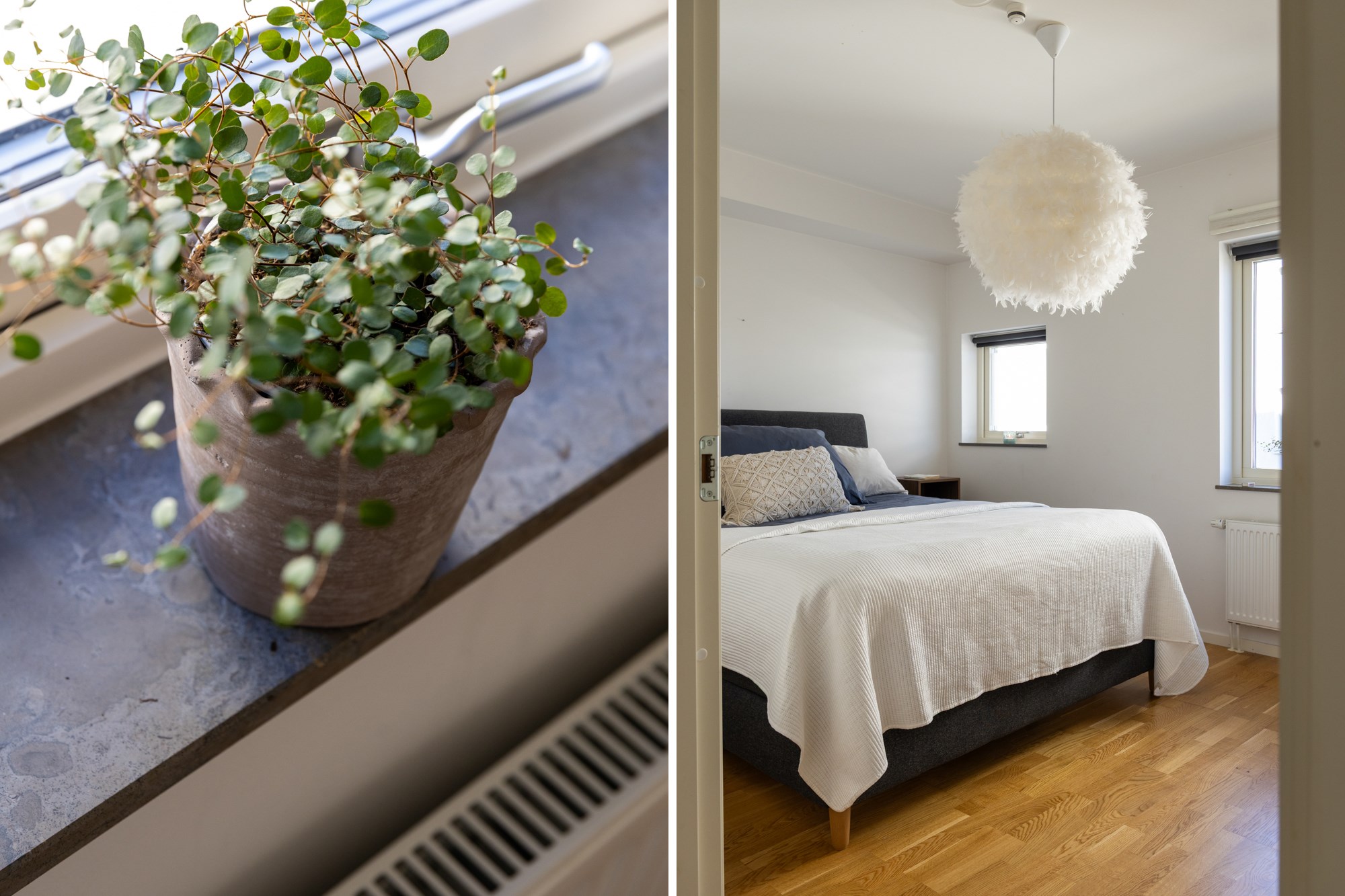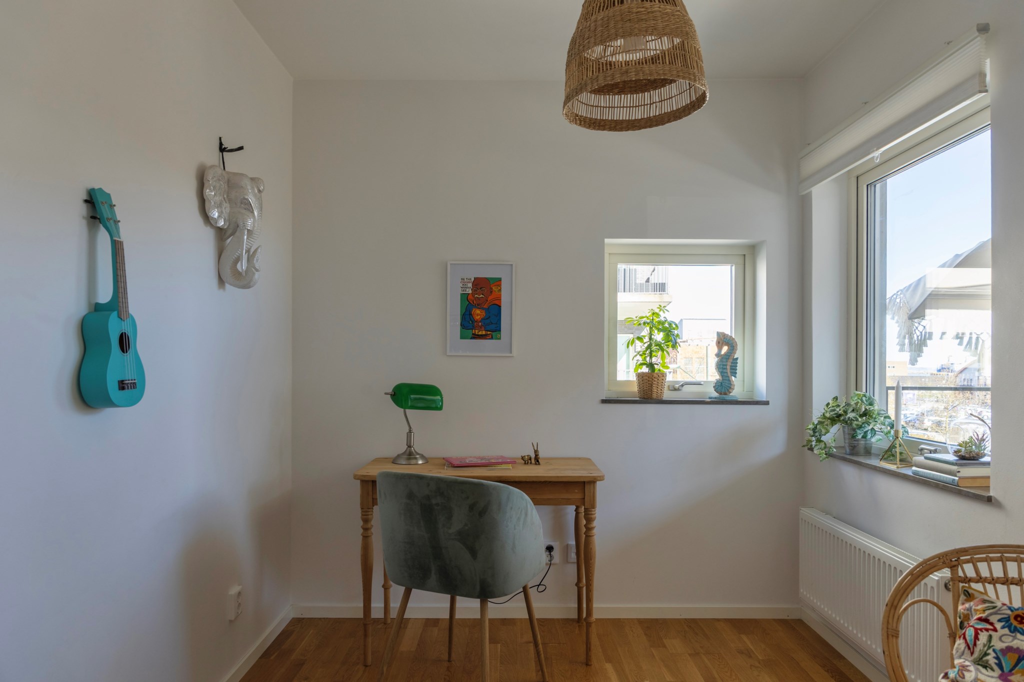 Parkettgolv och ljusa väggar.