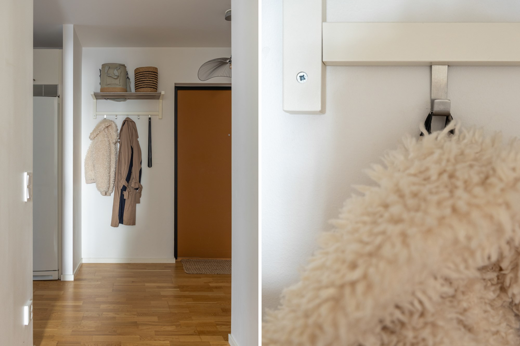 Parkettgolv och ljusa väggar. Plats för avhängning. Garderobsförvaring.