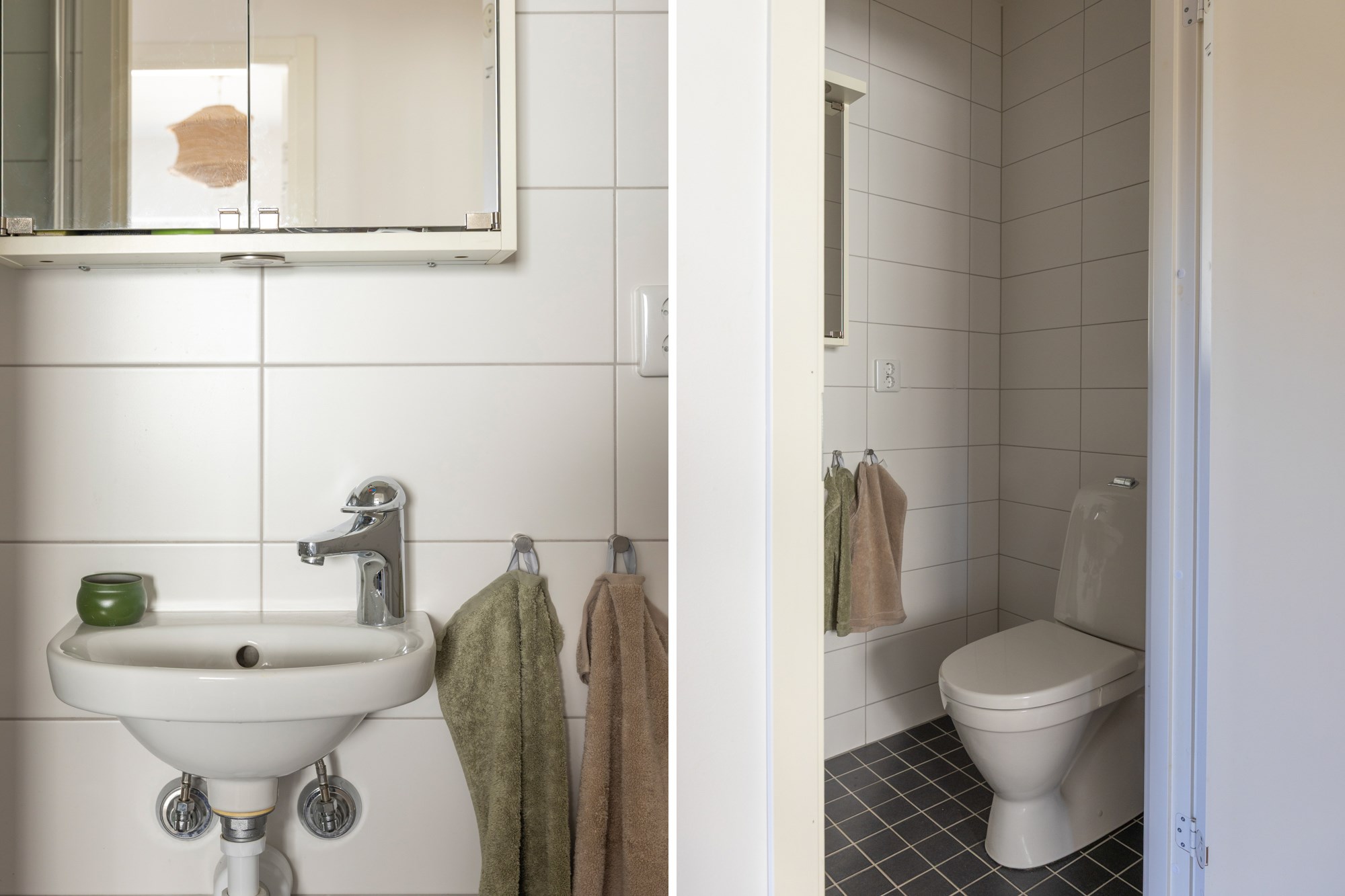 Helkaklat badrum. Grått klinker till golv och vita kaklade väggar. Utrustad med WC, handfat, spegelskåp och dusch.