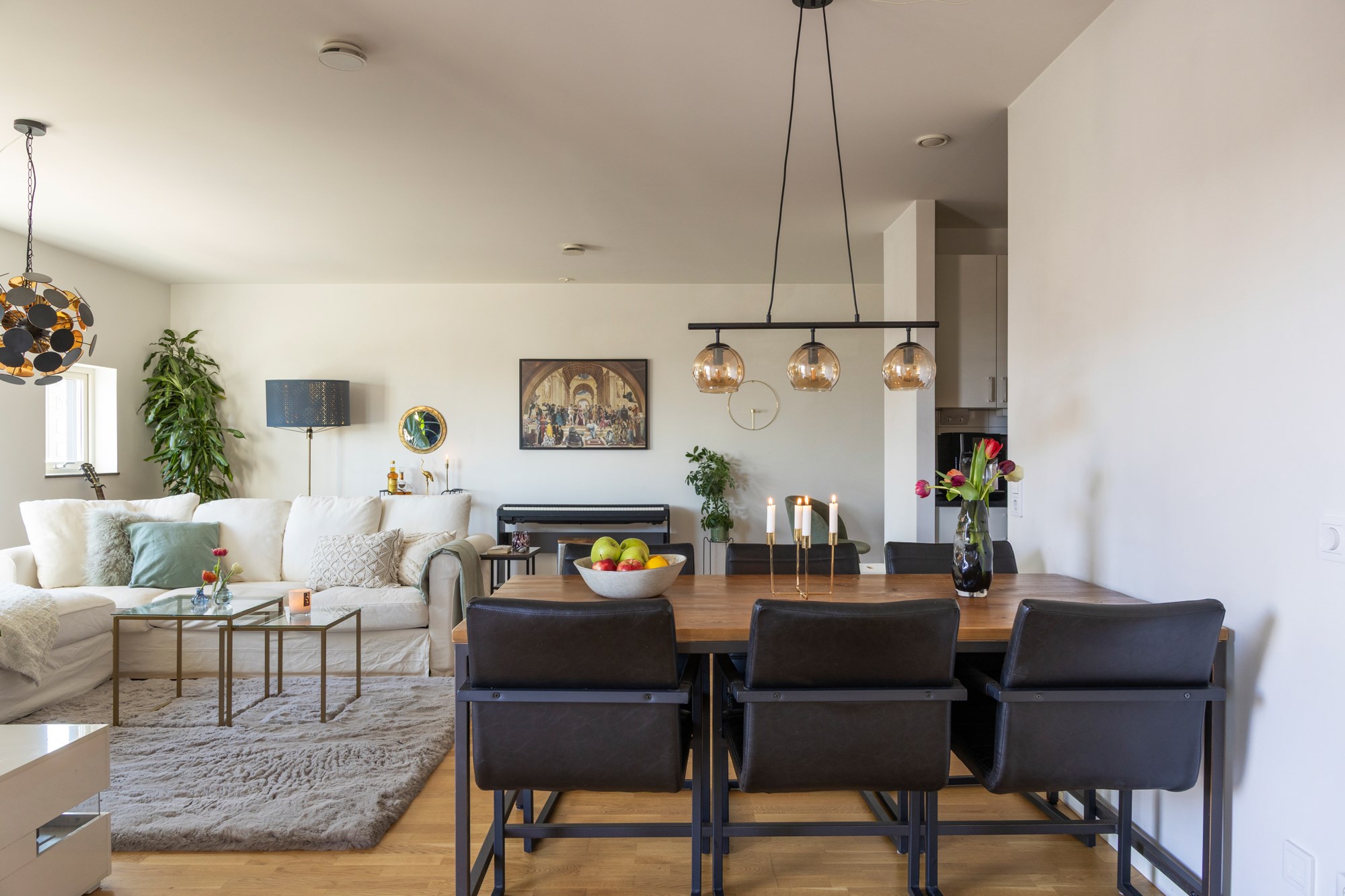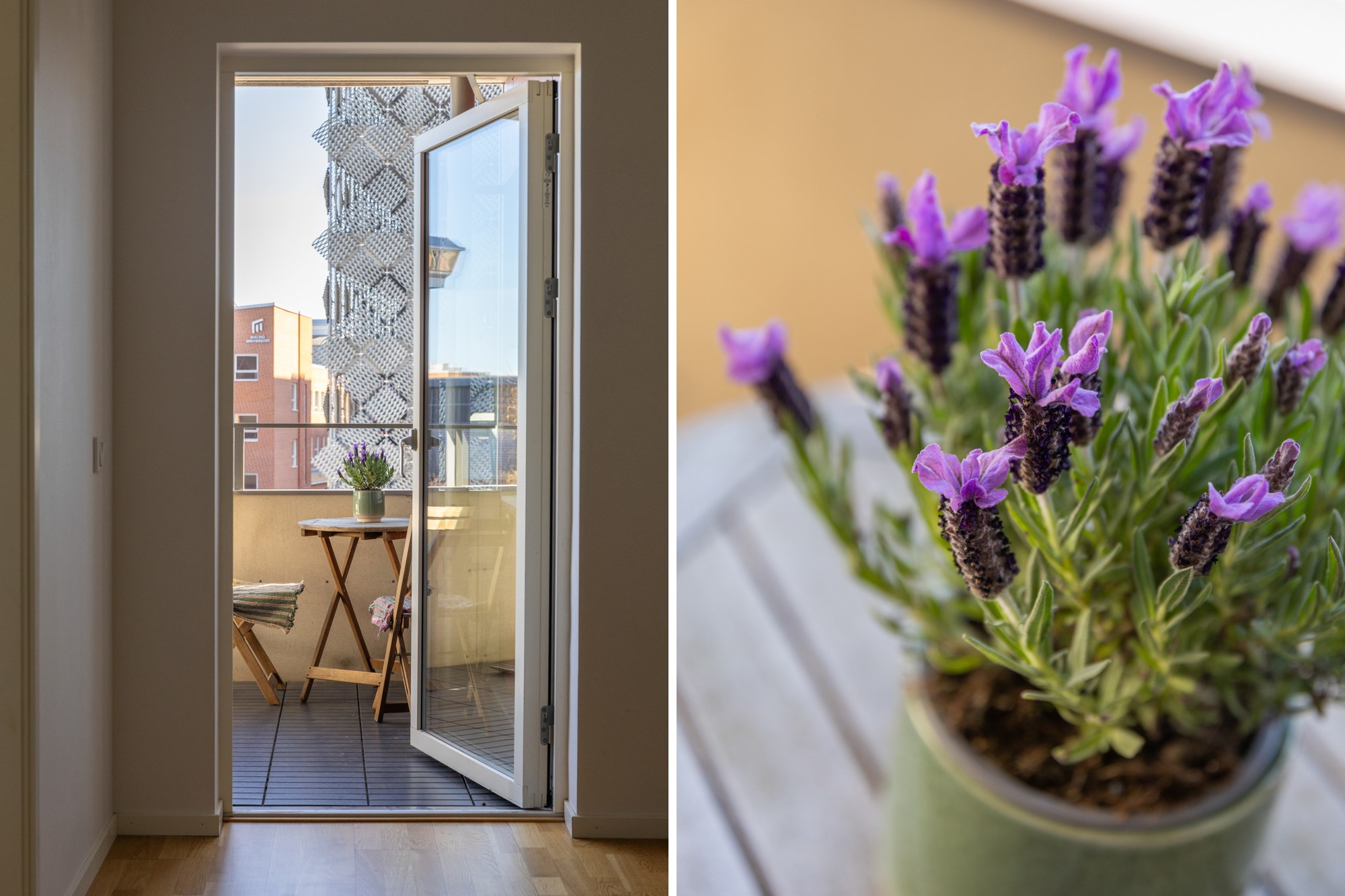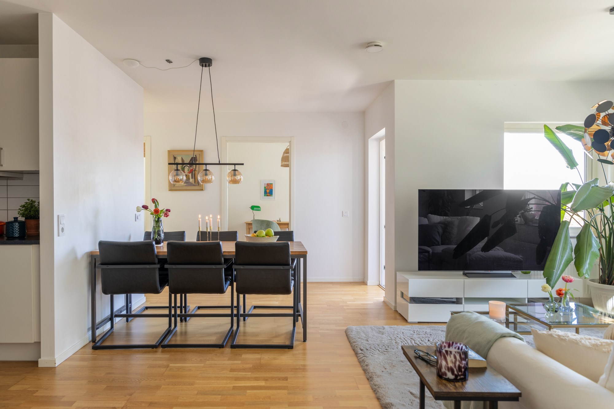 Parkettgolv och ljusa väggar. Plats för soffgrupp och matplats. Utgång till balkong.