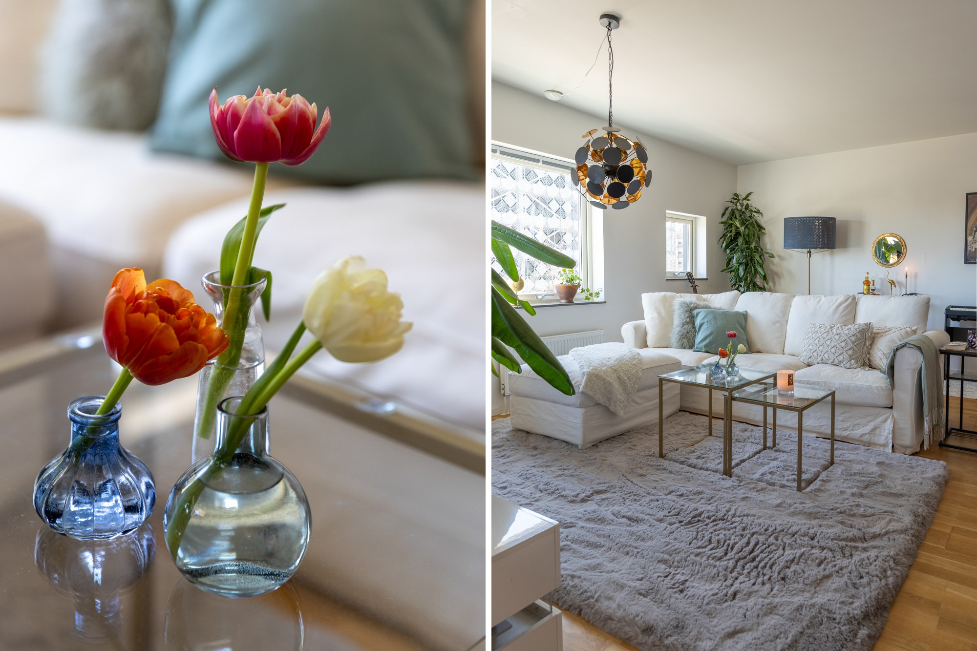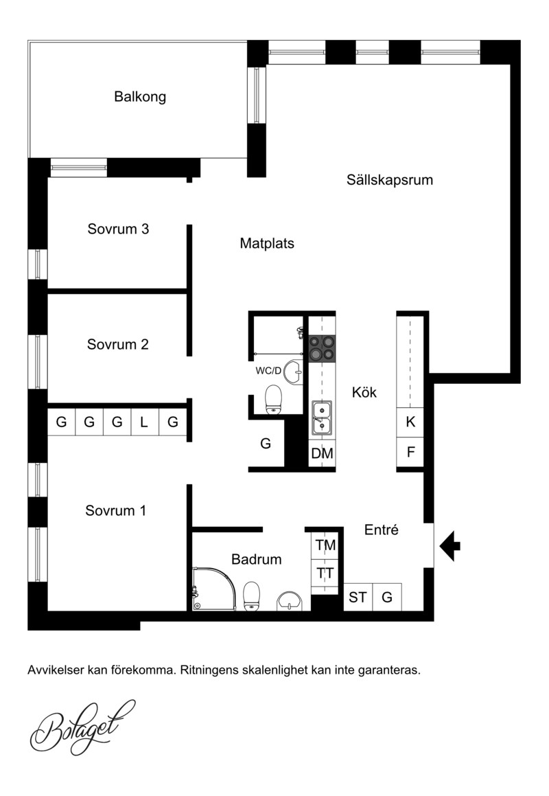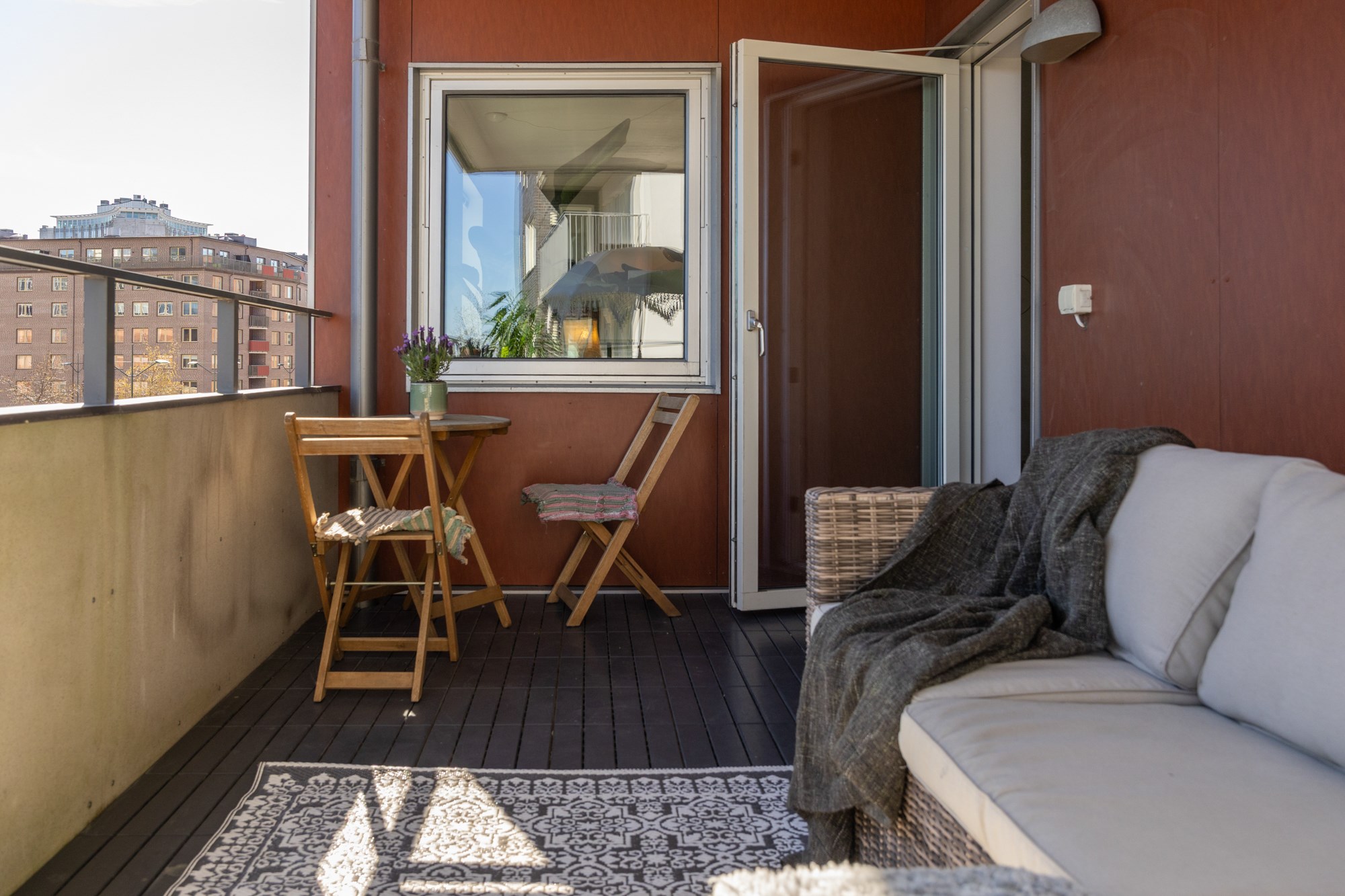 Parkettgolv och ljusa väggar. Plats för soffgrupp och matplats. Utgång till balkong.