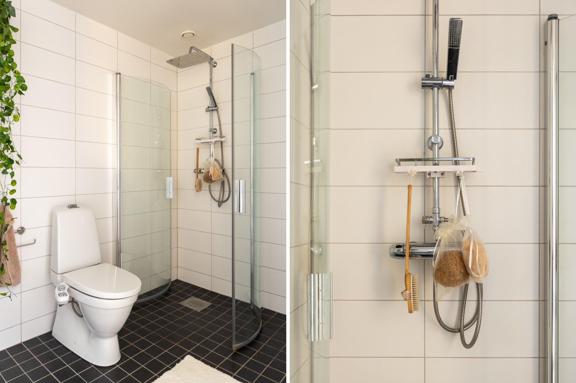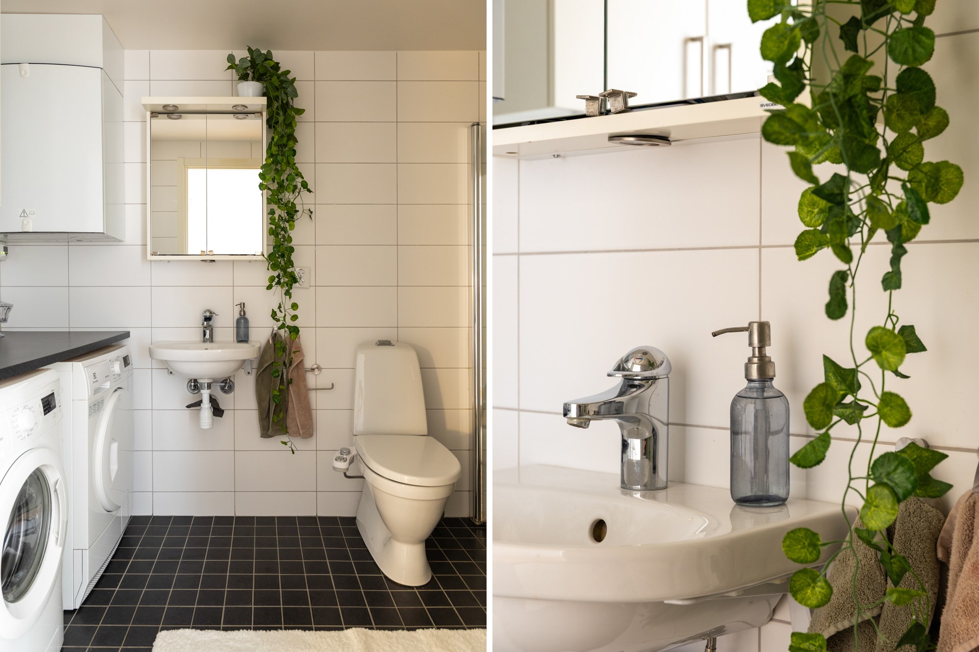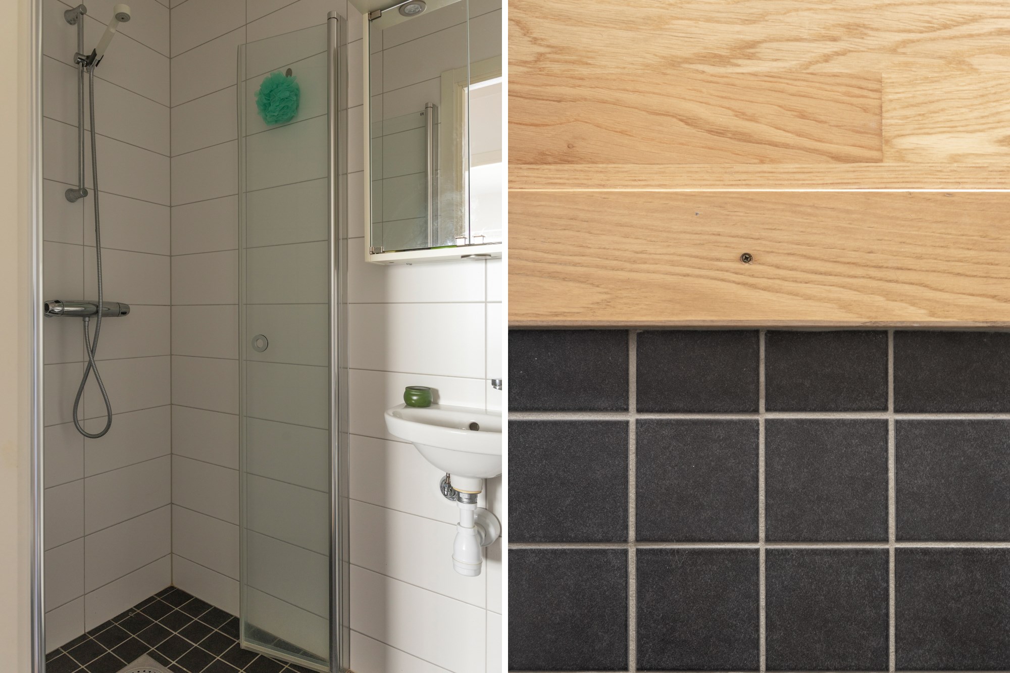Helkaklat badrum. Grått klinker till golv och vita kaklade väggar. Utrustad med WC, handfat, spegelskåp, dusch, tvättmaskin och torktumlare med arbetsbänk ovan.