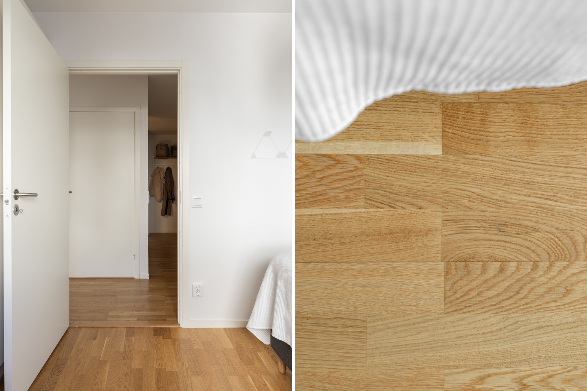 Parkettgolv och ljusa väggar. Garderobsförvaring.