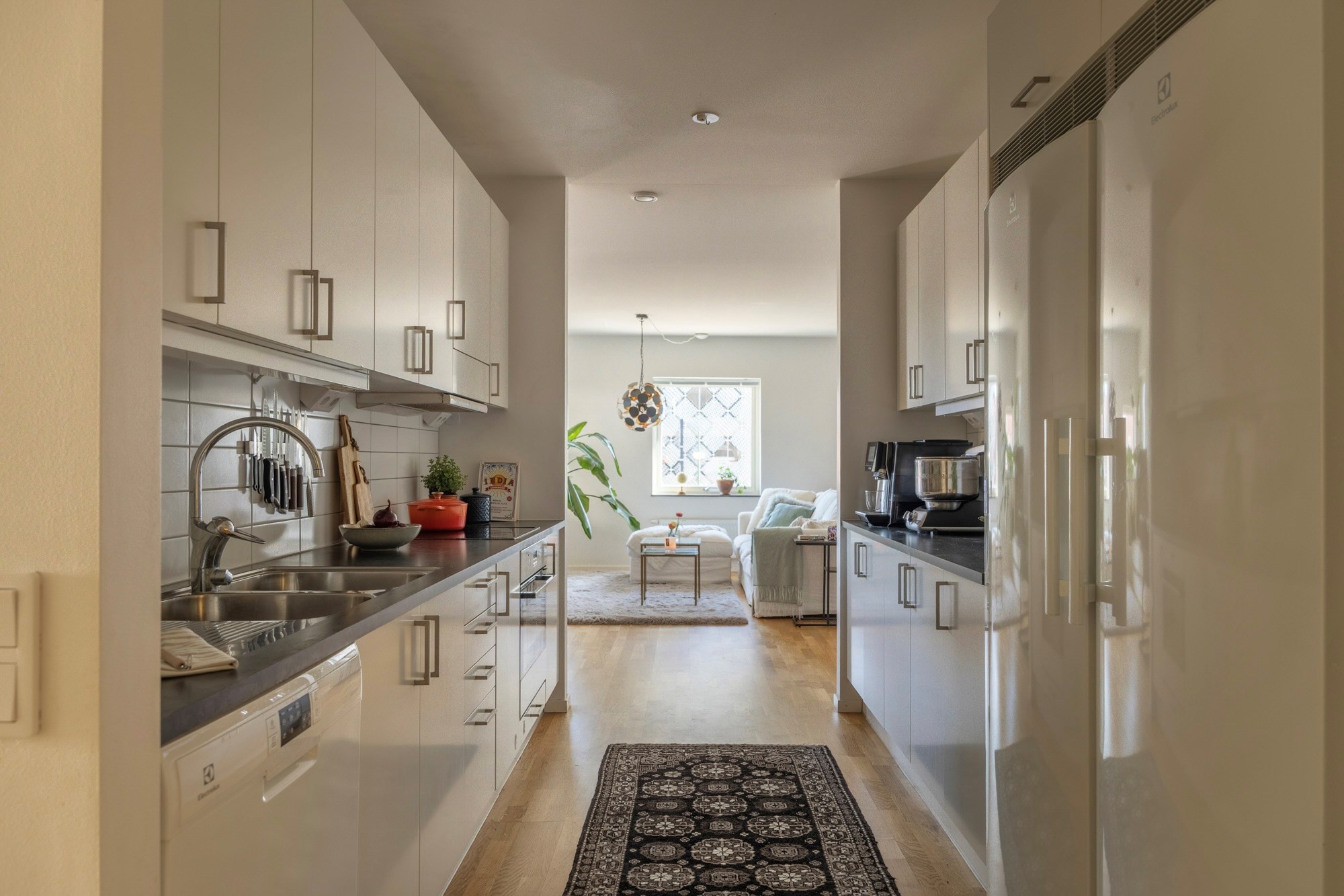 Parkettgolv och ljusa väggar. Vit köksinredning. Maskinell utrustning i form av induktionshäll och fläkt, ugn, diskmaskin, hel kyl och hel frys.