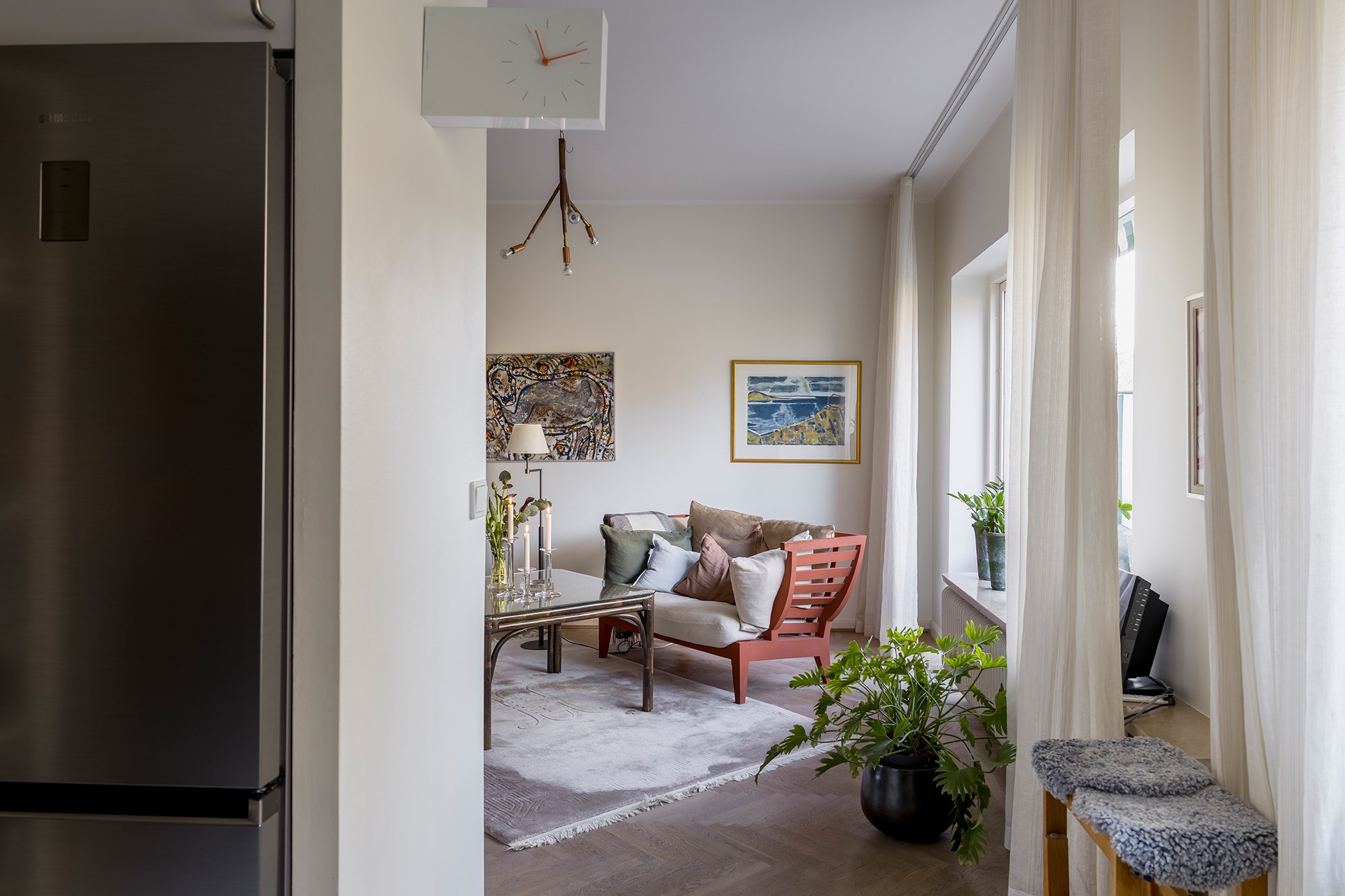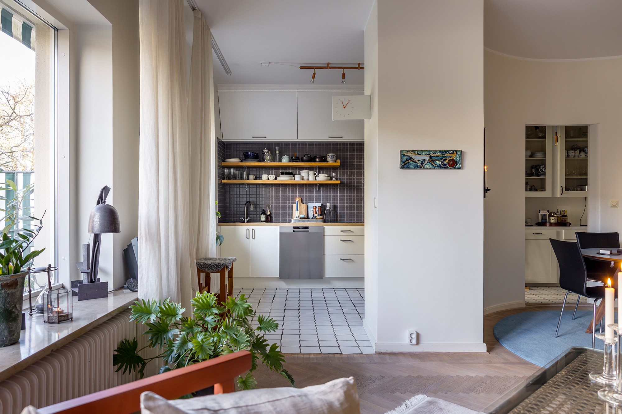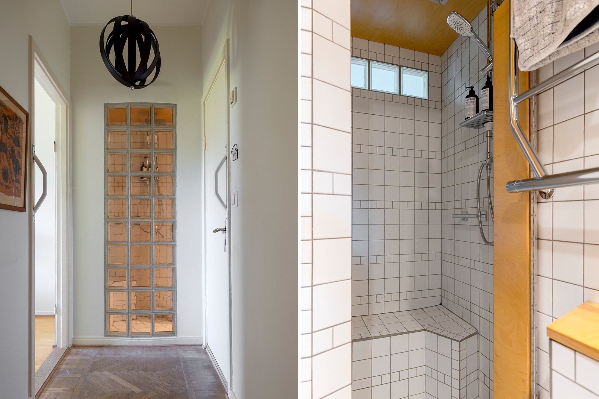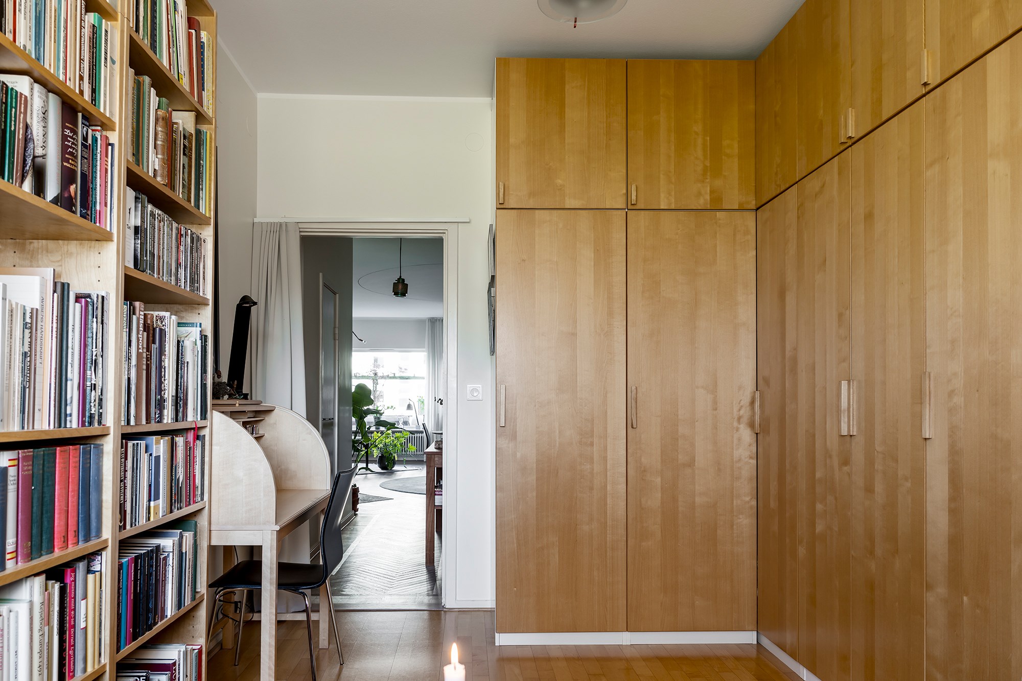 Parkettgolv och vita väggar. Goda förvaringsmöjligheter i garderober.