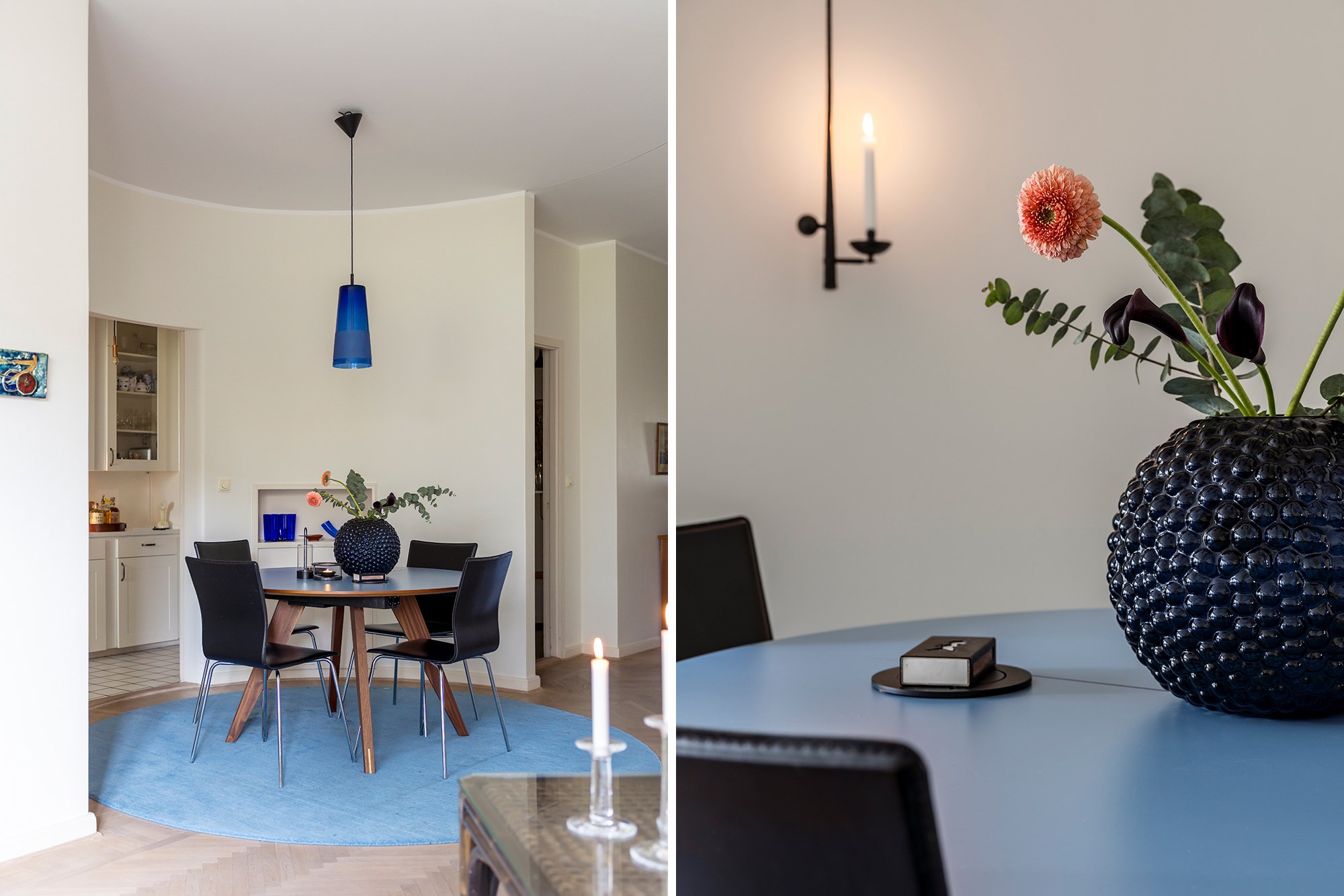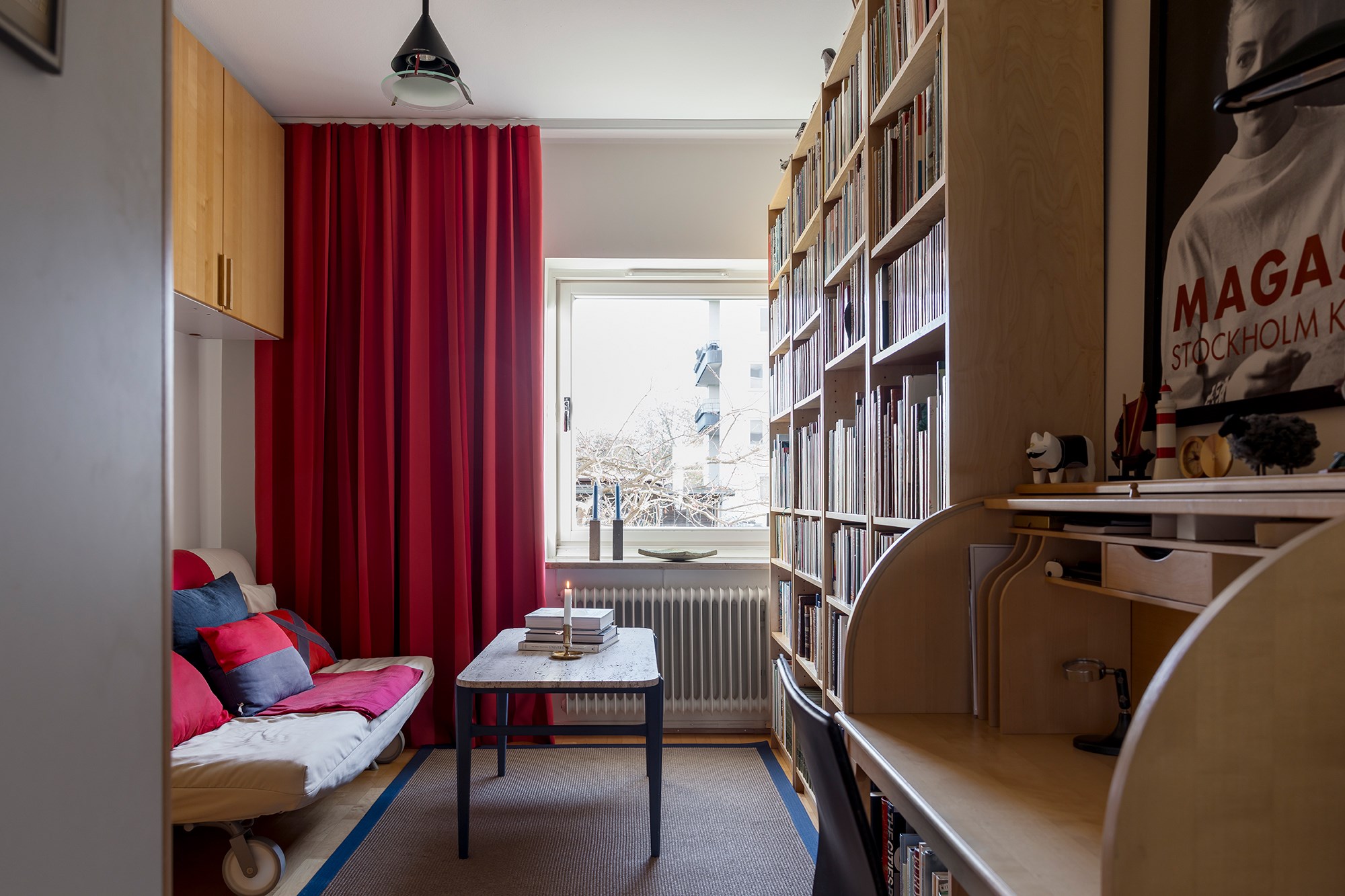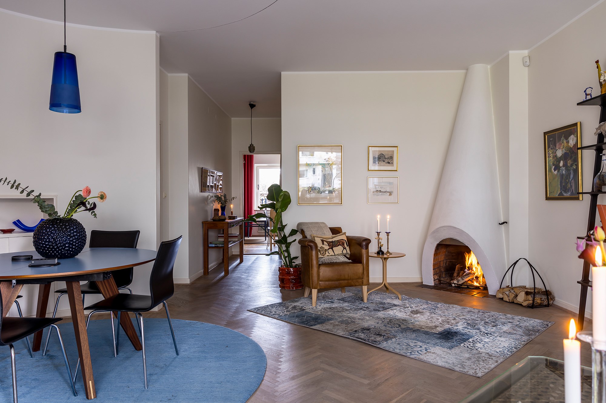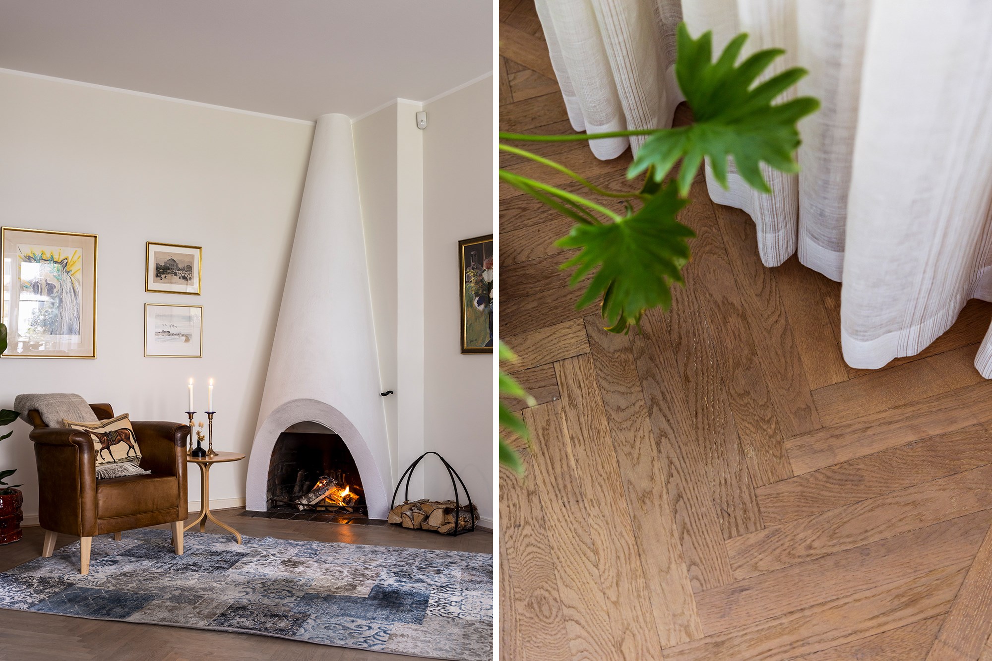 Mycket generöst sällskapsrum med klassiskt välvda väggar vid matplatsen. Fiskbensparkett och släta vita väggar. Stora fönsterpartier mot väster och utgång till uteplats. Fungerande öppen spis.