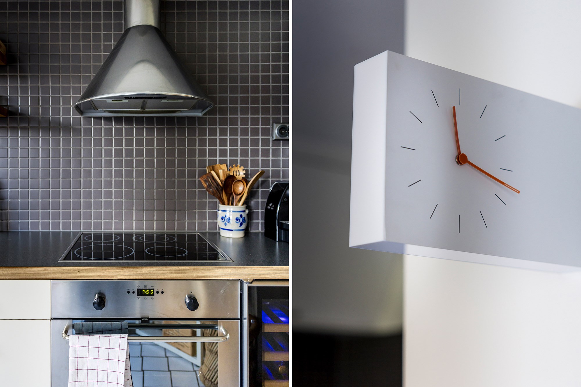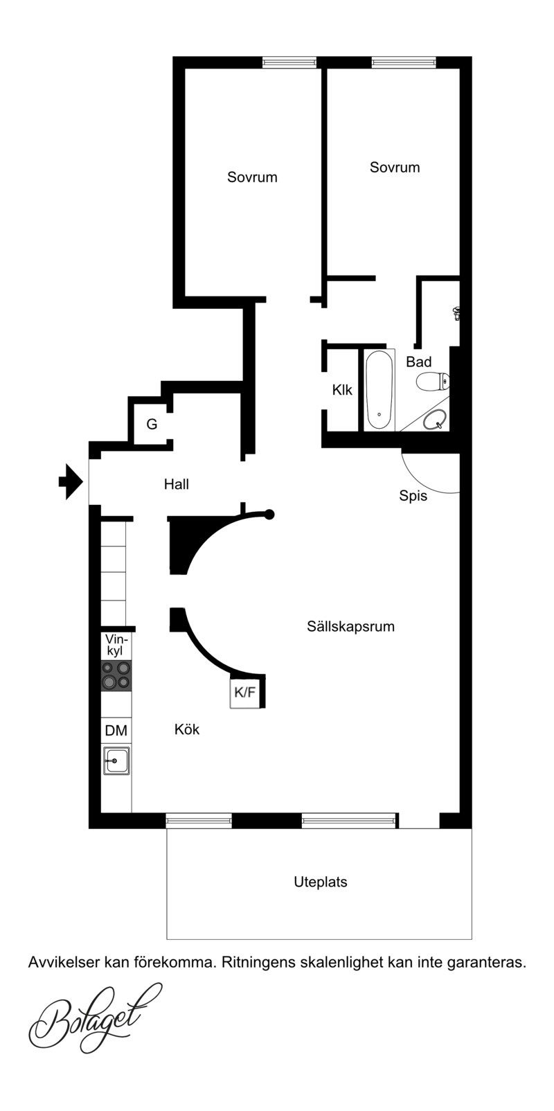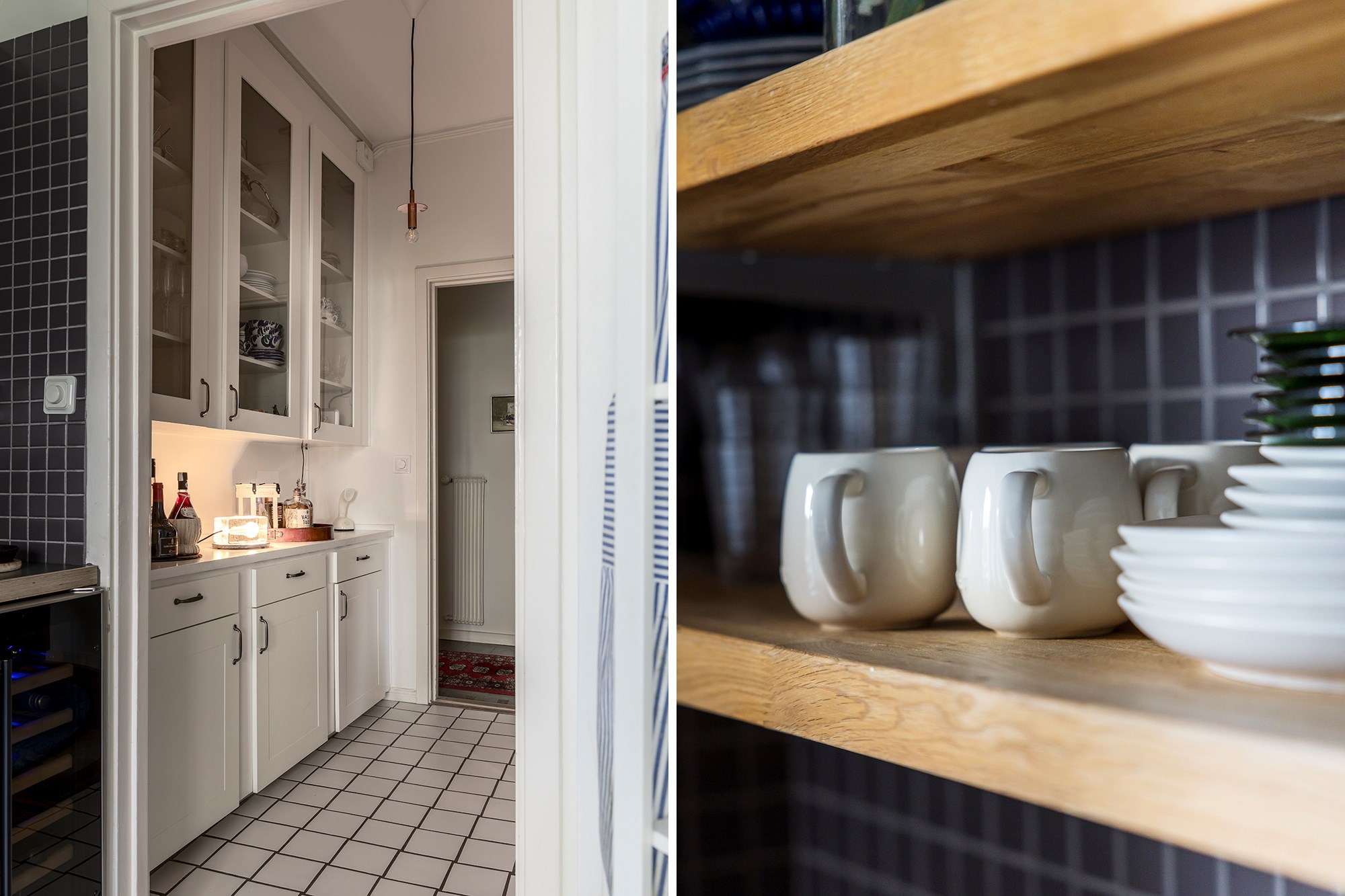 Klinkergolv och vita väggar. Vit köksinredning och grå bänkskiva. Maskinell utrustning i form av kyl/frys, diskmaskin, spishäll, ugn, fläkt och vinkyl. Via köket nås hallen genom serveringsgång samt sällskapsrummet.
