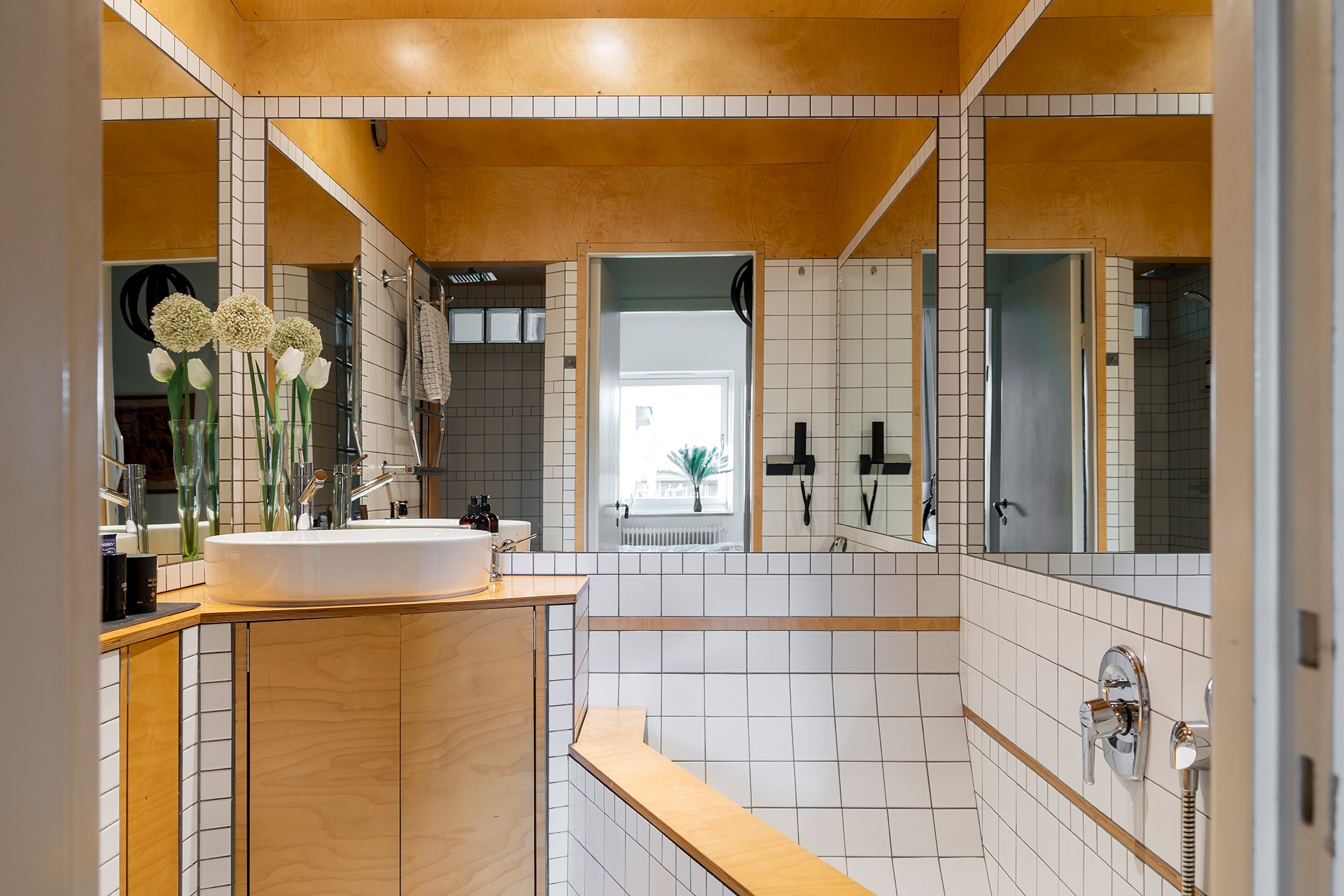 Kaklat badrum med trädetaljer. Utrustat med badkar, WC , dusch, handfat med kommod och handdukstork.