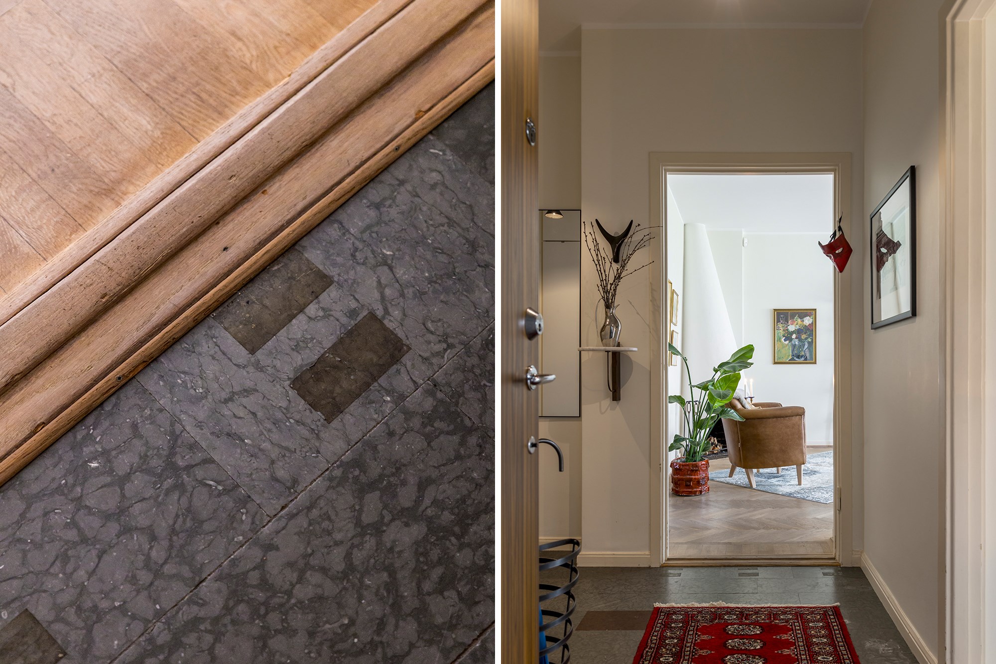 Kalkstensgolv och släta vita väggar med goda avhängningsmöjligheter. Från hallen nås bland annat kök och sällskapsrum.