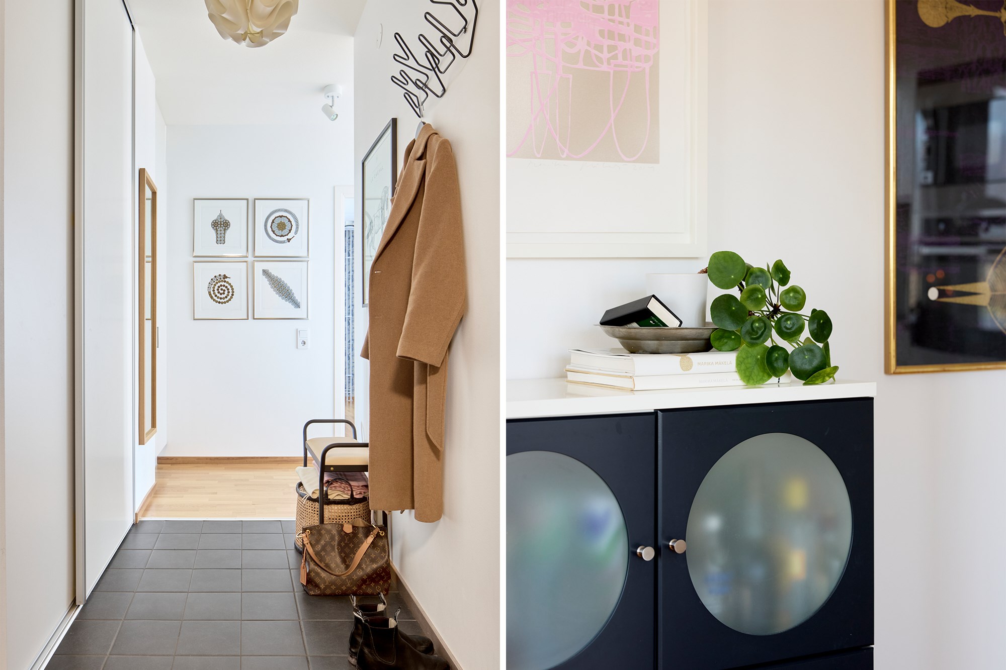 Mörk klinker till golv och ljusa väggar. Plats för avhängning. Garderobsförvaring med skjutdörrar.