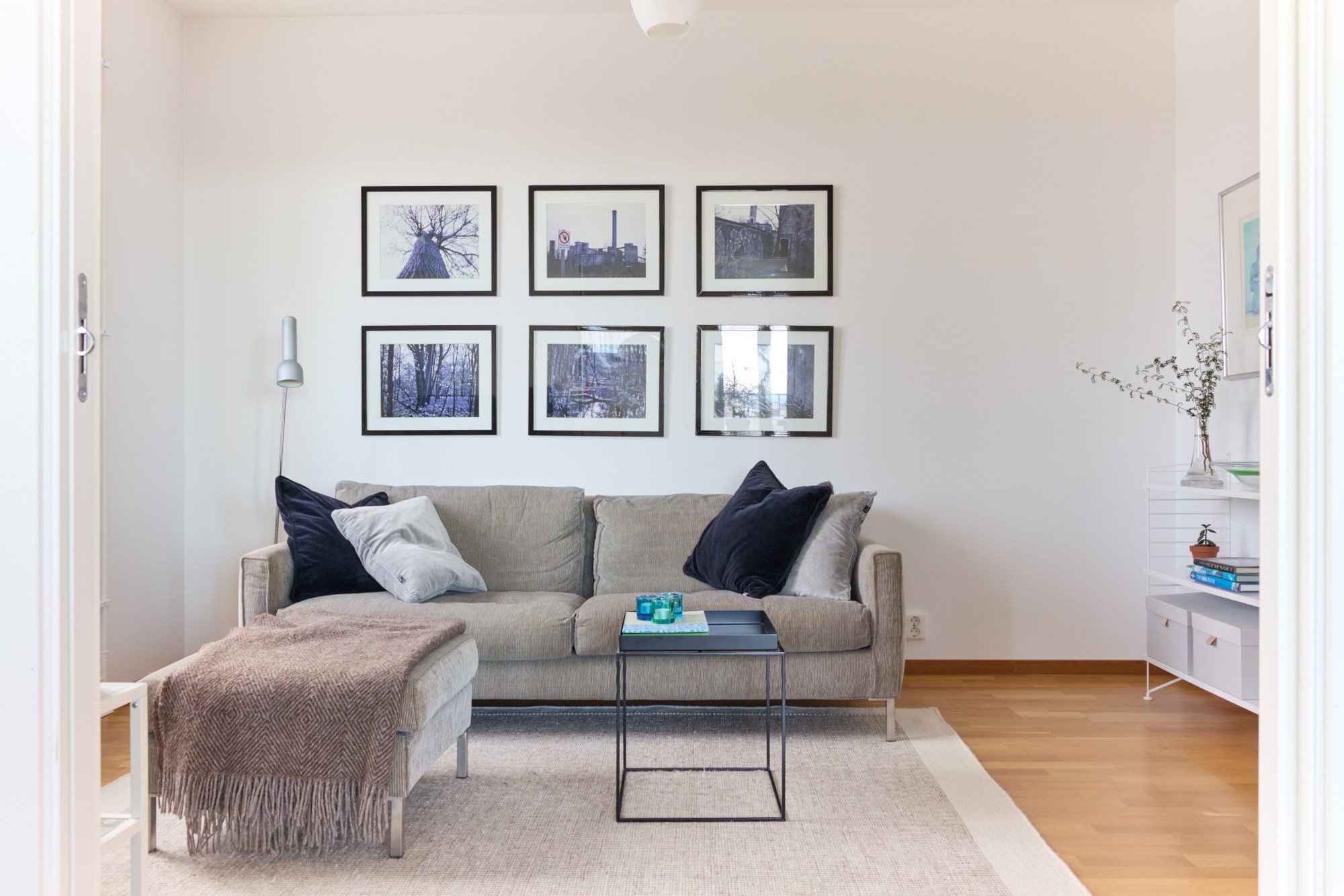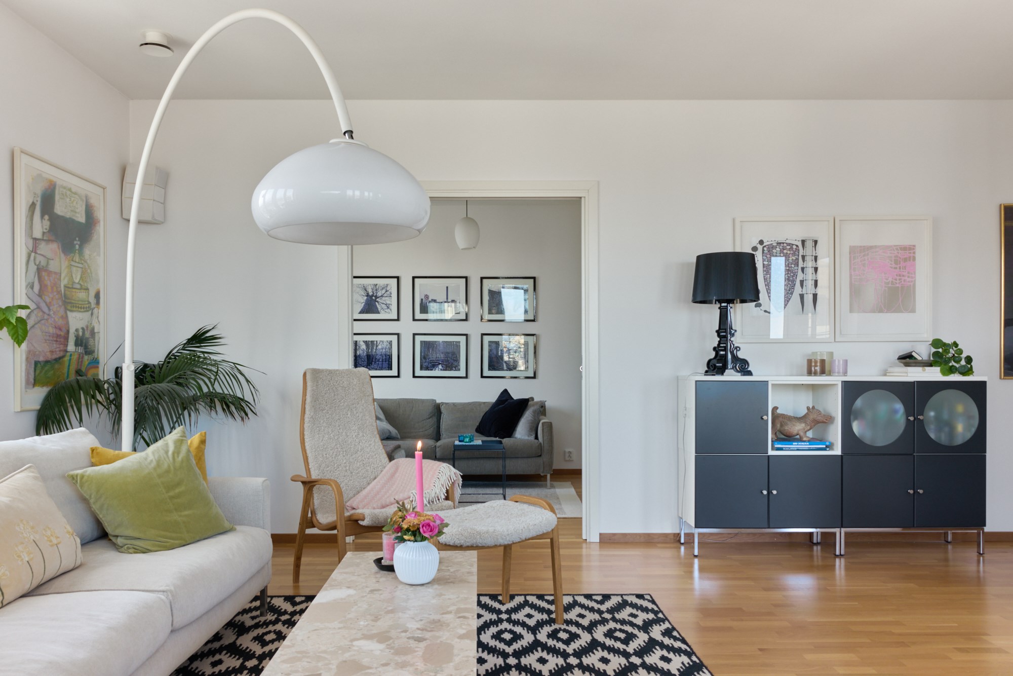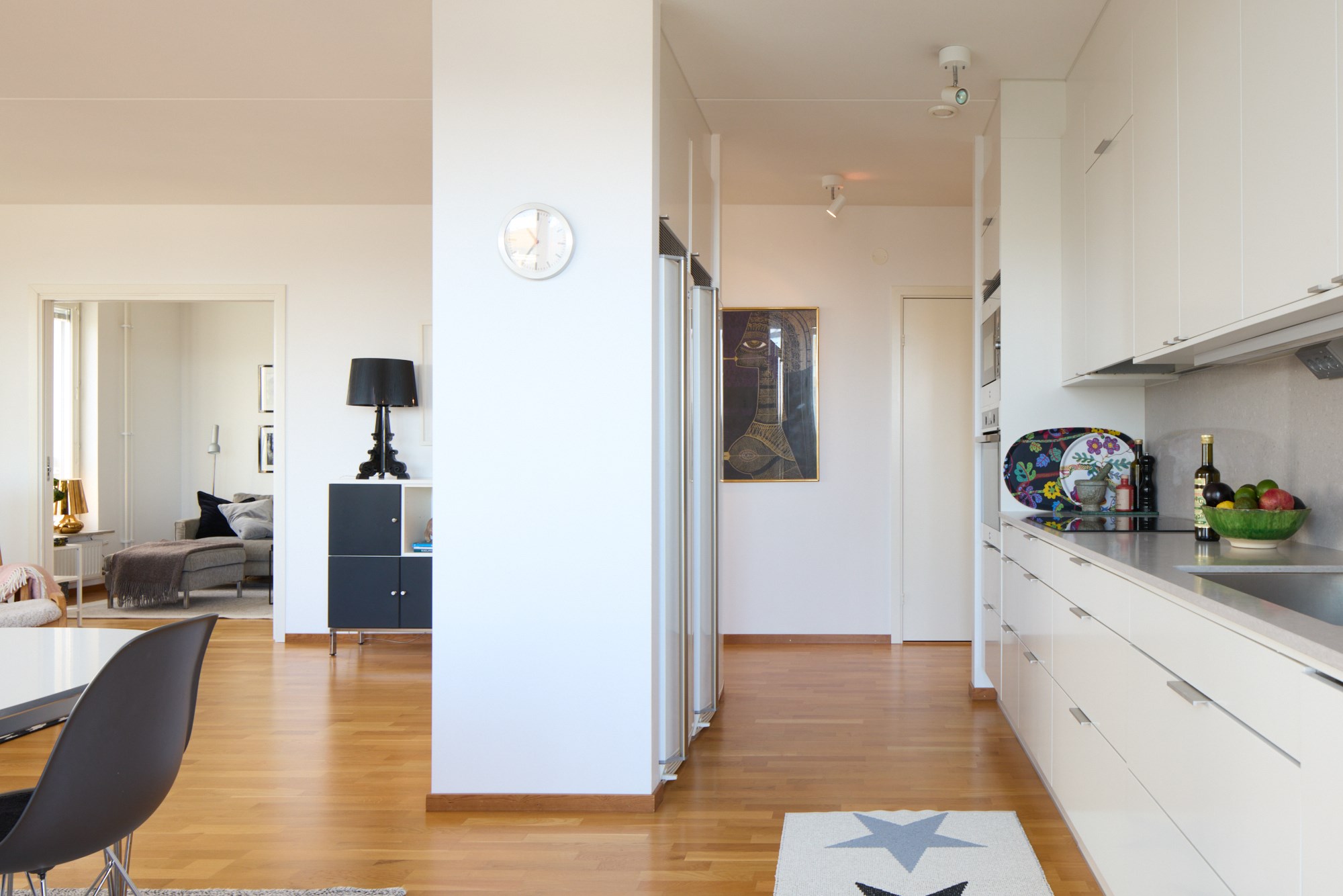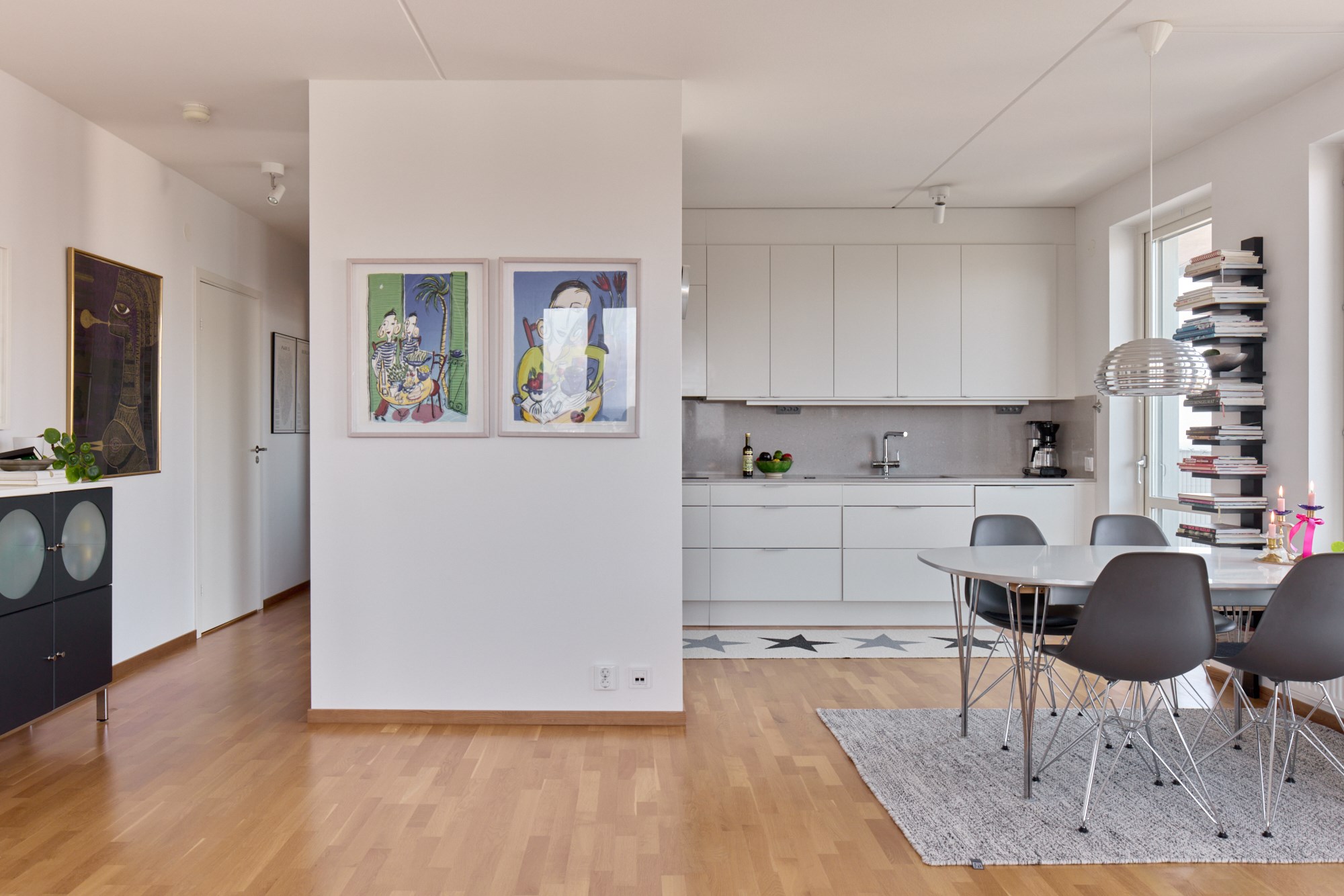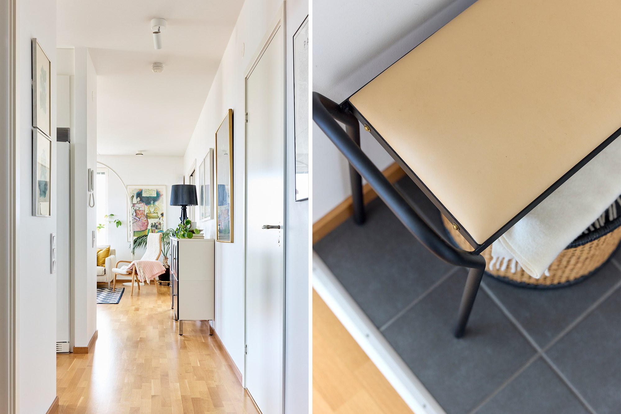 Parkettgolv och ljusa väggar.