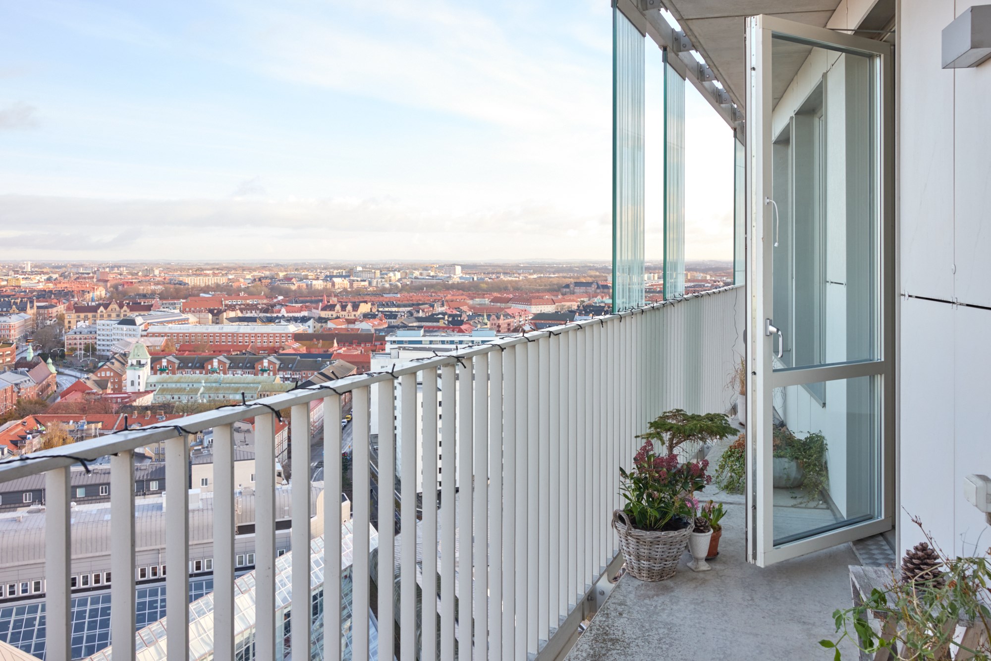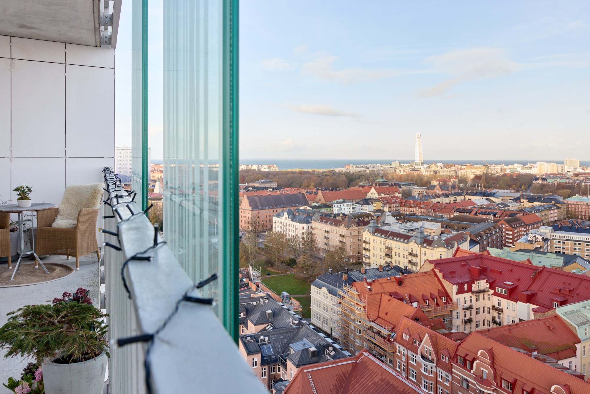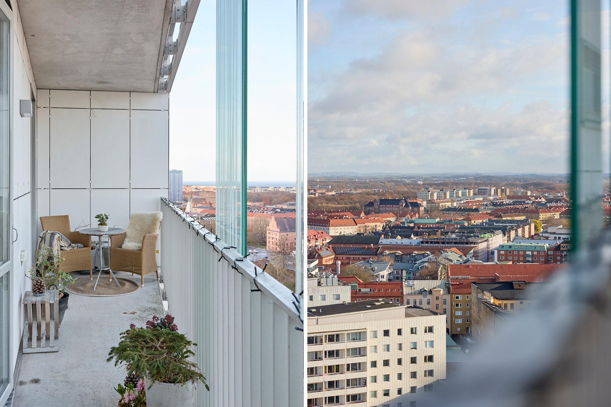 Med vy över hela Malmö innerstad och vidare över hav och skånska landskap slår utsikten från 18 våningen på Rådmansgatan det mesta. Staden har just vaknat för dagen, solens tidiga stålar färgar himlen och husens siluetter i mjuka pasteller. De utbredda parkerna har fått inslag av brända toner och himlen är oändlig. Här uppe tappar man lätt andan hur vackert Malmö är! Den ljusa våningen näst högst upp i huset är stilfullt och klassiskt inredd, vyerna är med en överallt. Här bor man mitt i city men högt ovan all puls och stress. Öppna 79 kvadrat är fördelade på tre rum och kök där ett fantastiskt sällskapsrum med integrerat kök har fönster i två väderstreck och plats för både soffgrupp och matsalsbord. Ett rum med skjutdörrar ligger i fil med sällskapsrummet, det kan användas till ett andra sovrum, gästrum eller en förlängning av stora rummet. I det stora sovrummet finns även här en utgång till balkongen. Kvällen bjuder på en glittrande stad med takåsar som möter himlen och sen övergår i hav med helt fri horisont. På innergården finns grillplatser och tillgång till två takterrasser i föreningen. Ta hissen ner till garaget, pendlingen blir enkel då Triangelns tågstation med Citytunneln ligger utanför porten. Det moderna huset ligger vid slutet av gågatan omringad av anrika fastigheter från början av 1900-talet och på torget intill ligger den pampiga S:t Johannes kyrka. Varmt välkommen till en exklusiv cityvåning med oslagbar utsikt!