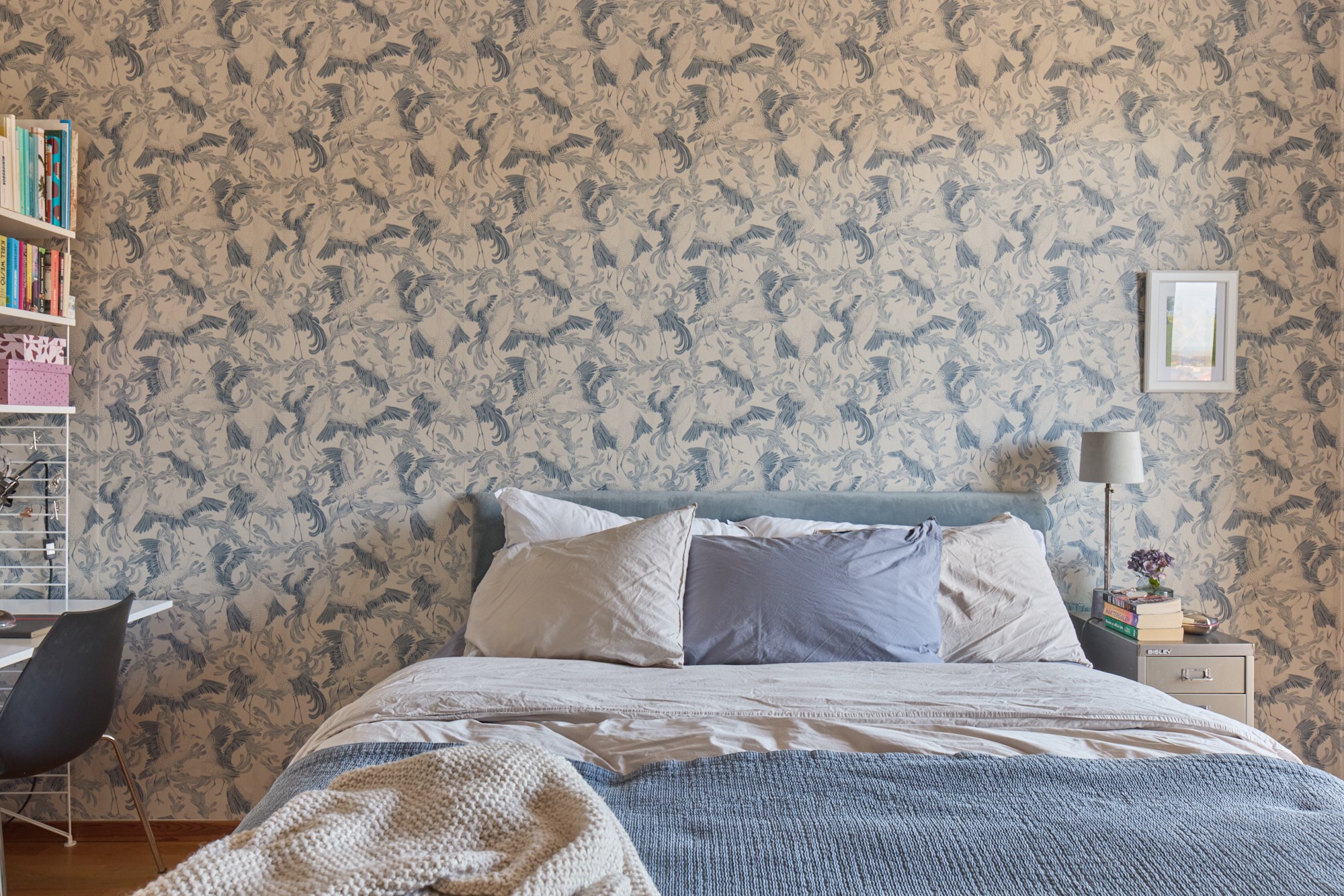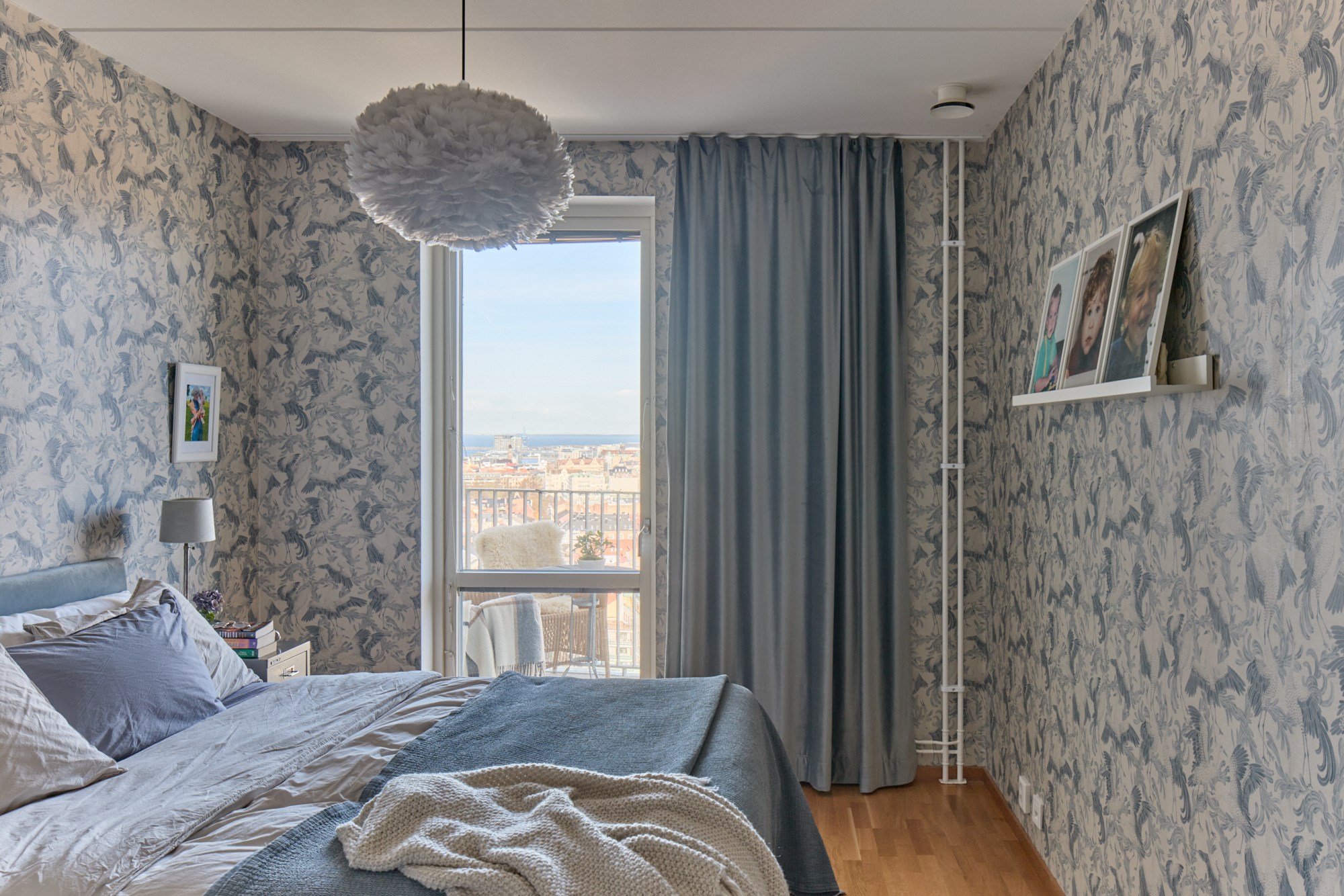 Parkettgolv och mönstrad tapet. Utgång till balkong.
